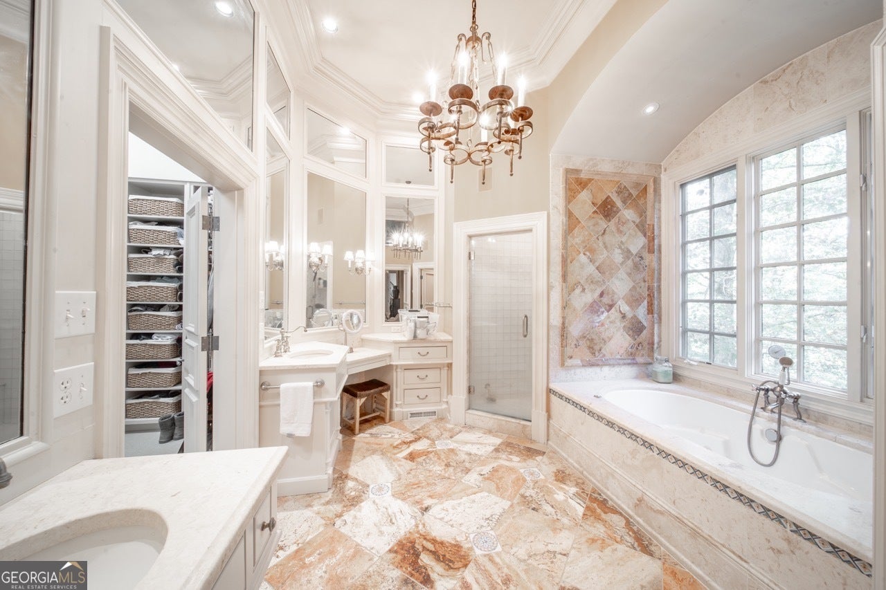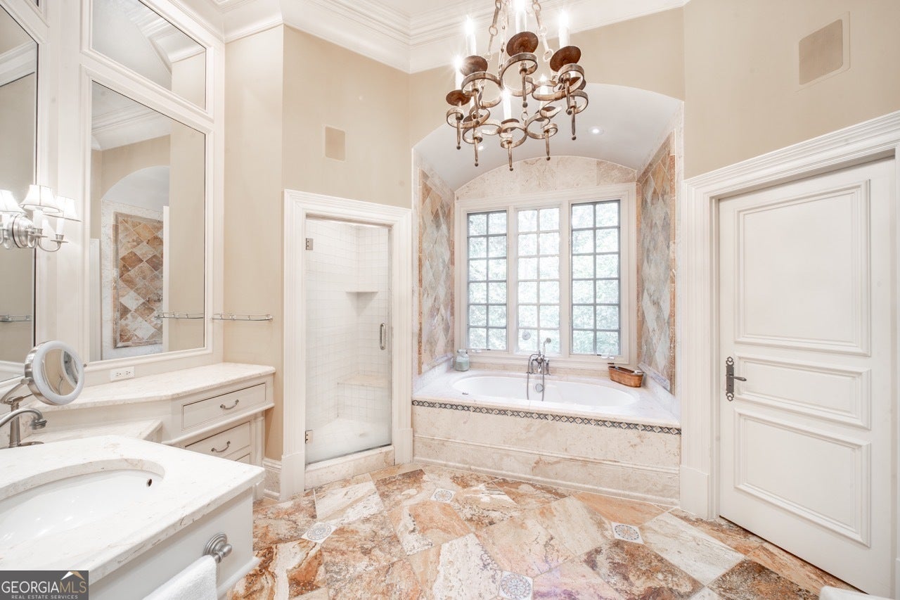 - Interior FeaturesBeamed Ceilings, Bookcases, Double Vanity, High Ceilings, Master On Main Level, Separate Shower, Soaking Tub, Tile Bath, Tray Ceiling(s), Vaulted Ceiling(s), Walk-In Closet(s), Wet Bar