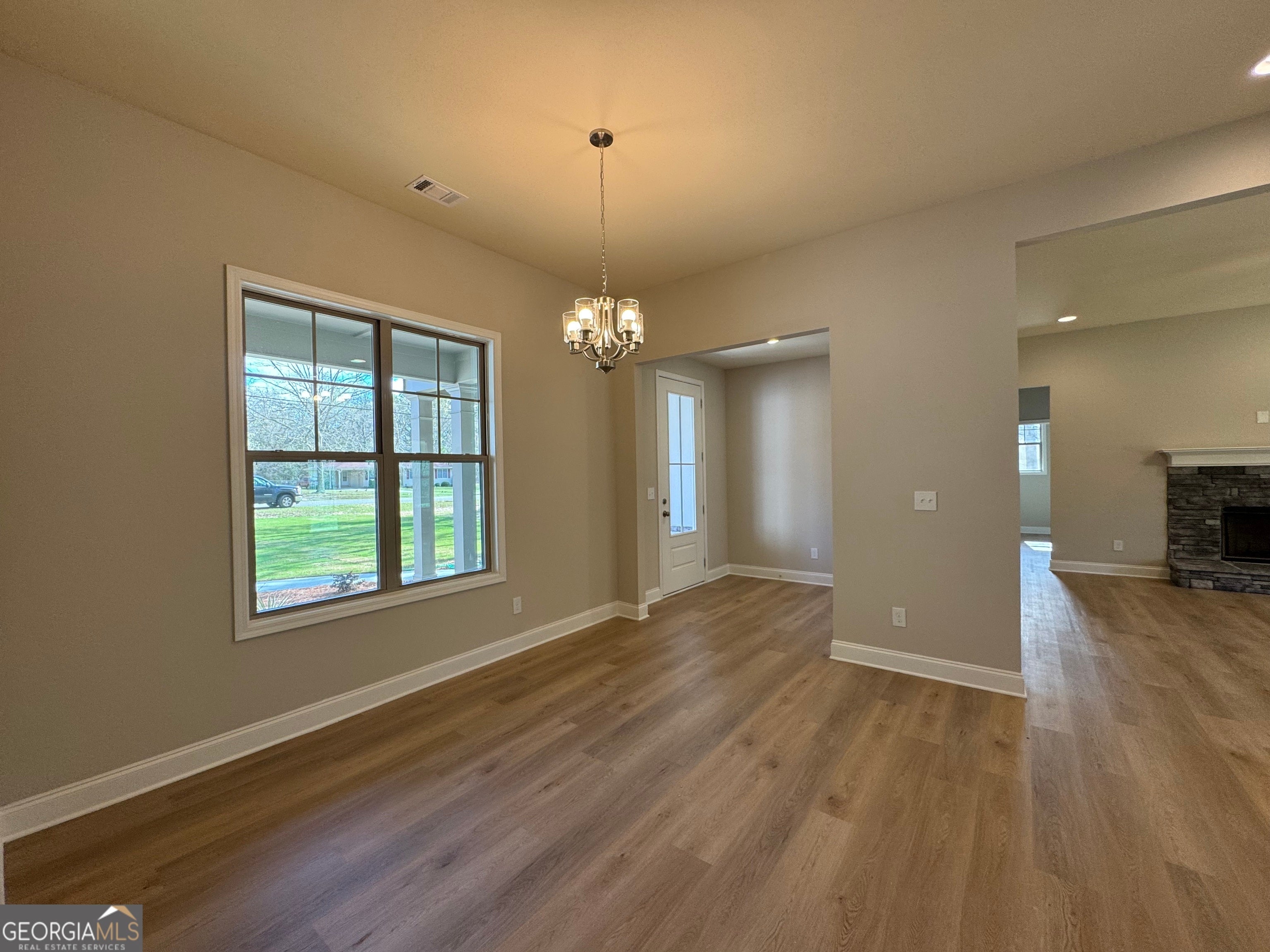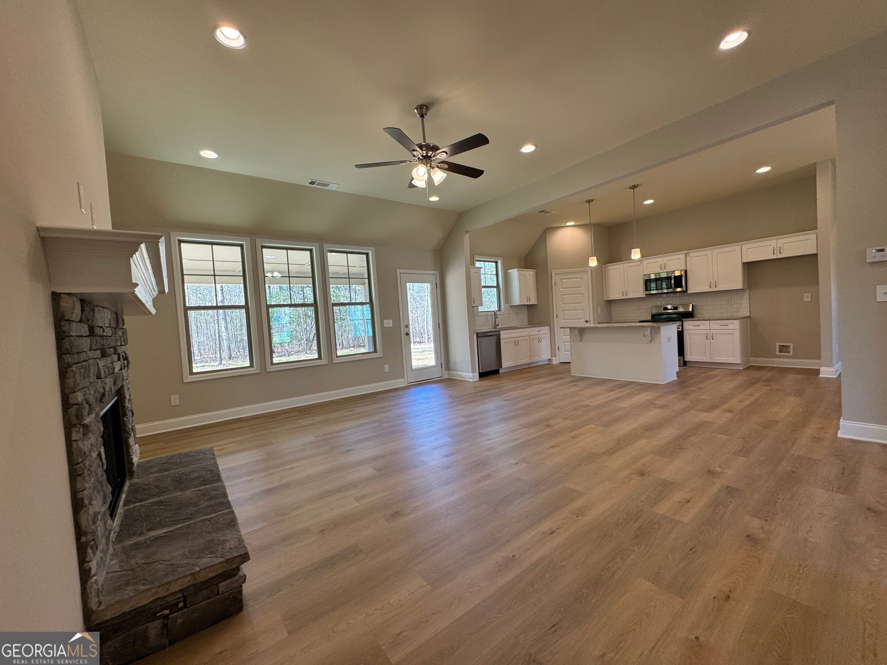 $13K incentive with preferred lender! New build- under construction - 90% complete. Check out the massive covered back patio on this Open concept 4 bedrooms, 2 bathrooms home with 2 car garage. Spacious ranch home in an established neighborhood on a large lot. SPC "wood" plank flooring is durable, waterproof and scratch resistant. Walk in to the foyer that leads to huge family room with wood burning fireplace, open to large kitchen with shaker cabinets, island, granite counter tops and stainless steel appliances, formal dining room could be home office or playroom. Huge primary suite with spacious walk-in closet, en suite bathroom with separate double vanities, separate shower and garden tub. 3 additional bedrooms and full bathroom with double vanity. Hardi board concrete siding and Architectural shingles. Home is Under Construction - Expected completion in February. Photos are of this same plan previously built.
