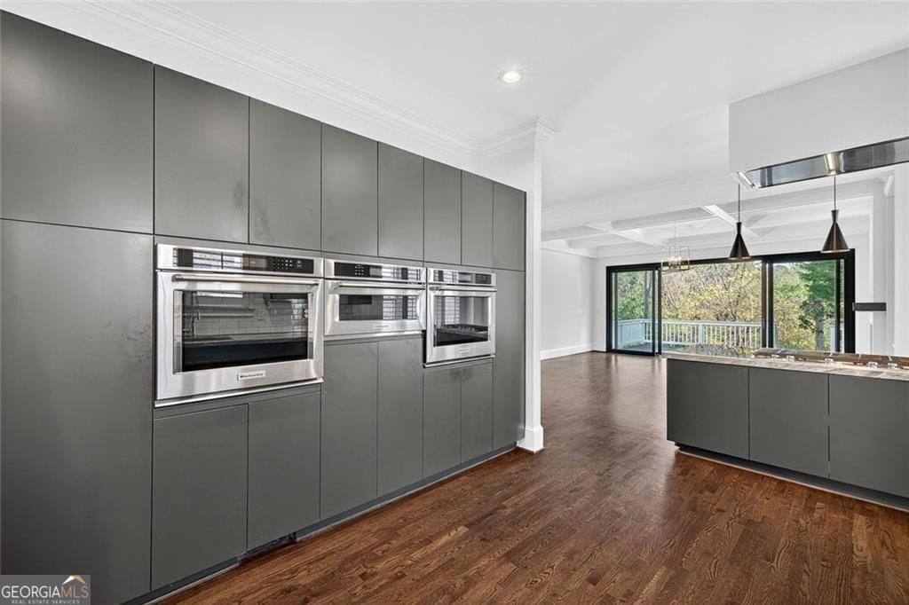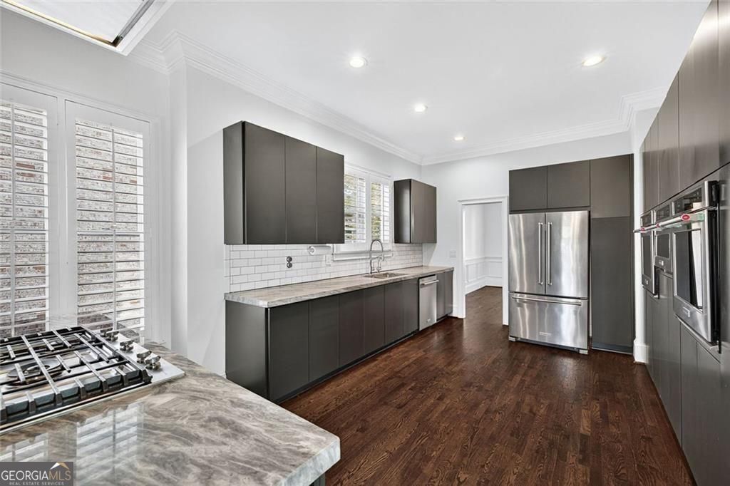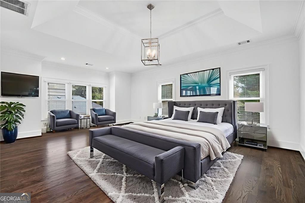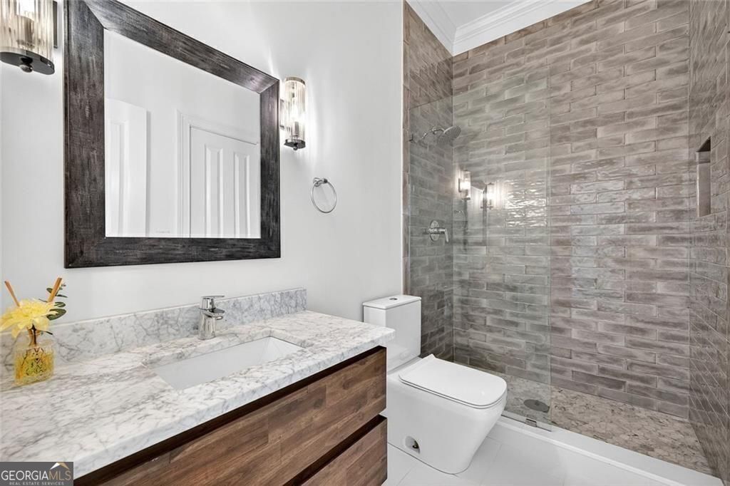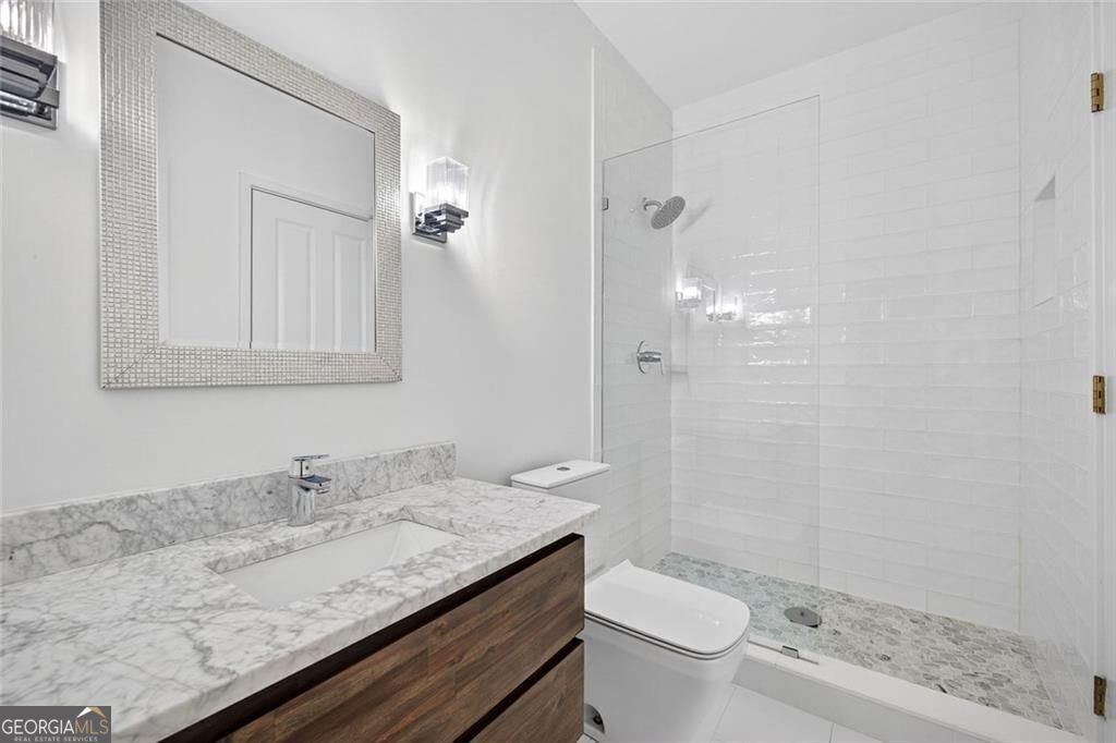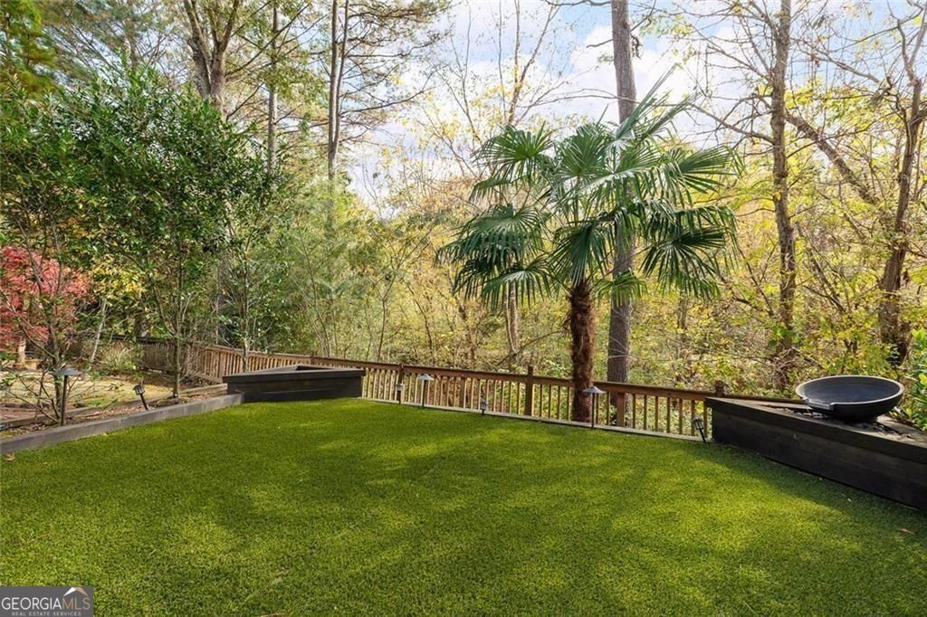 This completely reimagined residence offers a rare combination of thoughtful design, modern upgrades, and an incredibly private backyard setting. Featuring a brand-new roof, designer kitchen, and fully updated baths, every inch of this home has been carefully curated for today's lifestyle. From the moment you arrive, the refreshed exterior, manicured landscaping, and striking Japanese maple create an inviting first impression. Inside, a bright, open foyer welcomes you, flanked by a formal living room and an elegant dining space with a butler's pantry, ideal for both everyday living and elevated entertaining. The main level unfolds seamlessly with designer hardwoods, updated lighting, and an airy, open-concept layout. At its center, the fireside family room is anchored by a coffered ceiling, custom built-ins, and a dramatic wall of sliding glass doors that open to the expansive deck, creating a true indoor-outdoor connection. The kitchen is a standout, clean-lined and modern with flat-panel cabinetry, thick stone countertops, a generous island with seating, double wall ovens, gas cooktop, and beverage fridge. A main-level guest suite or private office with full bath adds flexibility for today's evolving needs. Upstairs, the primary suite offers a refined retreat with a tray ceiling, dual walk-in closets, and a spa-like bath featuring dual vanities, a freestanding soaking tub, and a glass-enclosed shower. Two additional ensuite bedrooms and a spacious laundry room complete the upper level. The finished terrace level expands the home's versatility with a full in-law suite including bedroom, bath, kitchen, and living/media space-perfect for extended stays or multi-generational living. An additional finished area just off the garage is ideal for a home gym, studio, or climate-controlled storage. Outdoors, enjoy a flat, low-maintenance terraced yard and an expansive deck designed for entertaining, relaxing, and play, all with a sense of privacy that's hard to find in this location. Ideally positioned just minutes from Mason Mill Park, Emory, Children's Healthcare, the VA Hospital, and the shops and restaurants of Virginia-Highland, this home delivers a compelling blend of convenience, space, and elevated Intown living.