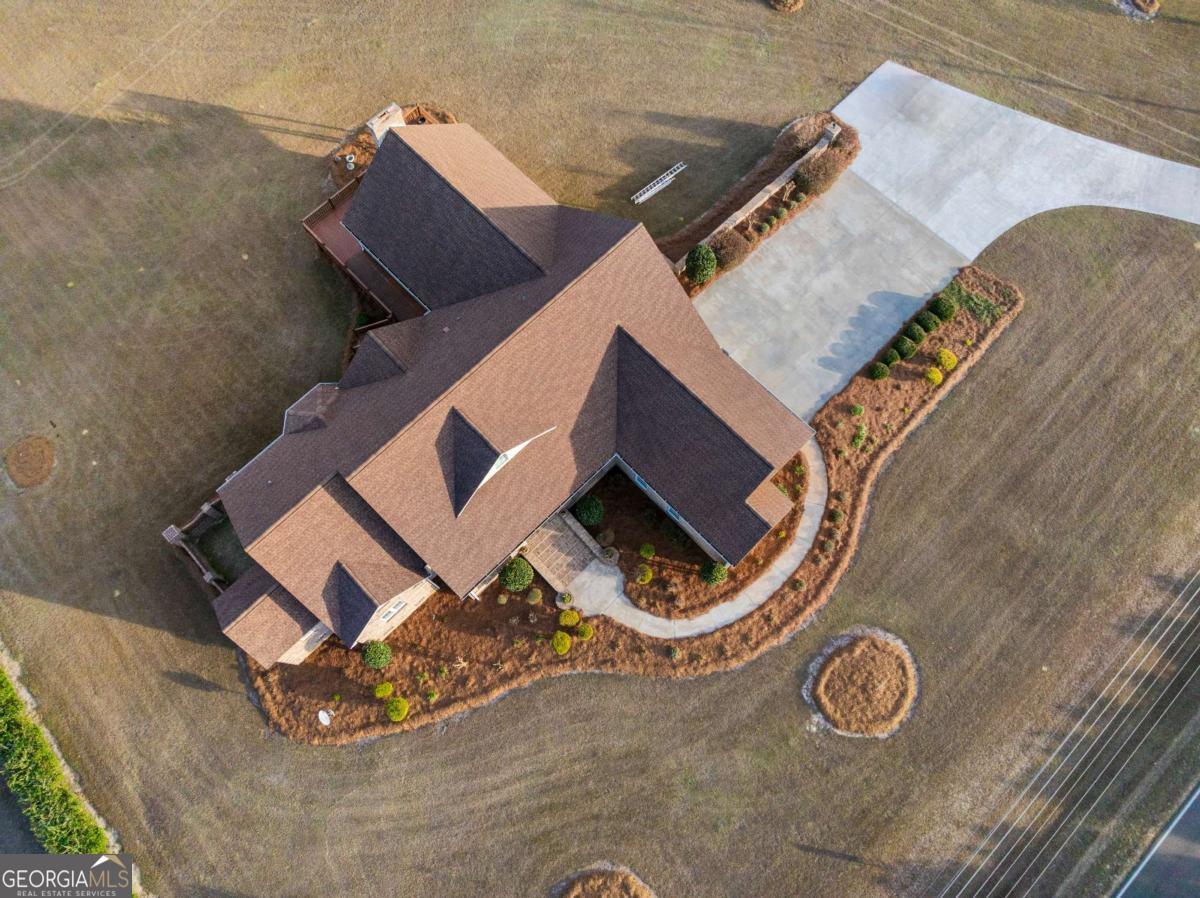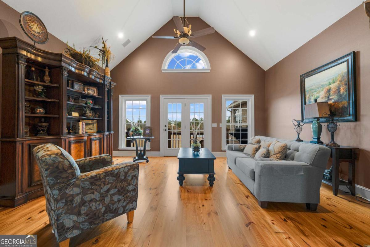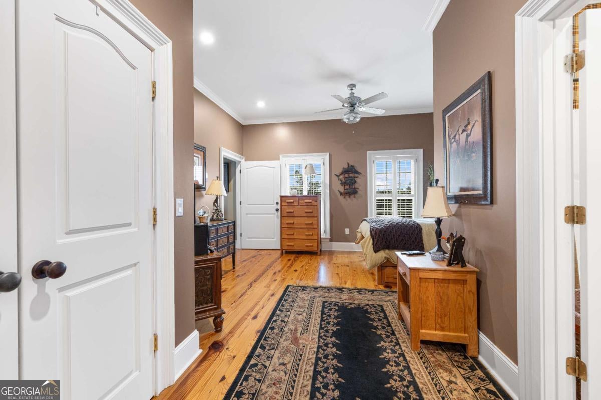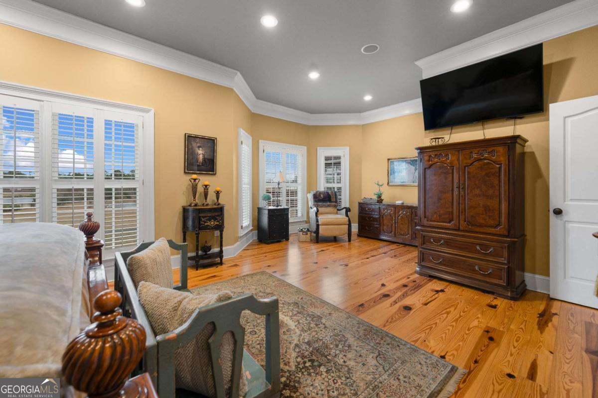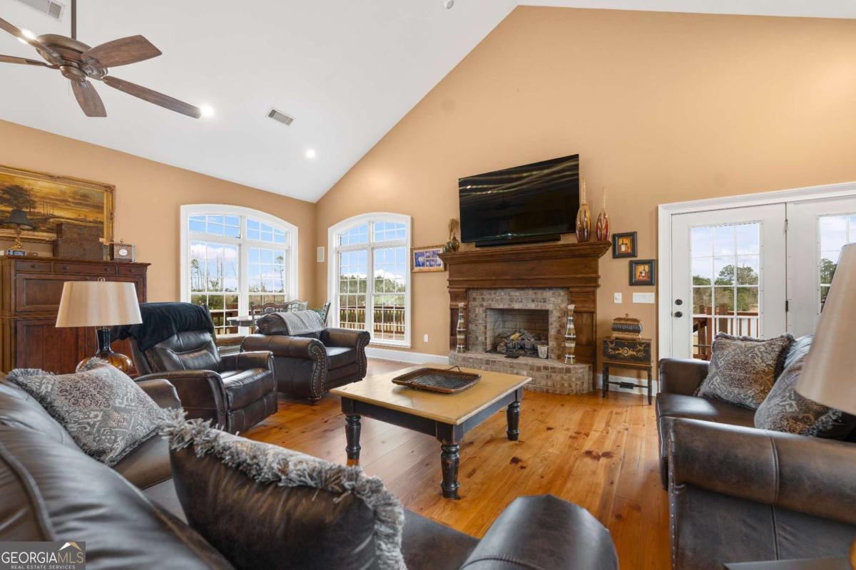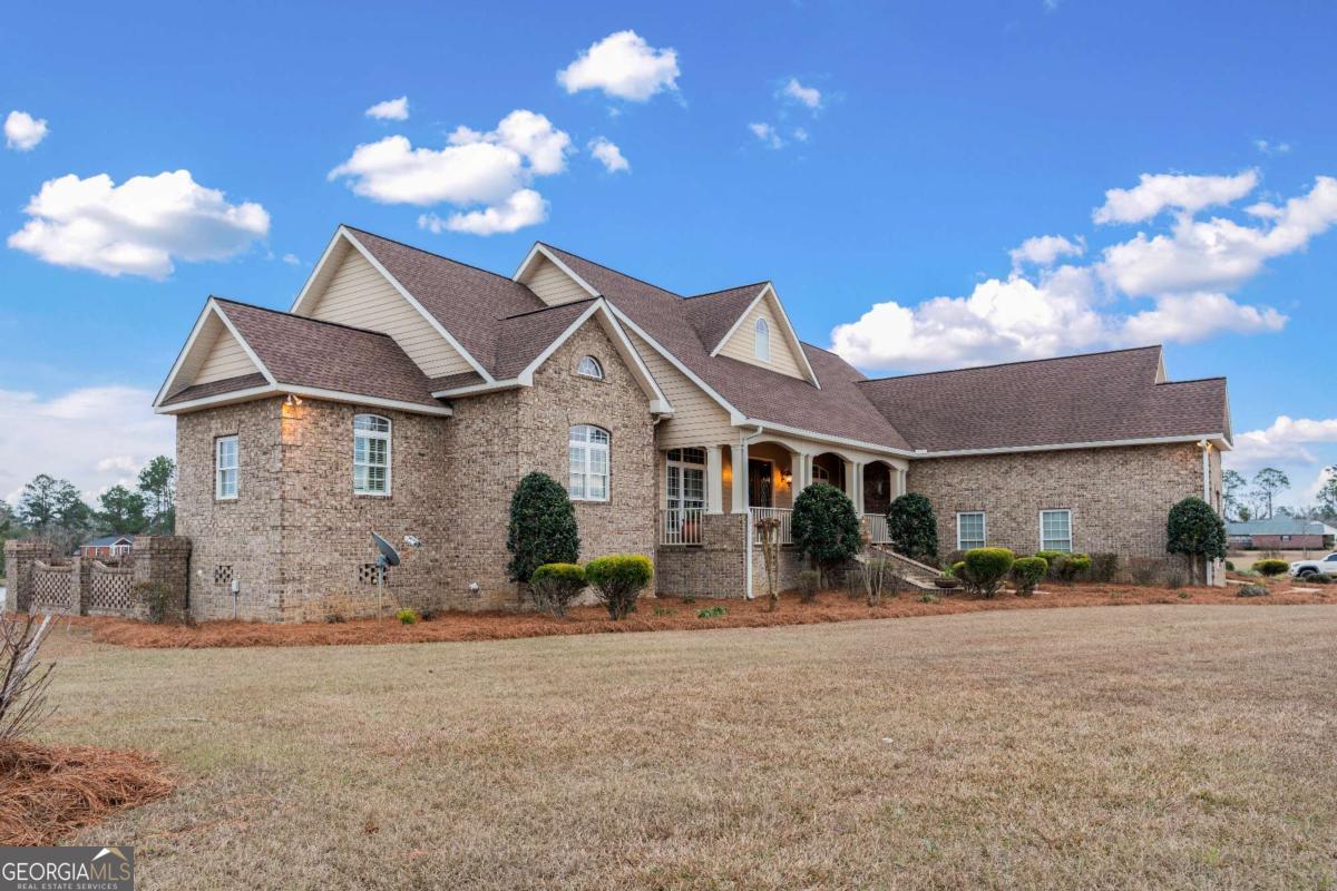 Stunning two-story brick home on 5.15 acres with 3/4 ownership of a stocked 3.5-acre bass pond. The home offers 6,044 sq. ft. of heated space and 8,716 sq. ft. total including the finished basement. Features include a 3-car garage, 2 main-level bedrooms with full baths, a half bath, a main-level bonus/office room, and a primary suite with a jetted tub and dual shower heads. Upstairs includes 2 bonus rooms and a full bedroom with private bath. Highlights include a grand great room with cathedral ceilings, formal dining, and a chef's kitchen with double ovens, double dishwashers, a 6-burner gas stove, granite counters, and custom cabinetry. Heart pine floors, crown molding, trey ceilings, and a BOSE audio system add to the upscale feel. Outdoor areas include a 1,072 sq. ft. porch with wood-burning fireplace and a 360 sq. ft. covered sitting area. Finished basement has HVAC and plumbing/electrical for a bar. Located 2.5 hours from Jacksonville, FL, and 2 hours from Savannah, GA.