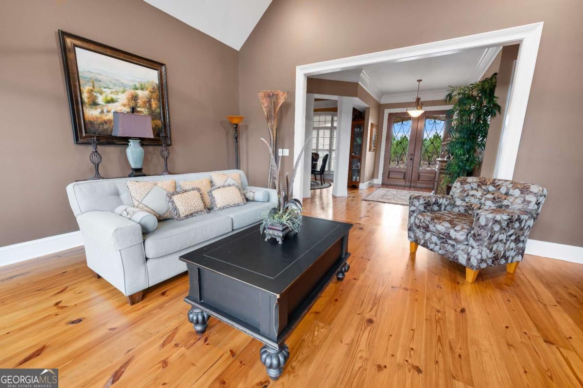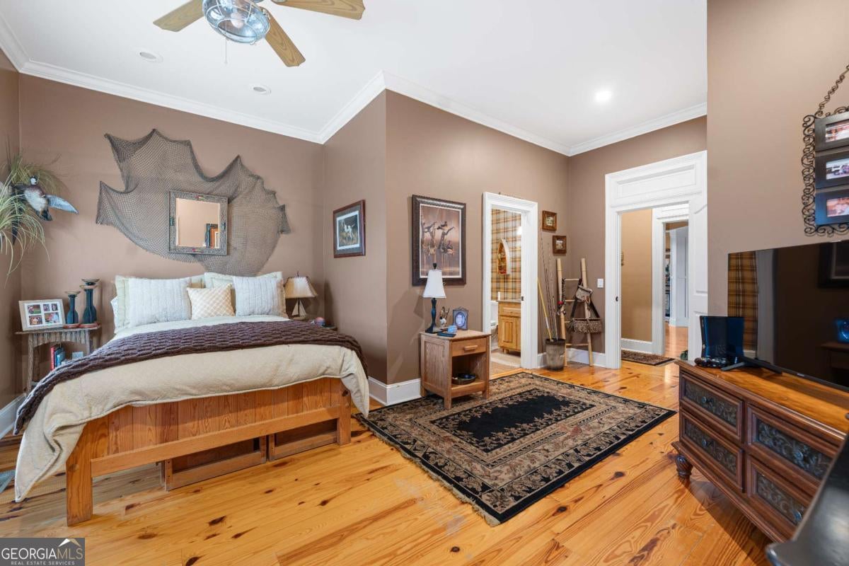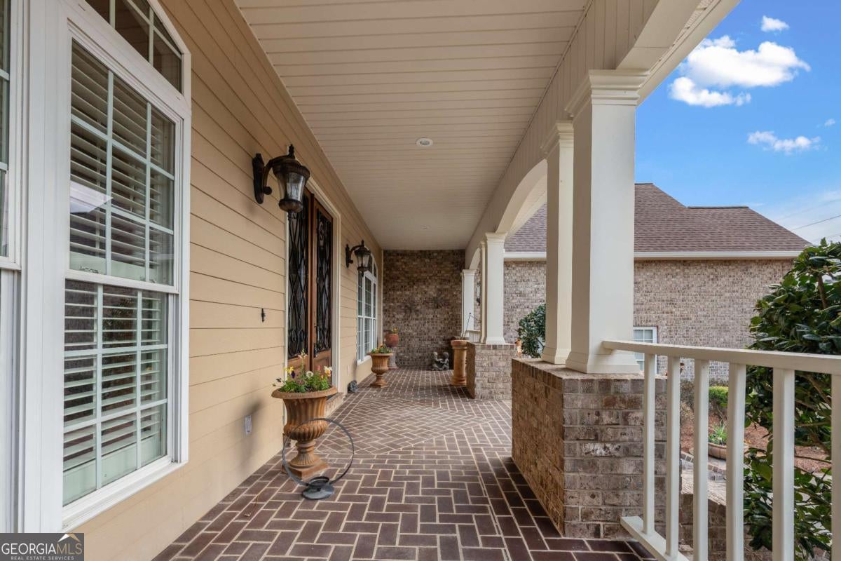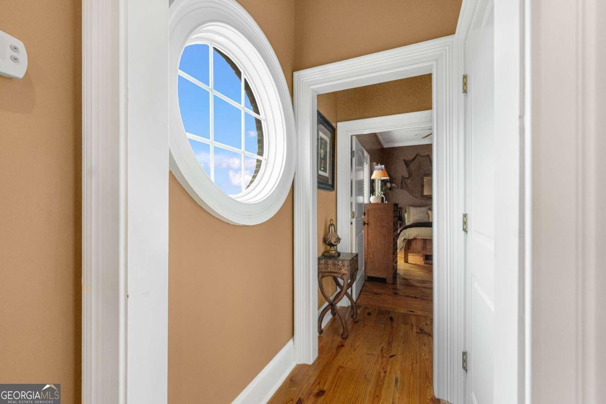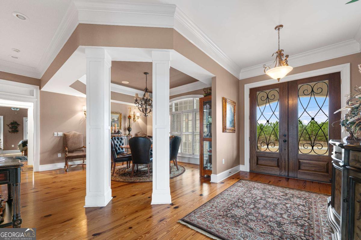 Stunning two-story brick home on 5.15 acres with 3/4 ownership of a stocked 3.5-acre bass pond. The home offers 6,044 sq. ft. of heated space and 8,716 sq. ft. total including the finished basement. Features include a 3-car garage, 2 main-level bedrooms with full baths, a half bath, a main-level bonus/office room, and a primary suite with a jetted tub and dual shower heads. Upstairs includes 2 bonus rooms and a full bedroom with private bath. Highlights include a grand great room with cathedral ceilings, formal dining, and a chef's kitchen with double ovens, double dishwashers, a 6-burner gas stove, granite counters, and custom cabinetry. Heart pine floors, crown molding, trey ceilings, and a BOSE audio system add to the upscale feel. Outdoor areas include a 1,072 sq. ft. porch with wood-burning fireplace and a 360 sq. ft. covered sitting area. Finished basement has HVAC and plumbing/electrical for a bar. Located 2.5 hours from Jacksonville, FL, and 2 hours from Savannah, GA.