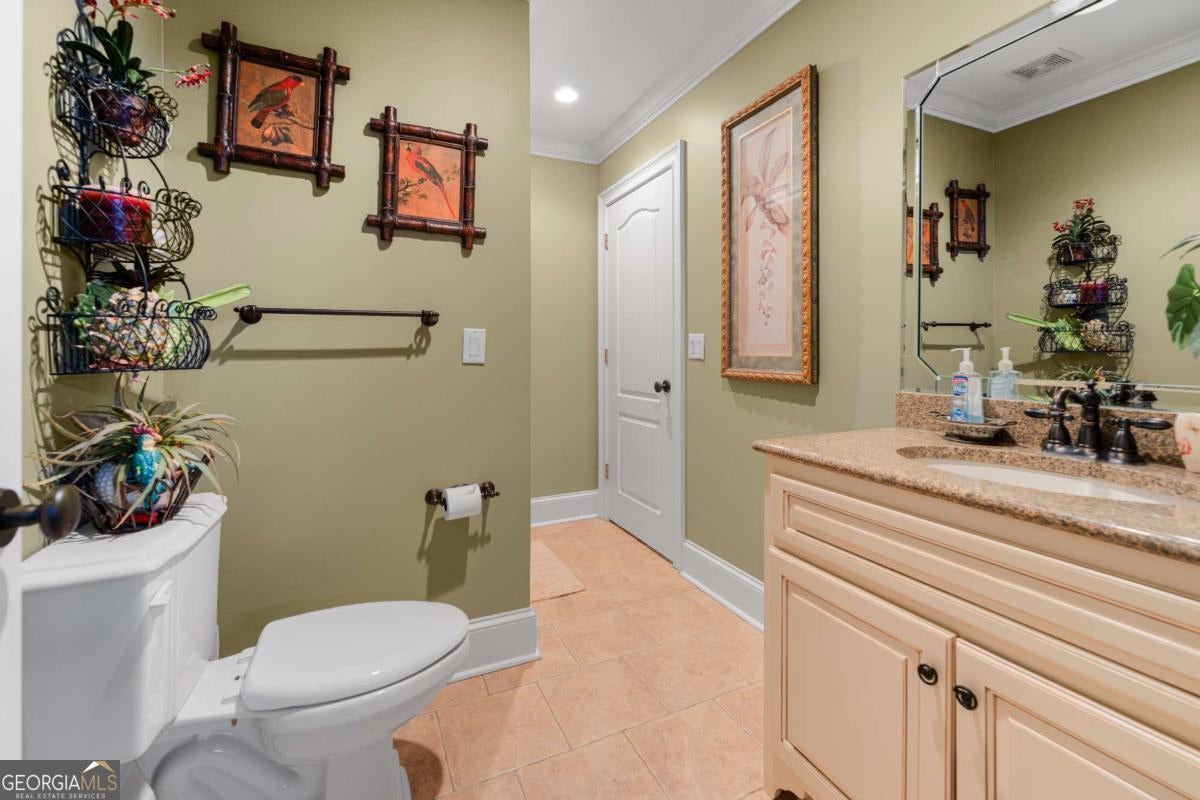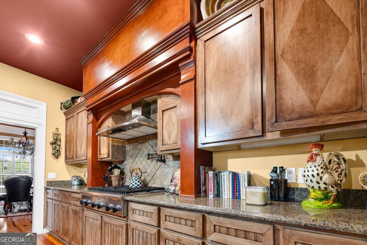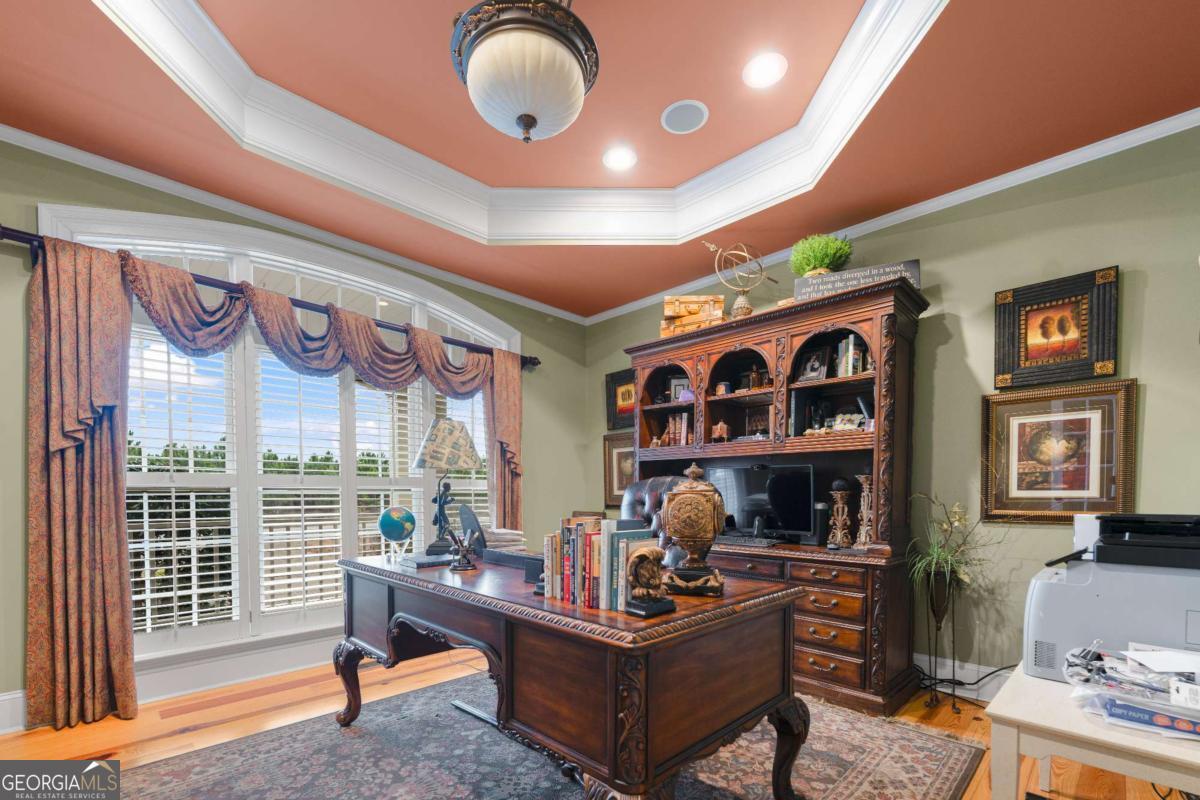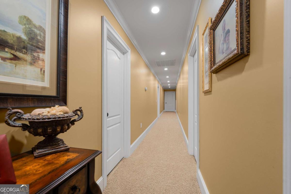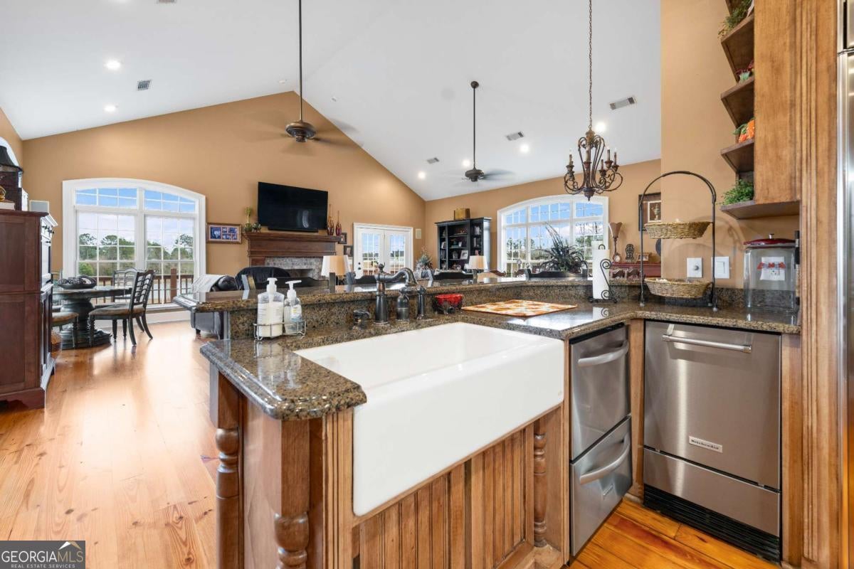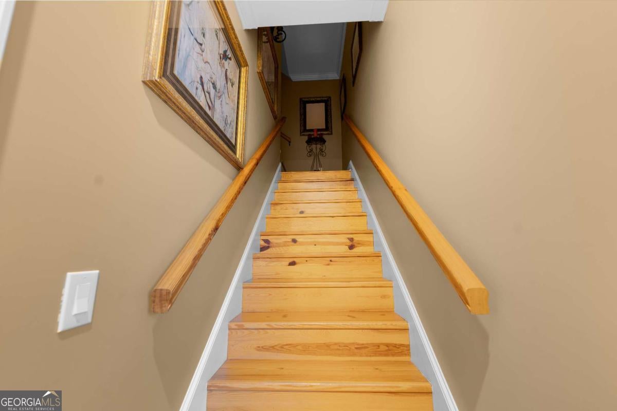 Stunning two-story brick home on 5.15 acres with 3/4 ownership of a stocked 3.5-acre bass pond. The home offers 6,044 sq. ft. of heated space and 8,716 sq. ft. total including the finished basement. Features include a 3-car garage, 2 main-level bedrooms with full baths, a half bath, a main-level bonus/office room, and a primary suite with a jetted tub and dual shower heads. Upstairs includes 2 bonus rooms and a full bedroom with private bath. Highlights include a grand great room with cathedral ceilings, formal dining, and a chef's kitchen with double ovens, double dishwashers, a 6-burner gas stove, granite counters, and custom cabinetry. Heart pine floors, crown molding, trey ceilings, and a BOSE audio system add to the upscale feel. Outdoor areas include a 1,072 sq. ft. porch with wood-burning fireplace and a 360 sq. ft. covered sitting area. Finished basement has HVAC and plumbing/electrical for a bar. Located 2.5 hours from Jacksonville, FL, and 2 hours from Savannah, GA.