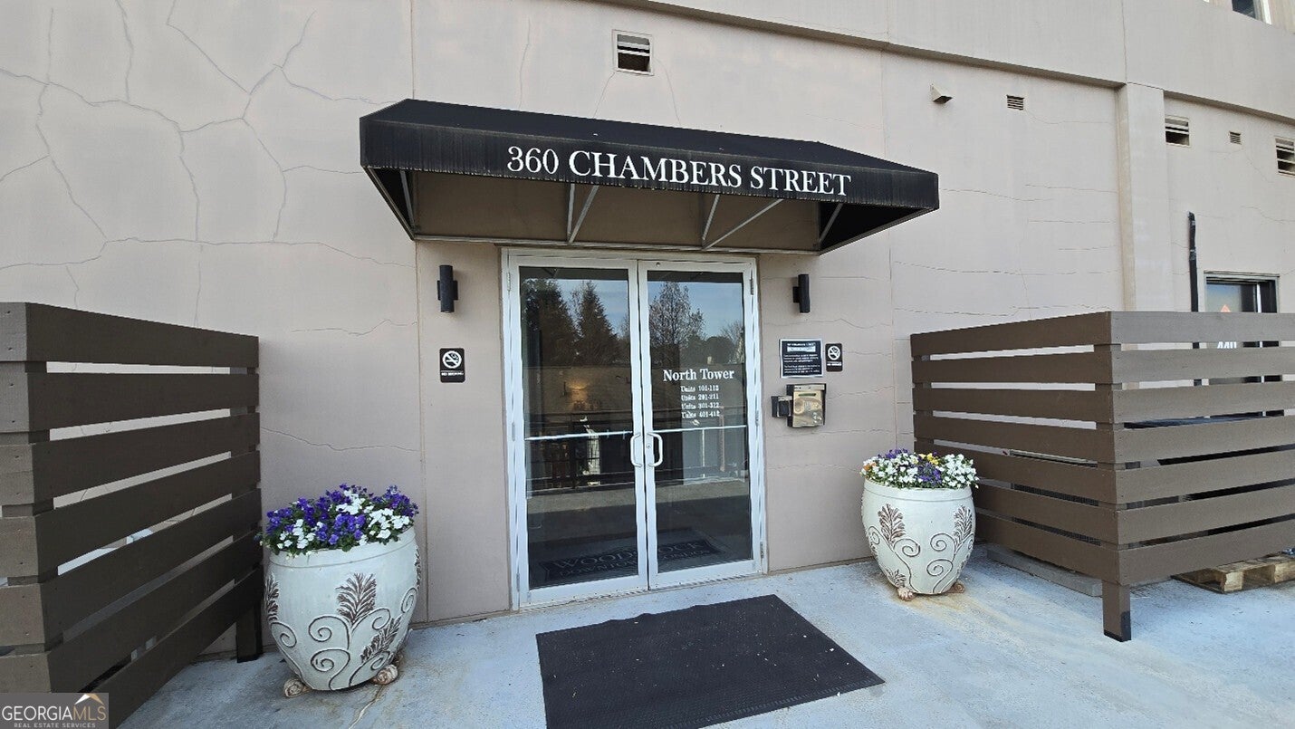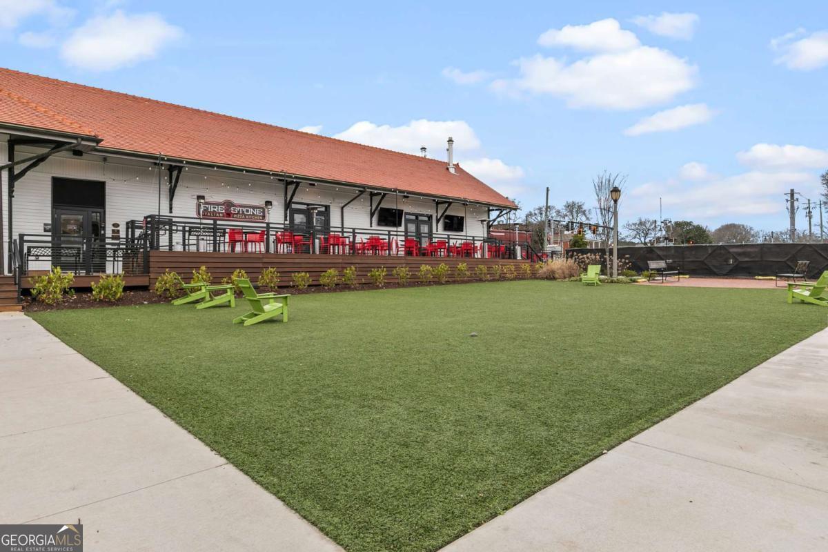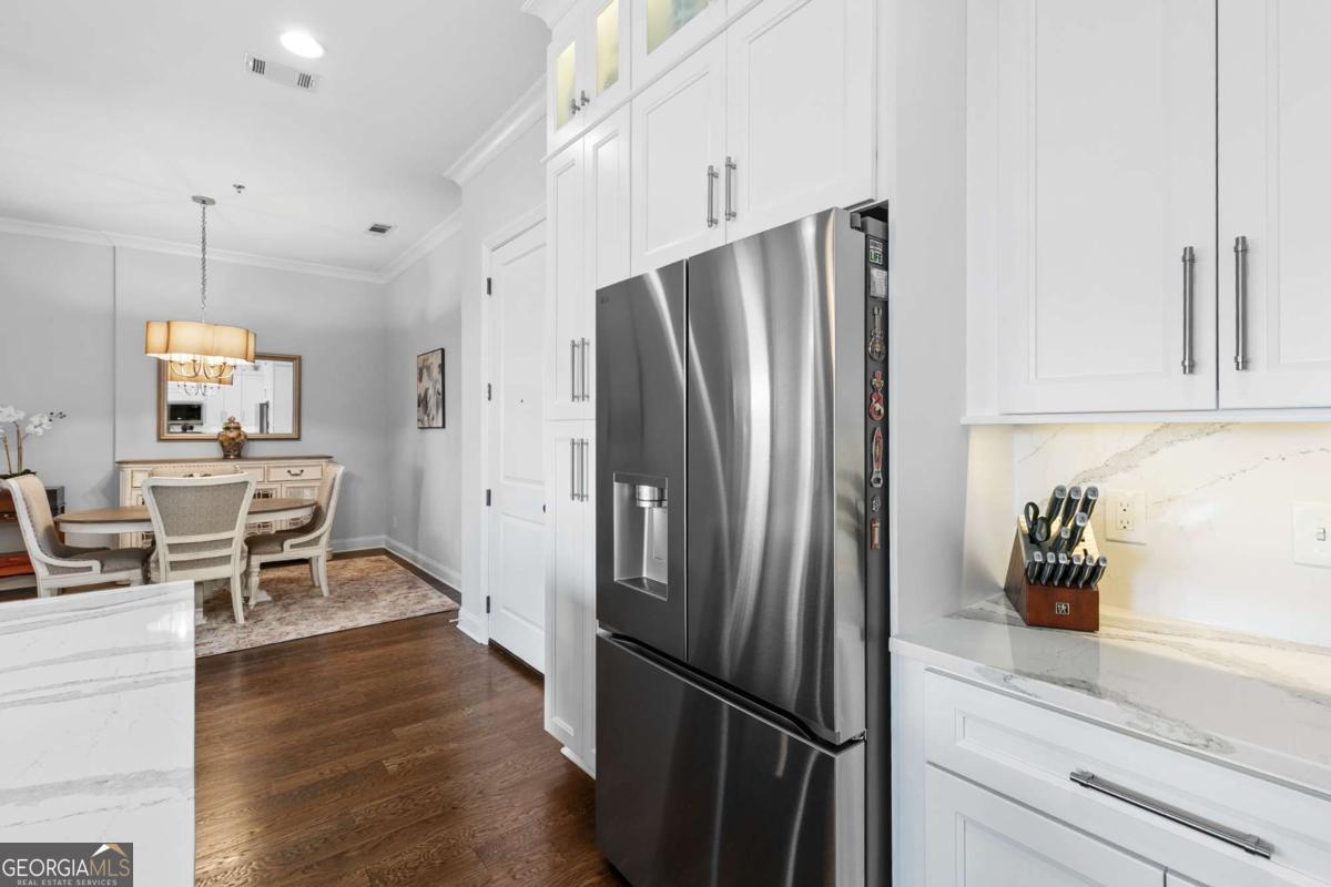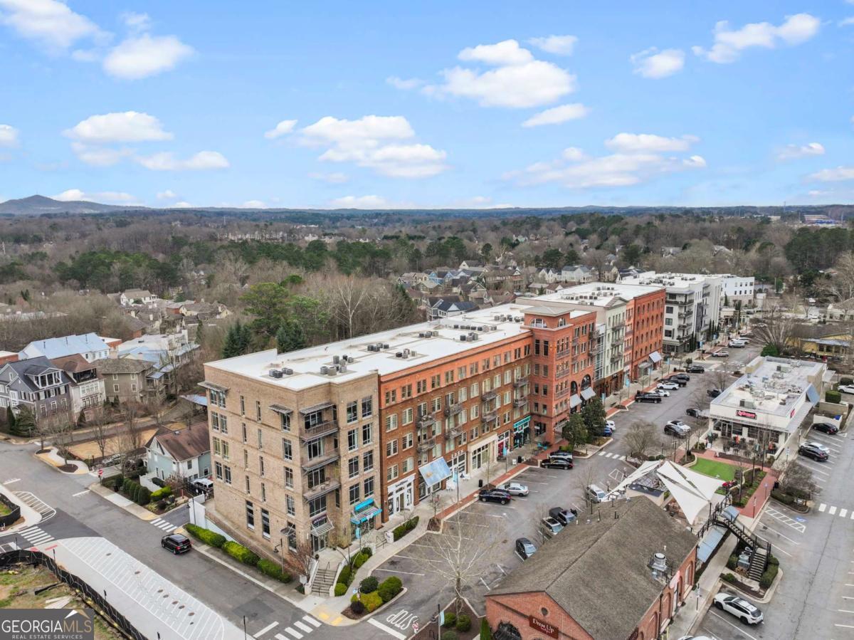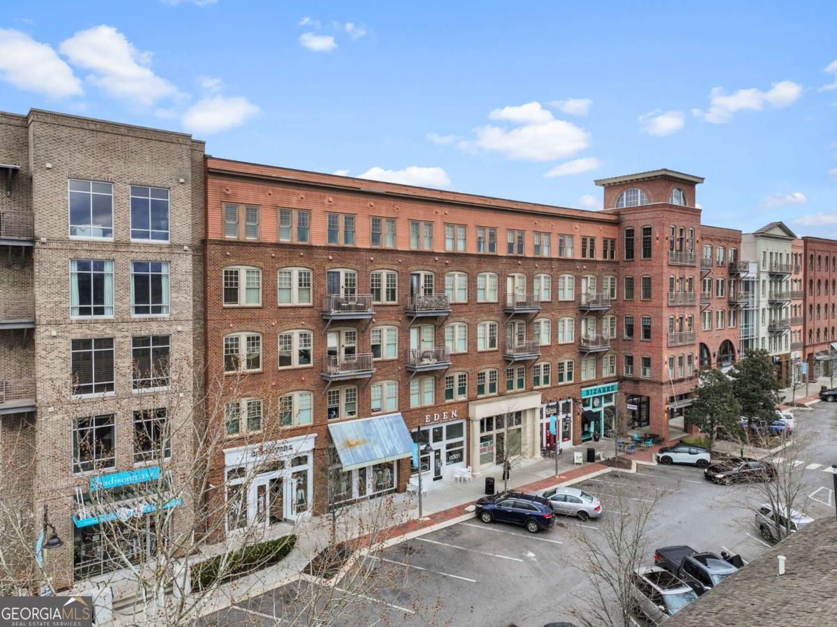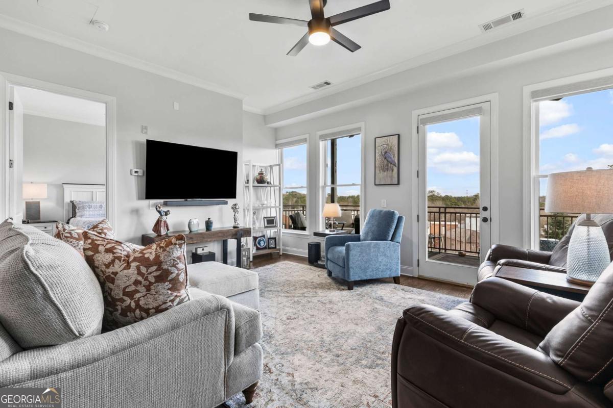 Welcome to comfort and effortless living in the heart of Woodstock's downtown premier gated community on Chamber's Street! Discover the perfect blend of luxury living and suburban charm in this 2-bedroom, 2-bath with all one level easy living and gorgeous views! As one of the larger floor plans in the development, this meticulously maintained and inviting open plan offers a spectacular kitchen that seamlessly connects the living area, dining room, and large covered outdoor balcony, all bathed in natural light. Freshly painted and with an open, airy layout, this split plan unit features soaring 1O1/2-foot ceilings and 8-foot doors. There are wood floors in most rooms and closets while tile flooring adorns both bathrooms. Crown molding throughout the home provides a fine finishing touch! An upgraded and renovated high end finish kitchen awaits you! Culinary enthusiasts will appreciate the LG stainless steel appliances, ample cabinetry, and versatile island for casual dining or entertaining. The quartz countertops and backsplash are complimented with undermount cabinet lighting. Soft-close pullouts and drawers make for easy handling and 42" uppers provide for additional storage. The quartz topped extended island is more than 5 feet by nearly 7 feet with pullouts providing additional storage. Step outside to the quiet extended balcony with eastern exposure and panoramic views that maximize the stunning landscape. The balcony is further enhanced with outdoor fans and lighting, perfect for year-round relaxation or entertainment. This third-floor home doesn't overlook Main Street or downtown, but rather it faces eastward over treetops, which provides lovely sunrises along with peace and quiet located in a downtown community. The balcony is large enough for seating more than eight people comfortably. Windows are 76 inches, along with an 8-foot balcony door, all and have automatic/programmable shades. This split plan offers two bedrooms and two full baths. The private primary suite has a large, outfitted walk-in closet, dual vanities, a separate water closet, a stand-alone shower, and a large bathtub. The washer and dryer closet are in this bathroom with their own closed-door space allowing for a stackable full-size washer and dryer. The spacious second bedroom has a full bath with linen storage as well and is ideal for guests or turn this room into a den or home office. It also has an outfitted walk-in closet. Upgrades in 2024: New kitchen with LG stainless steel appliances; new hot water heater; new ceiling fans in living area and both bedrooms; walk-in closets outfitted and adaptable/changeable; utility closet holds the HVAC, hot water heater and offers additional storage space; new internal ceiling exhaust fan for the dryer duct; HVAC duct work, dryer vent, and other venting cleaned; all walls, doors, crown molding, and baseboards painted; outdoor ceiling fans and light. This unit also includes two covered beneath the building side-by-side parking spaces near the unit's lobby door. The HOA takes care of a secured building, underneath building convenient parking garage, outdoor spaces, entrance and exit gates, a large community pool with outdoor BBQ grills and neighborhood parks, building lobbies, common spaces, onsite dog park, along with trash, and recycling services. There are even spaces in the parking garage for bicycles. Step outside to varying restaurants, numerous boutique shops and cafes, breweries, neighborhood and city parks and trails; walk to the city amphitheater for one of the free concerts, stroll over to the Woodstock Art House for a show, or meander through downtown to the Reaves House Visual Arts Center. Woodstock is an inviting and a social city, and this residence combines privacy with those conveniences. Do not miss the opportunity to own this beautiful condo home. Schedule your private tour today and experience elevated living in one of Woodstock's premier communities.