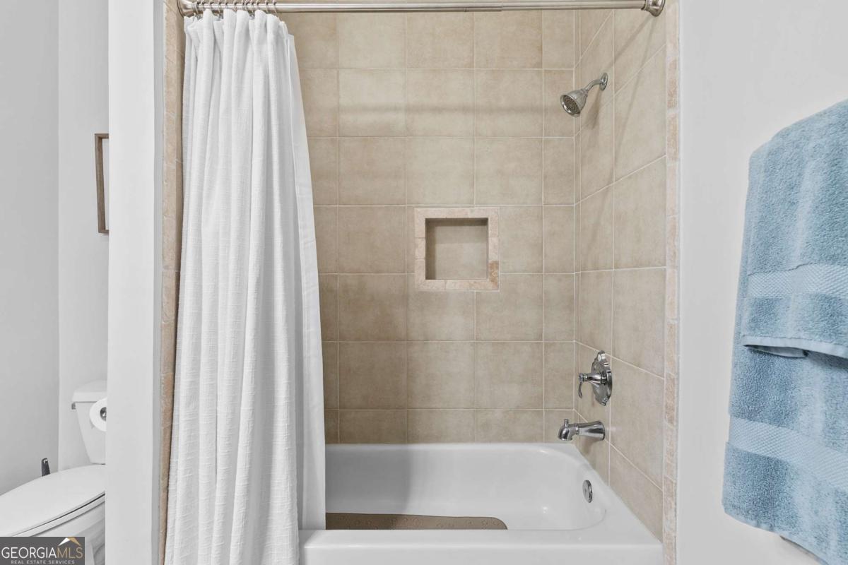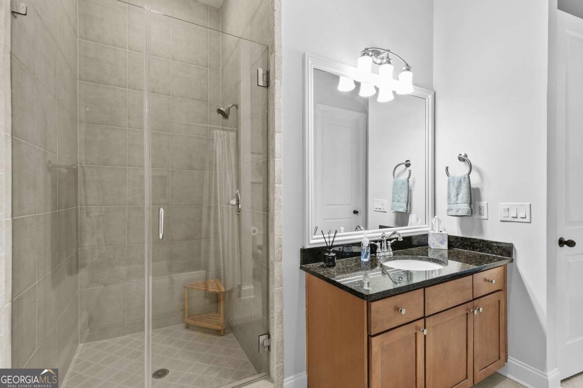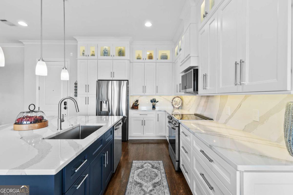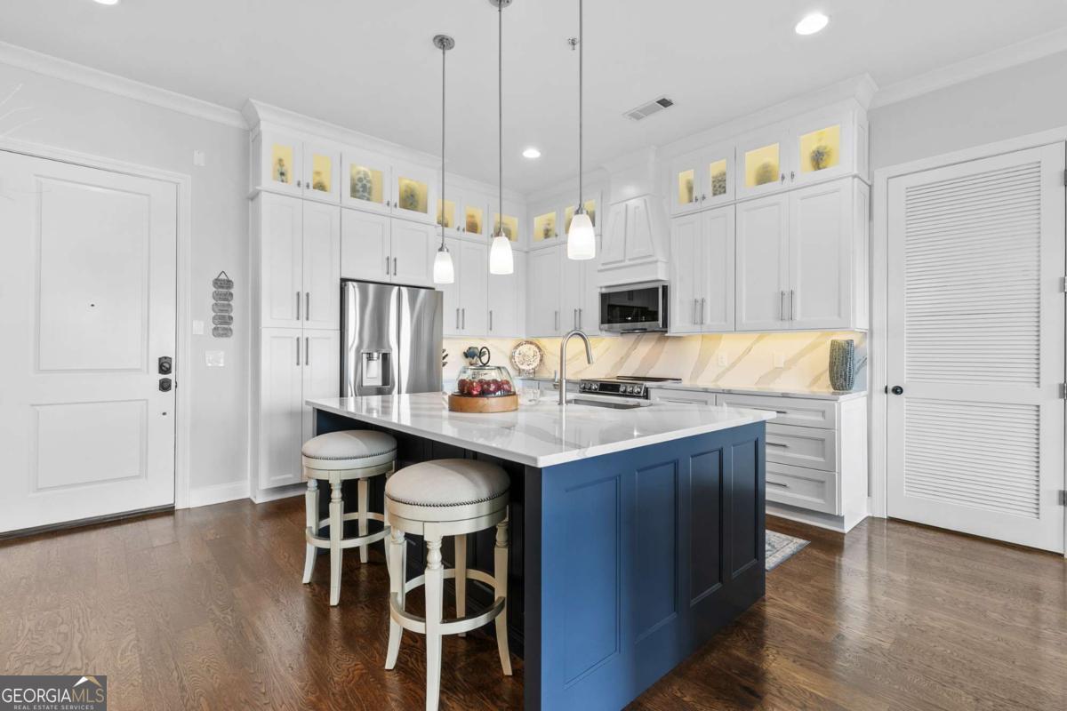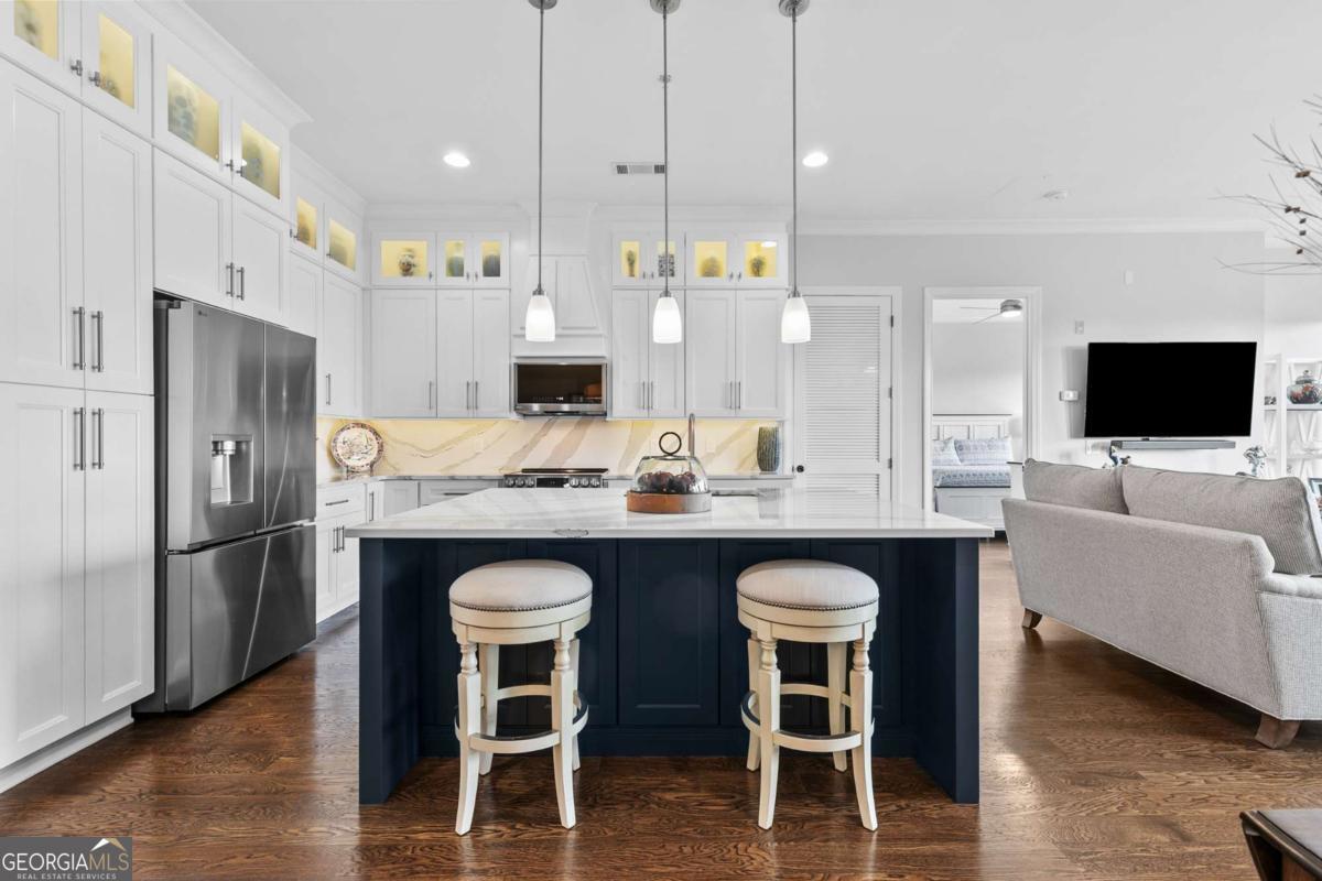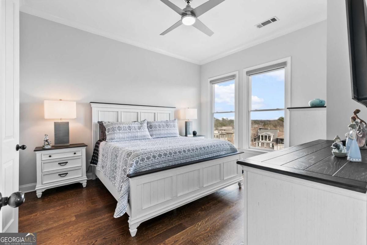 Welcome to comfort and effortless living in the heart of Woodstock's downtown premier gated community on Chamber's Street! Discover the perfect blend of luxury living and suburban charm in this 2-bedroom, 2-bath with all one level easy living and gorgeous views! As one of the larger floor plans in the development, this meticulously maintained and inviting open plan offers a spectacular kitchen that seamlessly connects the living area, dining room, and large covered outdoor balcony, all bathed in natural light. Freshly painted and with an open, airy layout, this split plan unit features soaring 1O1/2-foot ceilings and 8-foot doors. There are wood floors in most rooms and closets while tile flooring adorns both bathrooms. Crown molding throughout the home provides a fine finishing touch! An upgraded and renovated high end finish kitchen awaits you! Culinary enthusiasts will appreciate the LG stainless steel appliances, ample cabinetry, and versatile island for casual dining or entertaining. The quartz countertops and backsplash are complimented with undermount cabinet lighting. Soft-close pullouts and drawers make for easy handling and 42" uppers provide for additional storage. The quartz topped extended island is more than 5 feet by nearly 7 feet with pullouts providing additional storage. Step outside to the quiet extended balcony with eastern exposure and panoramic views that maximize the stunning landscape. The balcony is further enhanced with outdoor fans and lighting, perfect for year-round relaxation or entertainment. This third-floor home doesn't overlook Main Street or downtown, but rather it faces eastward over treetops, which provides lovely sunrises along with peace and quiet located in a downtown community. The balcony is large enough for seating more than eight people comfortably. Windows are 76 inches, along with an 8-foot balcony door, all and have automatic/programmable shades. This split plan offers two bedrooms and two full baths. The private primary suite has a large, outfitted walk-in closet, dual vanities, a separate water closet, a stand-alone shower, and a large bathtub. The washer and dryer closet are in this bathroom with their own closed-door space allowing for a stackable full-size washer and dryer. The spacious second bedroom has a full bath with linen storage as well and is ideal for guests or turn this room into a den or home office. It also has an outfitted walk-in closet. Upgrades in 2024: New kitchen with LG stainless steel appliances; new hot water heater; new ceiling fans in living area and both bedrooms; walk-in closets outfitted and adaptable/changeable; utility closet holds the HVAC, hot water heater and offers additional storage space; new internal ceiling exhaust fan for the dryer duct; HVAC duct work, dryer vent, and other venting cleaned; all walls, doors, crown molding, and baseboards painted; outdoor ceiling fans and light. This unit also includes two covered beneath the building side-by-side parking spaces near the unit's lobby door. The HOA takes care of a secured building, underneath building convenient parking garage, outdoor spaces, entrance and exit gates, a large community pool with outdoor BBQ grills and neighborhood parks, building lobbies, common spaces, onsite dog park, along with trash, and recycling services. There are even spaces in the parking garage for bicycles. Step outside to varying restaurants, numerous boutique shops and cafes, breweries, neighborhood and city parks and trails; walk to the city amphitheater for one of the free concerts, stroll over to the Woodstock Art House for a show, or meander through downtown to the Reaves House Visual Arts Center. Woodstock is an inviting and a social city, and this residence combines privacy with those conveniences. Do not miss the opportunity to own this beautiful condo home. Schedule your private tour today and experience elevated living in one of Woodstock's premier communities.