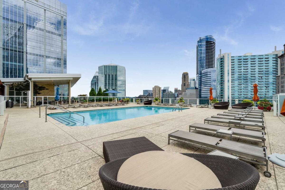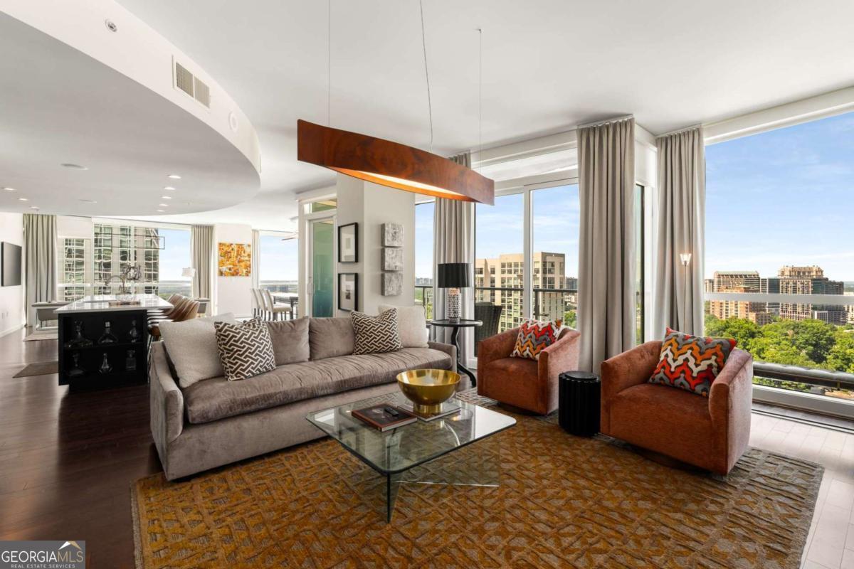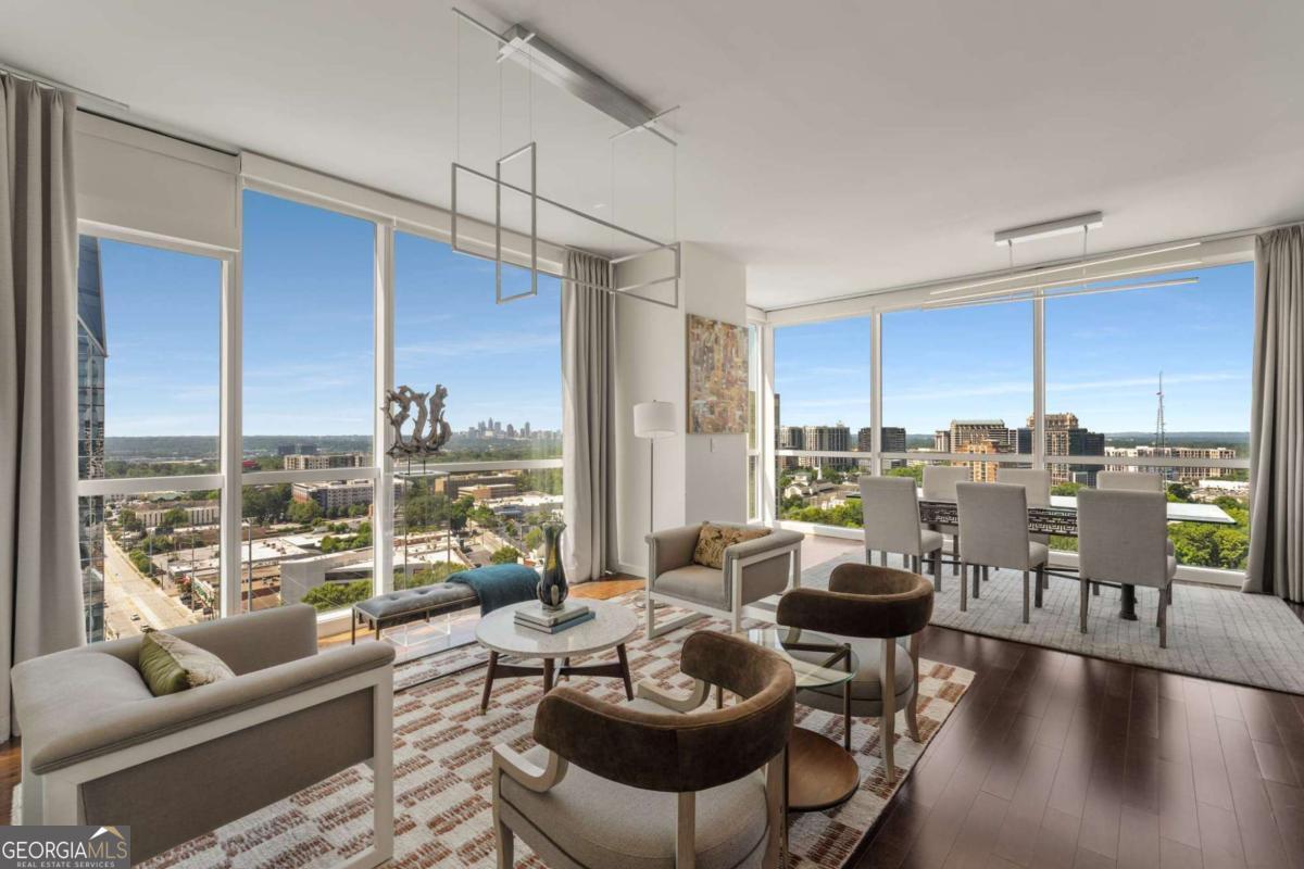 Sexy AND Smart? This seductive city home showcasing smart home Control 4 technology makes entertaining a breeze setting the mood throughout the entire home with one touch! Experience elevated living in this expansive residence thanks to dramatic floor to ceiling windows offering sweeping views of the Atlanta skyline, dazzling sunsets and twinkling night views. The open concept living and dining areas flow seamlessly into a sleek, mahogany stained chef's kitchen equipped with premium Wolf and Sub-Zero appliances, a Bosch dishwasher, warming drawer and a long center island with seating for six! A separate catering entrance adds functionality while the wet bar featuring a Sub-Zero wine fridge and ice maker is clutch when entertaining. Smart upgrades throughout the home include Control4 automation, motorized shades throughout the home, custom closets and rich hardwood floors. The spacious primary suite is a relaxing retreat, offering a sitting area, private terrace with views of Buckhead, walk-in closets and dual spa-inspired master baths boasting his & her water closets and connected by a luxurious walk-in shower. Two additional bedrooms offer generous space each with its own bath featuring granite finishes. Additional highlights include a separate laundry room and two parking spaces. This full-service building includes valet parking, 24 hour concierge and a fantastic amenity level showcasing a gym, clubhouse, pool, dog run and massage rooms. Sophisticated, stylish and located in one of Atlanta's premier buildings - this is city living at its finest!