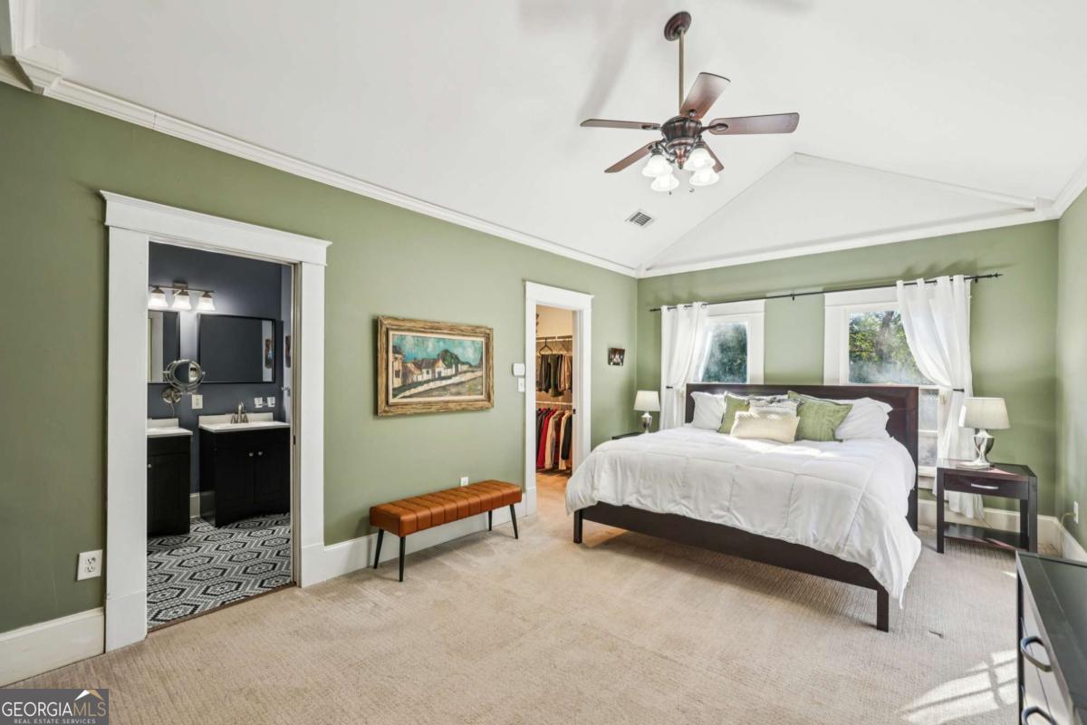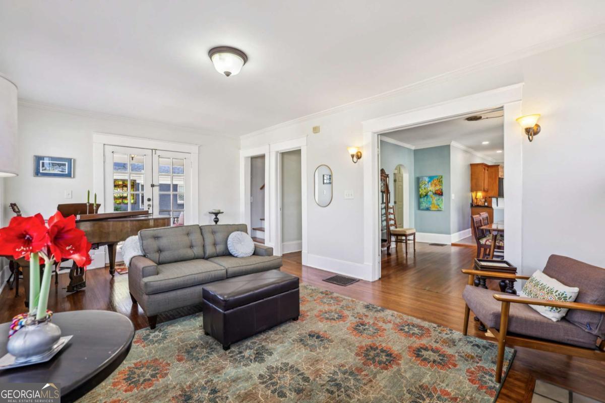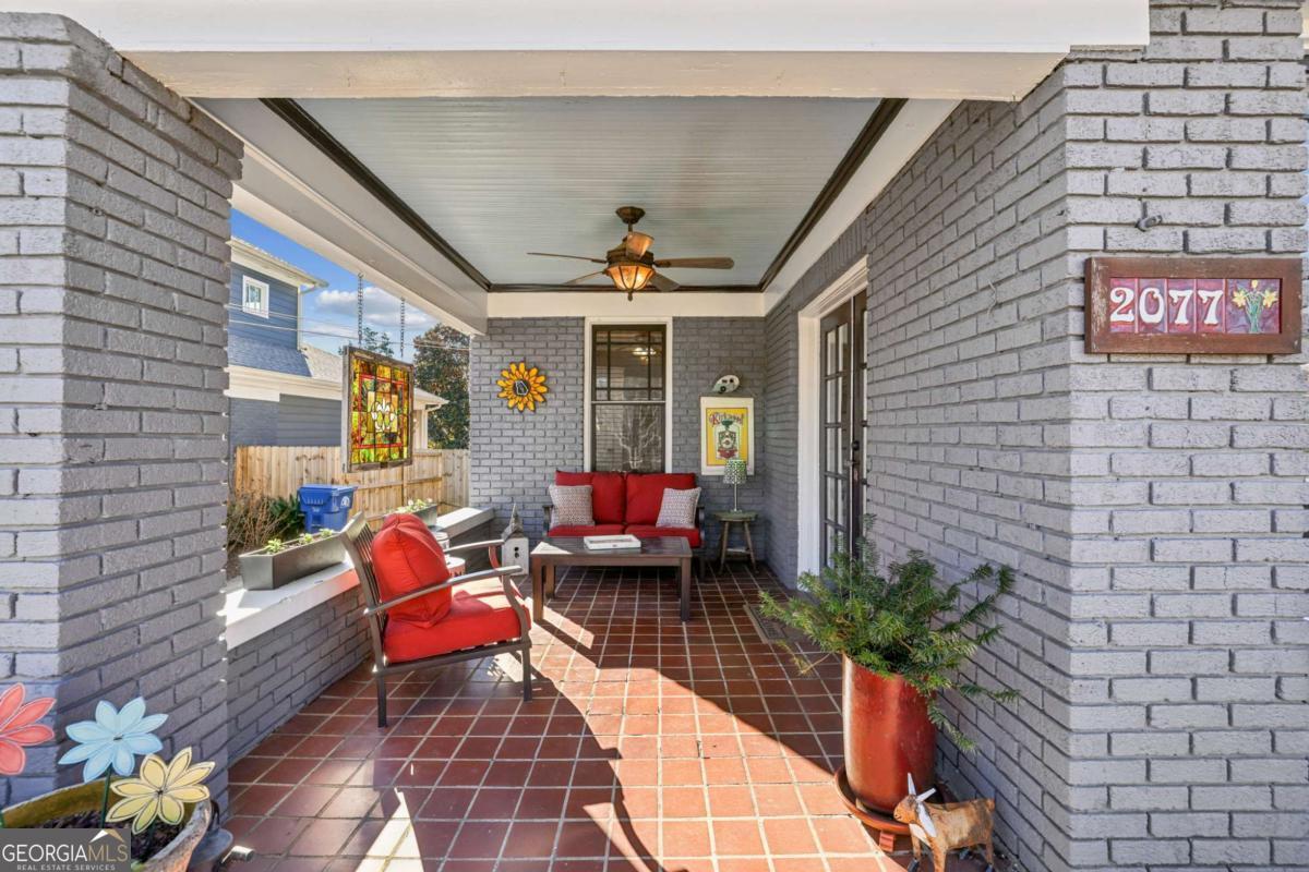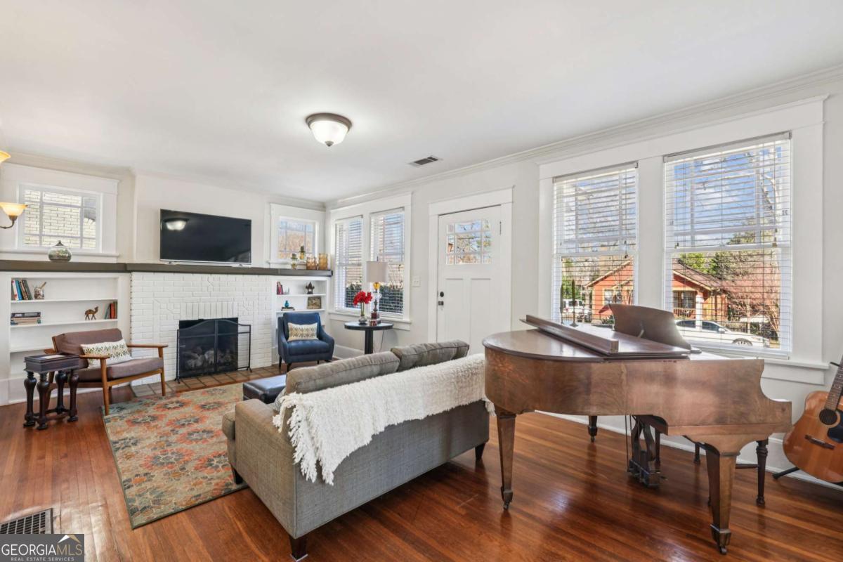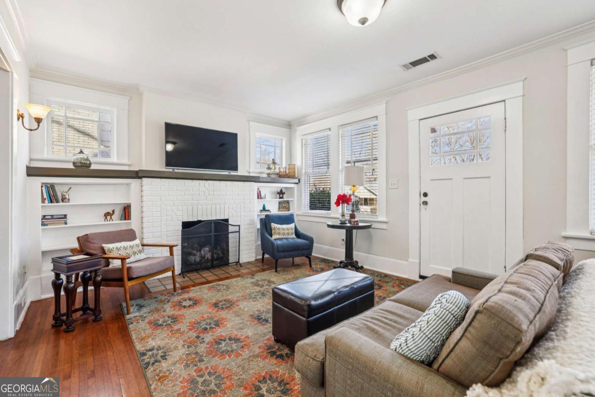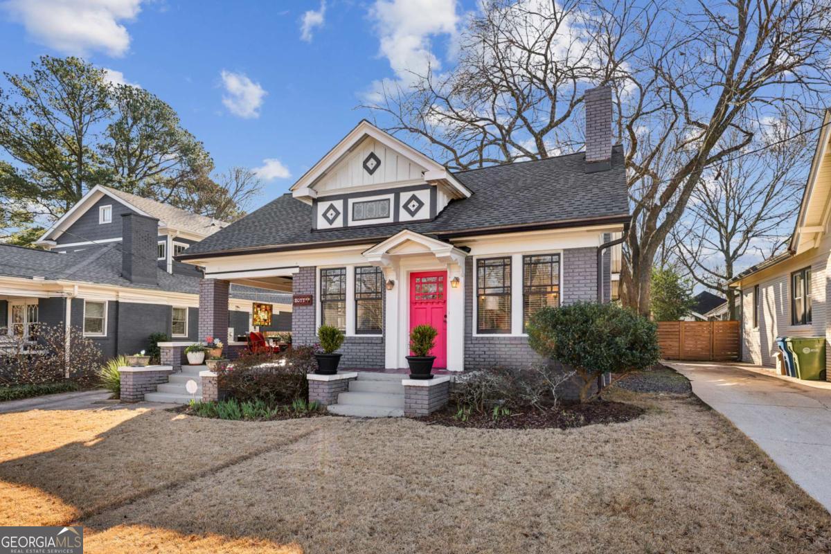 Porch-sitting charm included. This beautifully preserved 1930 brick bungalow sits in the heart of Kirkwood and blends classic Craftsman details and thoughtful period updates throughout. Painted a timeless medium gray, the exterior features decorative roofline sconces and a welcoming side porch entry-perfect for sipping tea and chatting with neighbors. The warmth and charm are immediately evident as you enter the home. A light-filled living room spanning the full width of the home and centered around a white brick fireplace flanked by built-ins and charming windows that set a timeless tone. The living room connects seamlessly to the dining area and kitchen through elegant French glass doors. Hardwood floors, crown molding, wide trim, and a statement chandelier anchor the dining space, while a raised breakfast bar opens to the kitchen. The kitchen offers abundant stained cabinetry, granite countertops, stainless steel appliances, a large pantry, and hexagon tile flooring. The main level boasts 10 ft ceilings and includes two secondary bedrooms-one with built-in shelving and a TV nook, the other generously sized with a walk-in closet-along with a beautifully updated hall bath featuring classic tile flooring and crisp white subway tile in the tub/shower. The oversized primary suite is a true retreat with vaulted ceilings, a walk-in closet, and French doors opening to the back patio. The primary bath features double vanities, a linen closet, tile floors, and an oversized subway-tiled shower with seating. Upstairs offers two additional bedrooms, and a full bath-ideal for guests, work-from-home space, or flexible living. Outside, enjoy a private, fenced backyard with mature landscaping and a cozy patio accessible from both the kitchen and primary suite. Location is everything and just 4 houses away from Bessie Branham Park, and a short walk to the library and all the restaurants, shops and gathering spots downtown Kirkwood has to offer. Classic, inviting, and full of character-this bungalow feels like home the moment you arrive.