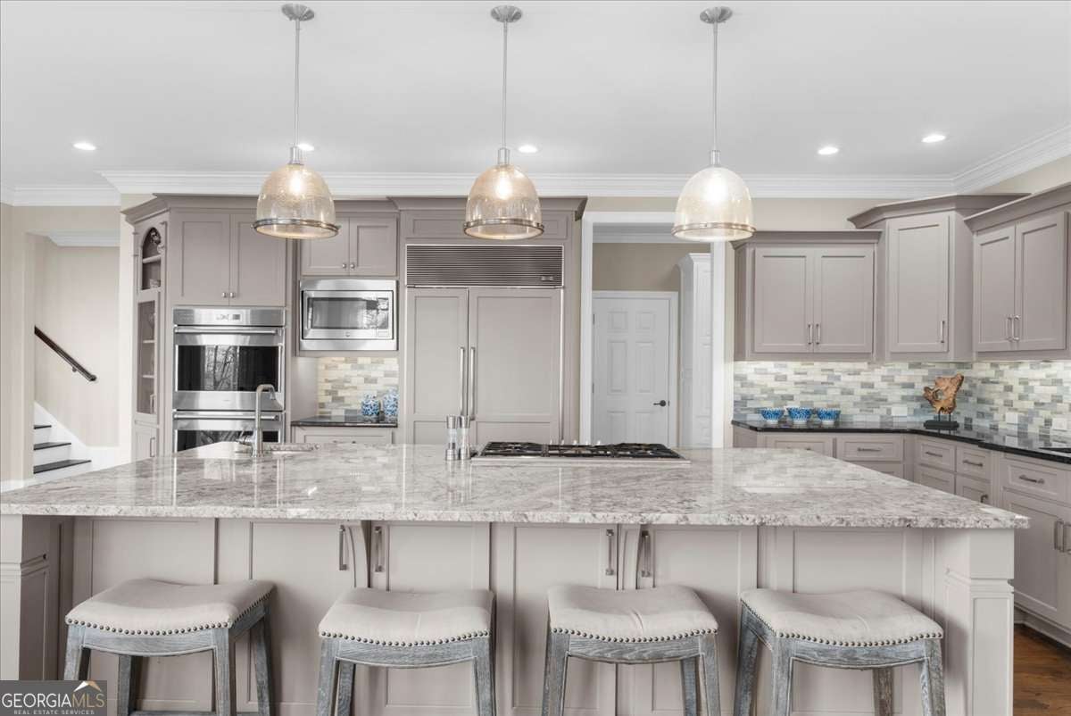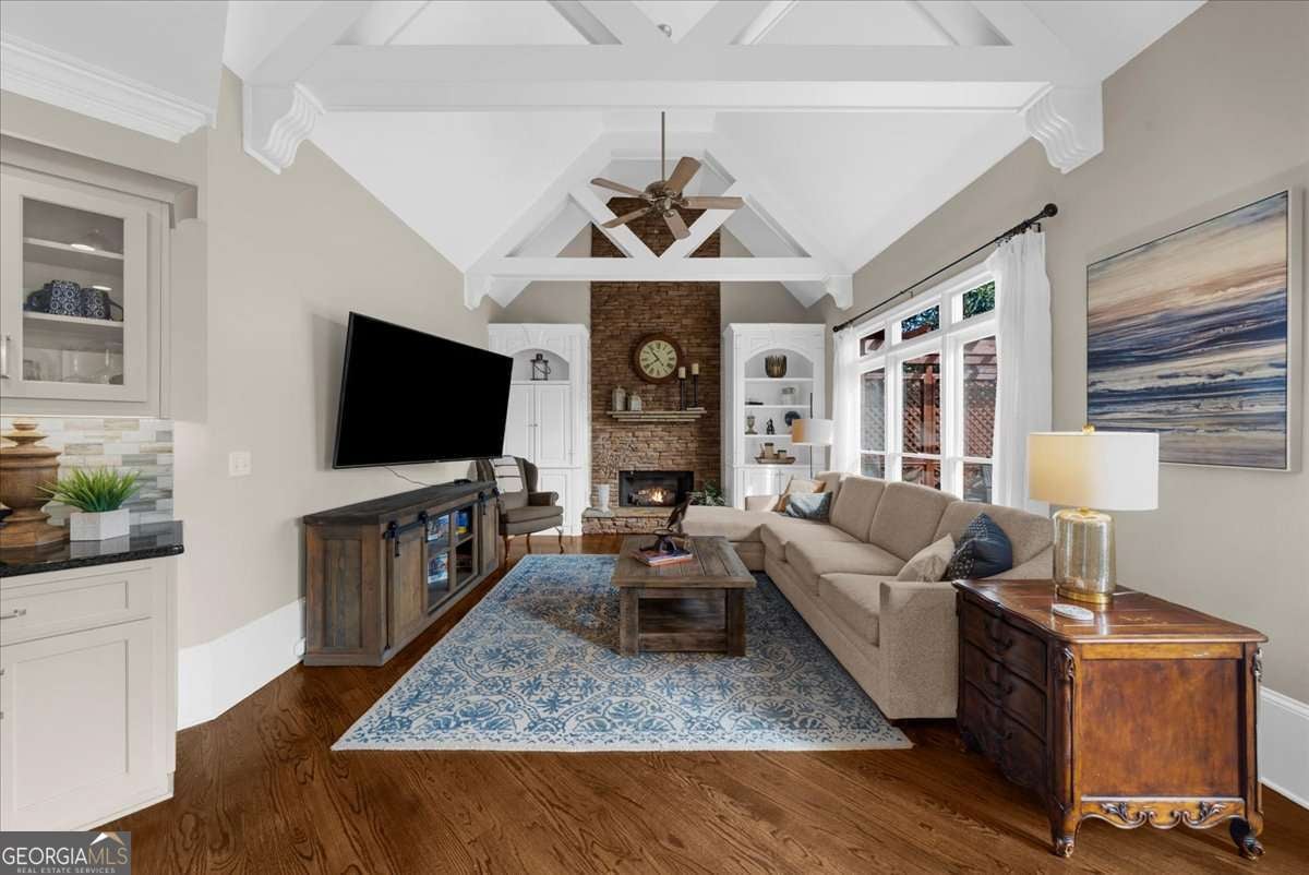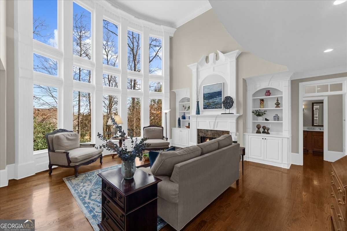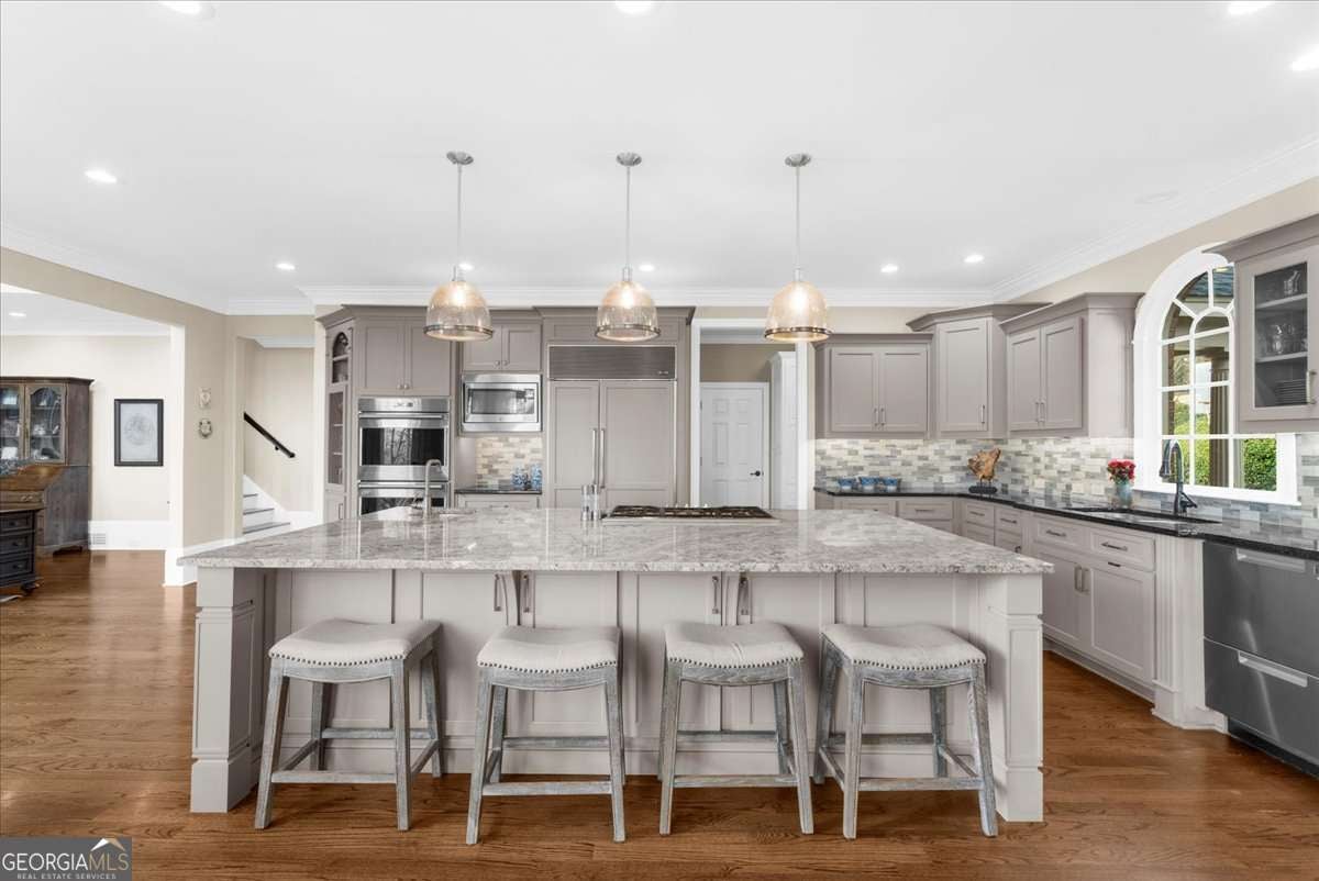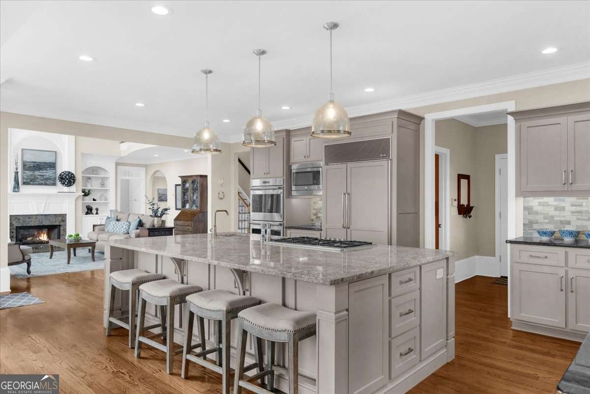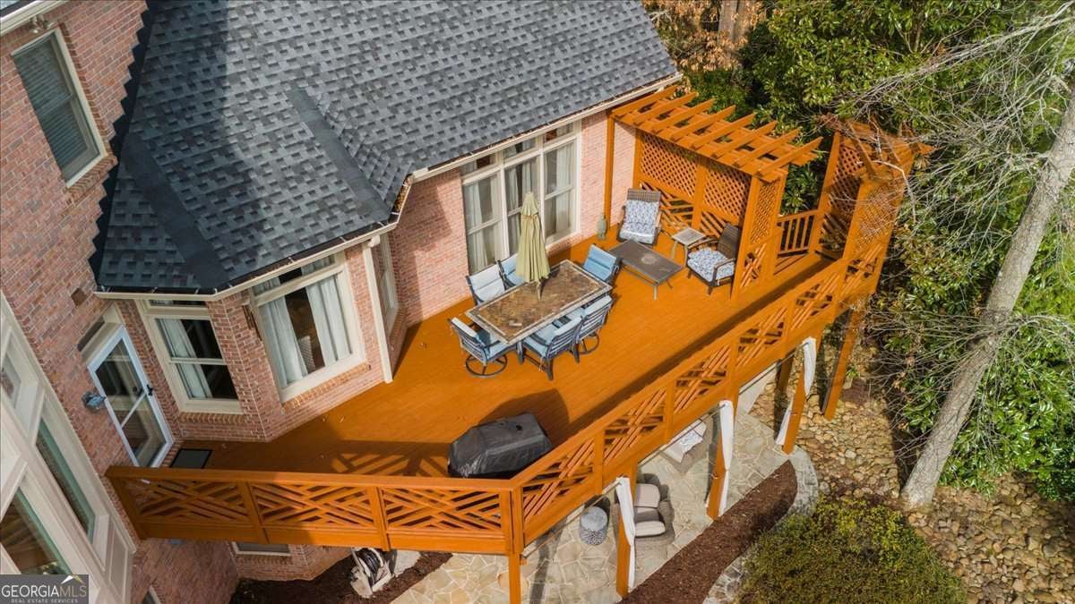 Exquisitely updated 6-bedroom, 5.5-bath, four-sided brick home located on a quiet cul-de-sac in the highly sought-after Falls of Autry Mill. This one-owner home has been meticulously maintained and thoughtfully upgraded throughout and is situated in the final phase built in the community. Every bathroom has been beautifully updated, with the primary bath offering a truly stunning retreat. Conveniently located off the primary bathroom is the laundry room. The spacious primary suite also features a large walk-in closet, fireplace, and custom built-in bookshelves. An ensuite bedroom is located adjacent to the primary suite. Across the hall are two additional bedrooms that share a Jack-and-Jill bath, each with its own private sink and vanity area. The main level includes a guest suite and a separate half bath. The kitchen is exceptional, featuring an extra-wide island, custom cabinetry, designer lighting, Thermador gas cook top, Wolf oven, Sub Zero fridge with panels, Fischer & Paykel dishwasher, and a very large walk-in pantry. A breakfast area opens seamlessly to the keeping room, creating an inviting space for everyday living and entertaining. Besides the powder room on the main level, from the pantry to the garage is another "half bath" area. The finished basement offers a custom full bath, bar/kitchen area, and an additional bedroom currently used as a home gym. Two unfinished rooms provide ample space for mechanicals and storage. Walk out to the backyard, where you'll find a firepit surrounded by lush greenery-perfect for outdoor gatherings. This home offers generous living spaces ideal for hosting large gatherings while maintaining comfort and elegance throughout.