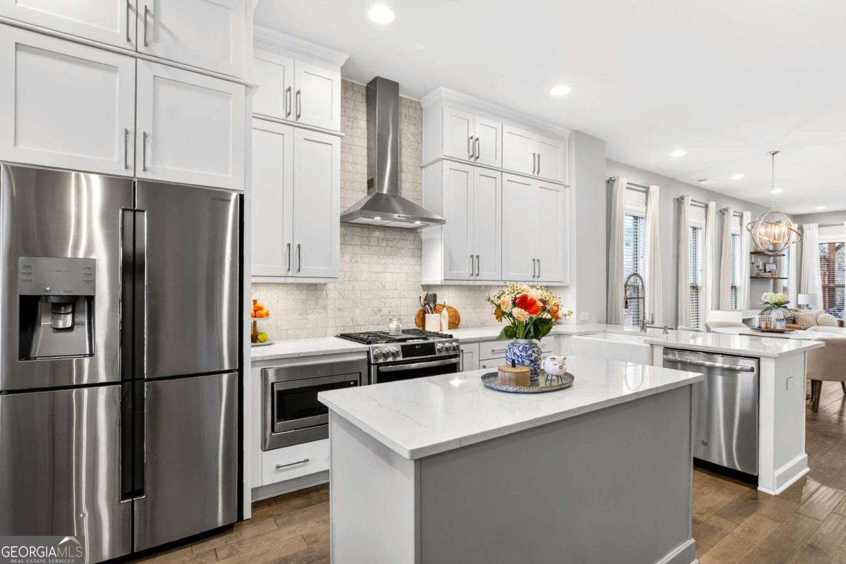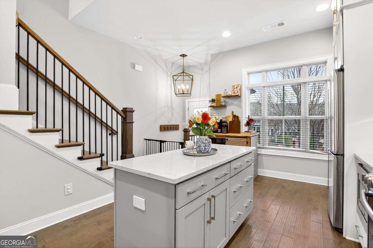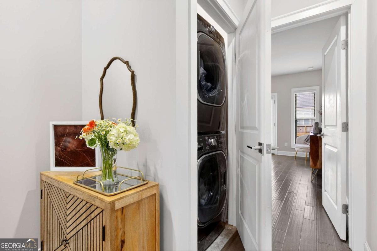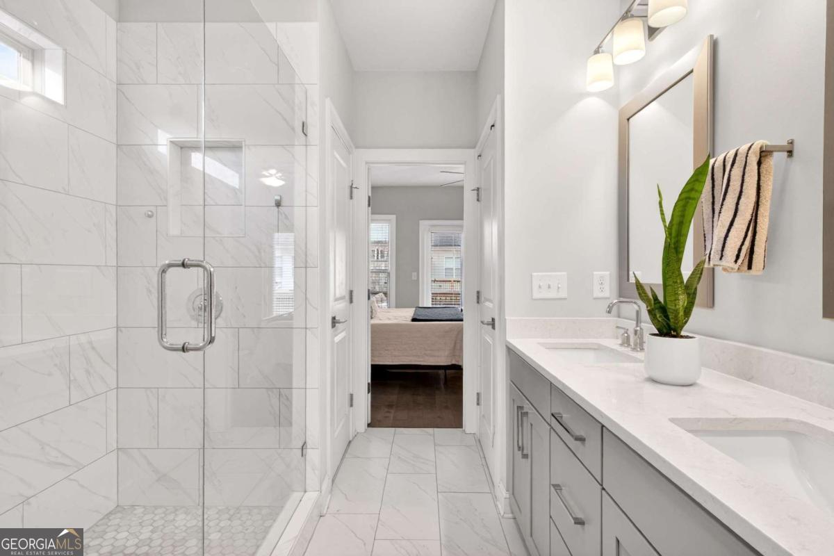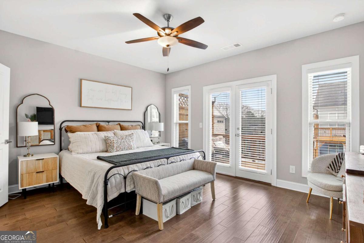 Welcome to 4302 Parkside Place, a stunning end-unit townhome ideally located in the heart of the prestigious Townes at Chastain-a sought-after gated community just minutes from Chastain Park. Built in 2018, this beautifully maintained residence offers an exceptional blend of modern luxury, thoughtful design, and low-maintenance living, enhanced by exceptional natural light from its end-unit position. The bright, open-concept main level showcases 10-foot ceilings, expansive windows, and abundant sunlight throughout. The spacious living area is elevated by custom built-ins and rich custom wood paneling, creating a warm, sophisticated atmosphere ideal for both relaxing and entertaining. The gourmet kitchen is a chef's dream, featuring Cambria Quartz countertops, Wellborn cabinetry with cabinets extending to the ceiling, and premium stainless steel appliances, perfectly blending elegance and functionality. Just off the living room, step onto a covered private deck, offering a peaceful outdoor retreat ideal for morning coffee or enjoying rainy days. Upstairs, two generously sized bedrooms each feature en suite bathrooms, including a luxurious primary suite that opens to a second private deck, providing a private space to unwind. Both bedrooms include walk-in closets, maximizing storage without sacrificing style. The lower level offers a versatile den or home office, ideal for remote work, a media room, or a quiet retreat, adding valuable flexible living space. With 1,801 square feet of thoughtfully designed interiors, this home also includes freshly stained exterior decks, gas heating, and a central HVAC system for year-round comfort. Residents of Townes at Chastain enjoy outstanding amenities including a community swimming pool and BBQ area, all within a secure, beautifully landscaped setting. This turn-key end unit presents a rare opportunity to own in one of Atlanta's most desirable communities, where style, comfort, and location come together seamlessly.