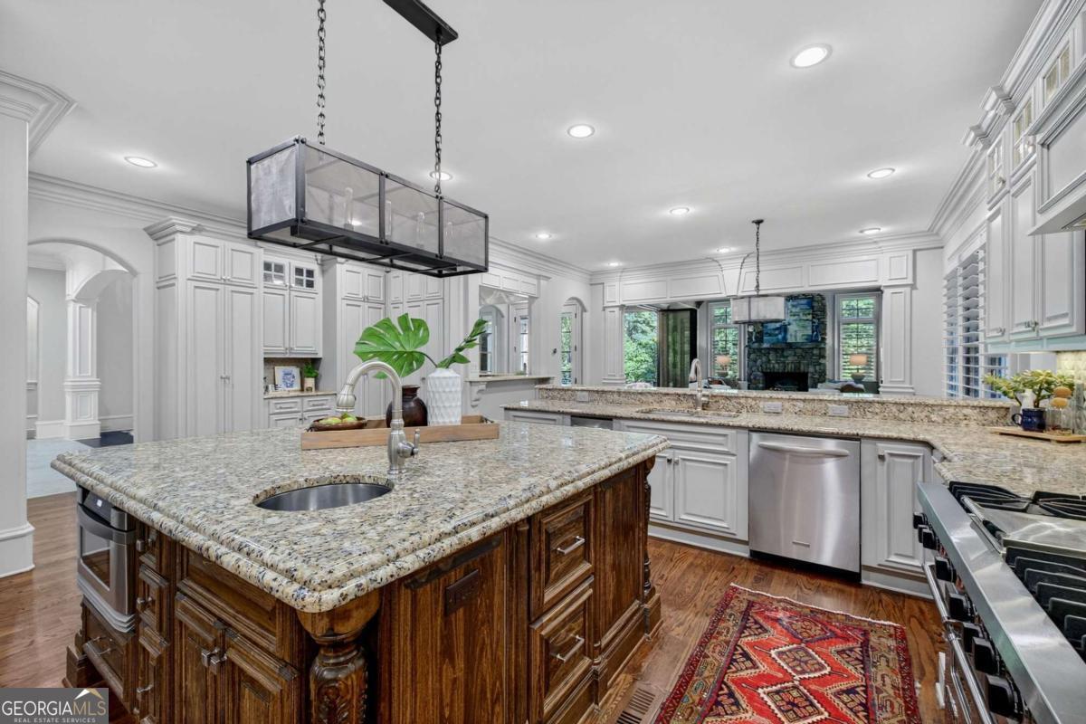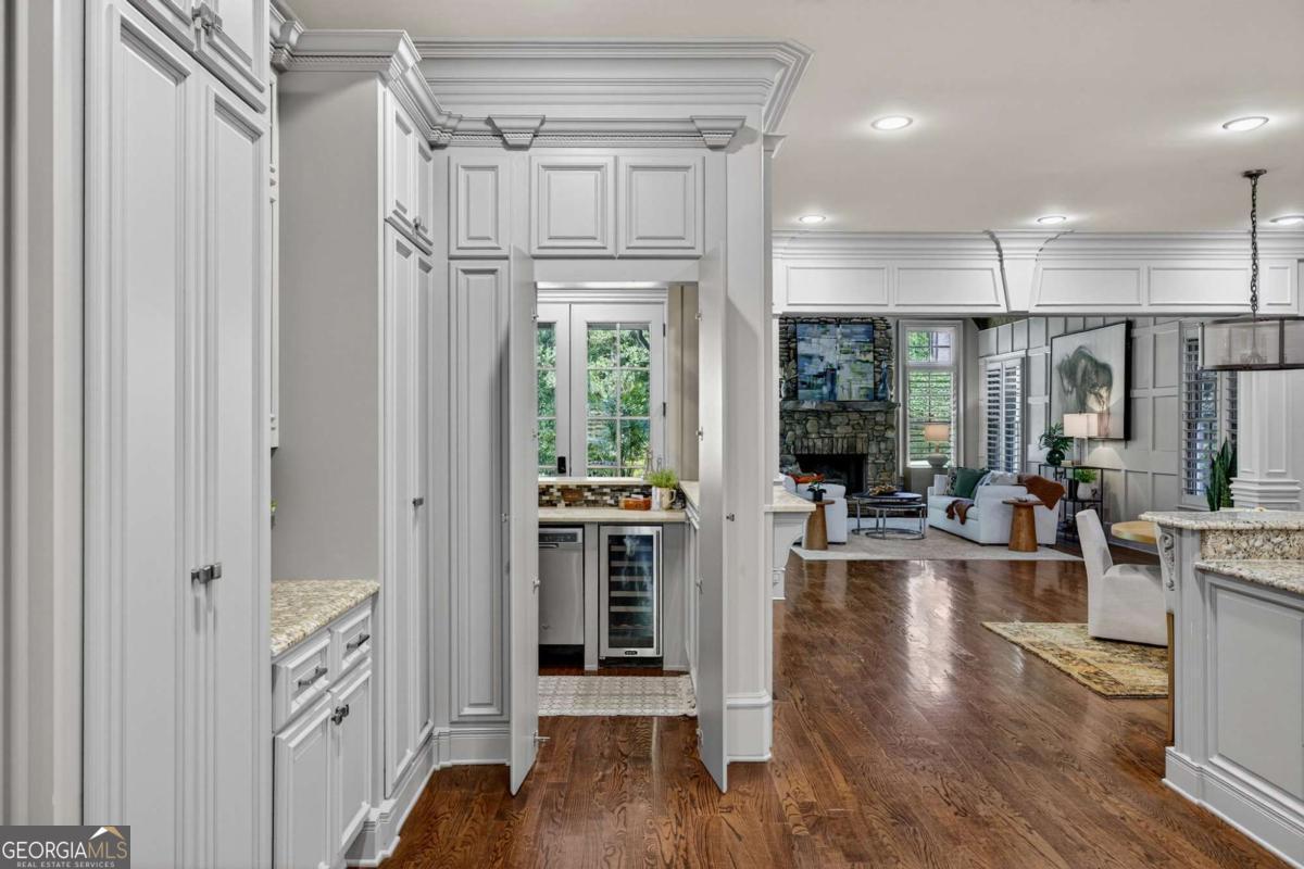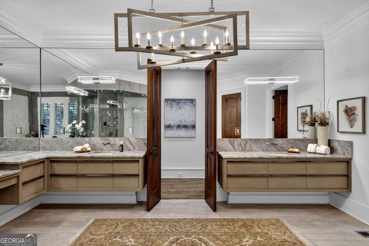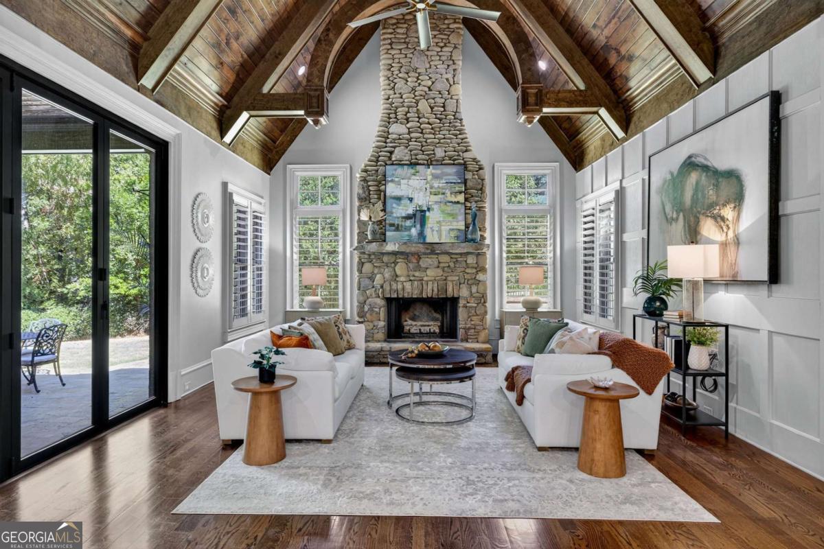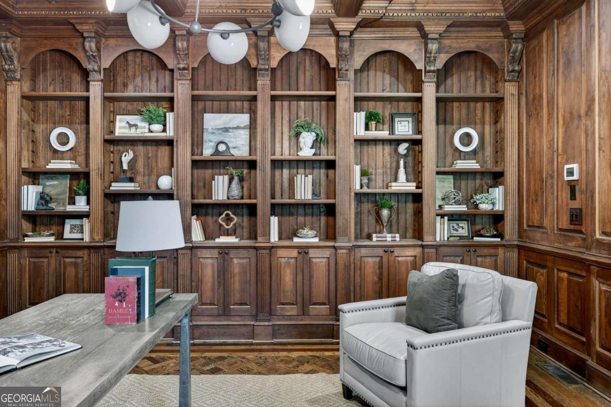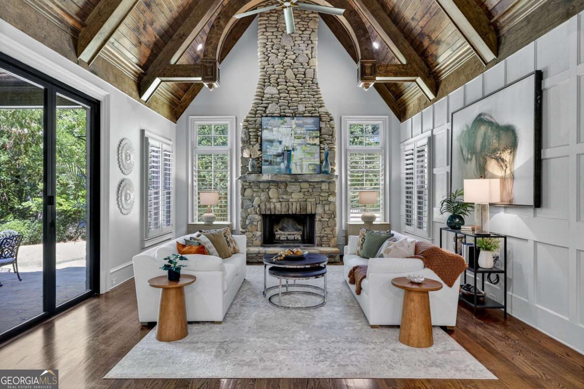 Stunning North Buckhead Residence in The Park at Brookhaven! This exquisite home offers an unmatched blend of elegance, comfort, and convenience, just minutes from the heart of Buckhead. Enjoy proximity to Phipps Plaza, Lenox Mall, Capital City Club, Nancy Creek Park, renowned restaurants, and top medical centers including Emory Saint Joseph and Northside hospitals. Designed with exceptional craftsmanship and attention to detail, this residence features four-sided brick construction and soaring ceilings on all three levels that create a grand and open atmosphere. The main-level primary suite is a private retreat, complete with a renovated spa-like bath and an oversized dressing suite. A two-story foyer opens to a sophisticated wood-paneled office, perfect for work or meetings, and a formal dining room with butler's pantry. The chef's kitchen is a true showpiece, featuring an oversized island with prep sink, Sub-Zero refrigerator, 48" Viking range with six burners and double ovens, and a dedicated bar area with wine cooler, dishwasher, and additional refrigerator. The kitchen flows seamlessly into a dramatic morning room with vaulted beamed ceiling and stone fireplace. Accordion/bi-fold doors open to a covered porch with fireplace, automatic screen, and slate flooring, ideal for year-round entertaining overlooking the private backyard. Additional highlights on the main level include a mudroom, pocket office, laundry room, and two half baths. The upper level offers spacious en-suite bedrooms, a secondary dressing suite, an additional laundry room, and an expansive Au Pair Suite providing privacy and comfort. The terrace level is designed for entertaining with a custom bar, wine wall with cabinetry and shelving, and additional unfinished space for future build-out or storage. With four fireplaces, two laundry rooms, extensive storage, and refined finishes throughout, this home offers the perfect balance of luxury and livability in one of Buckhead's most desirable neighborhoods.