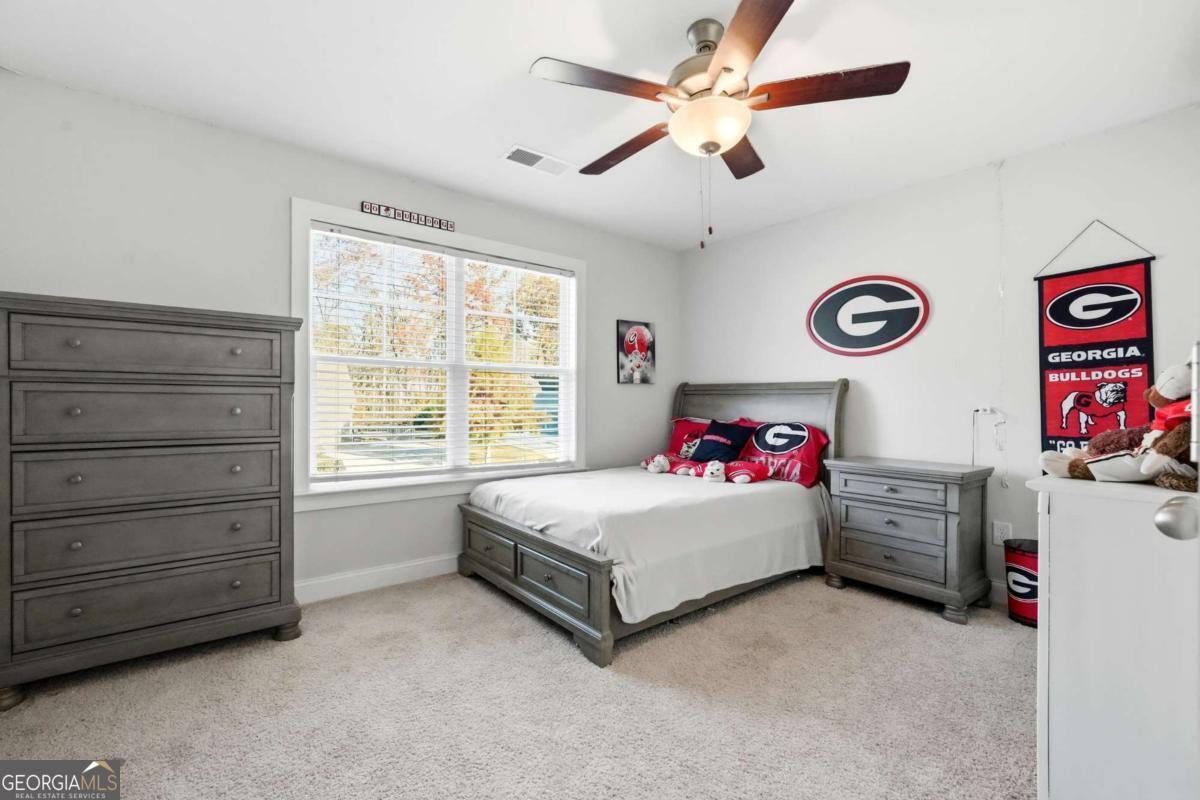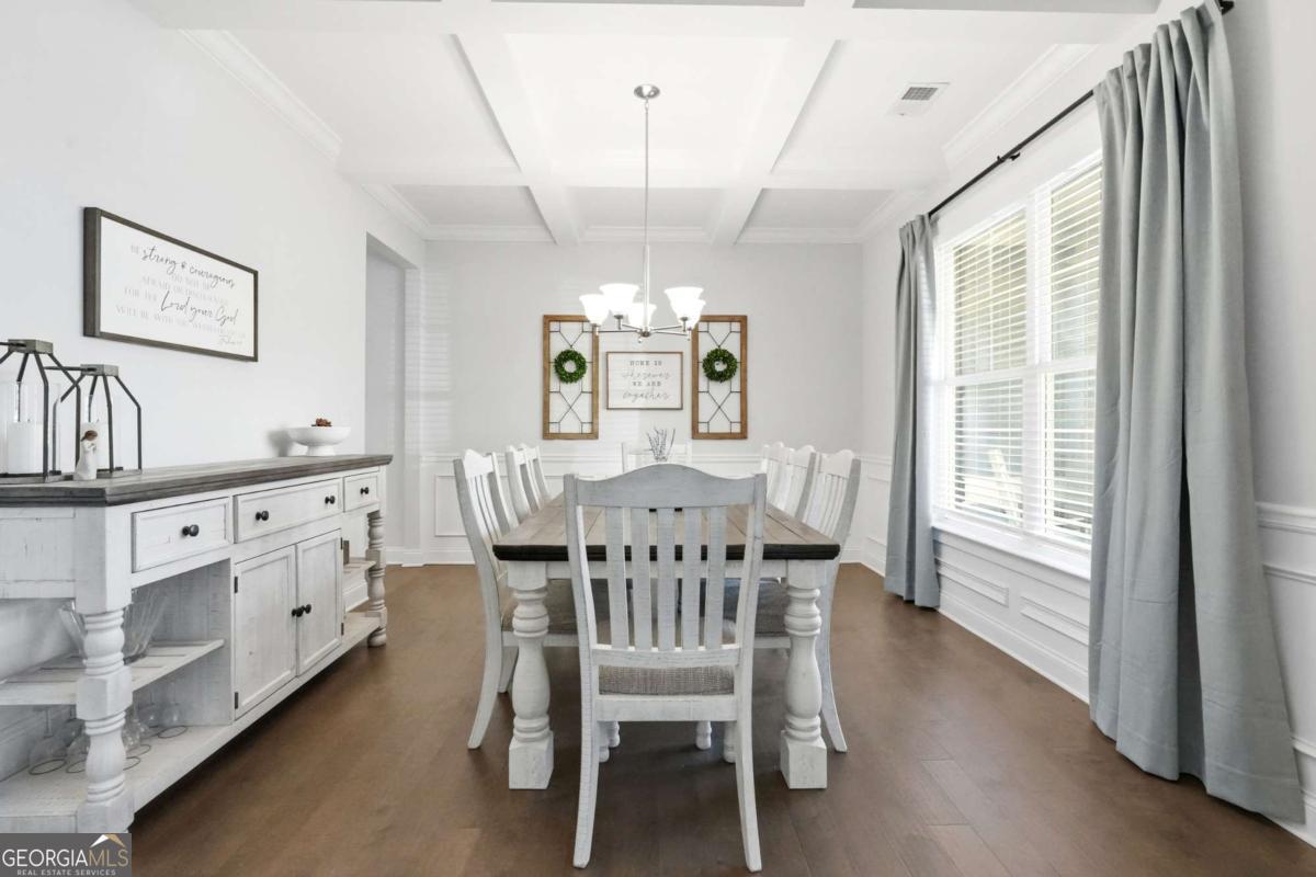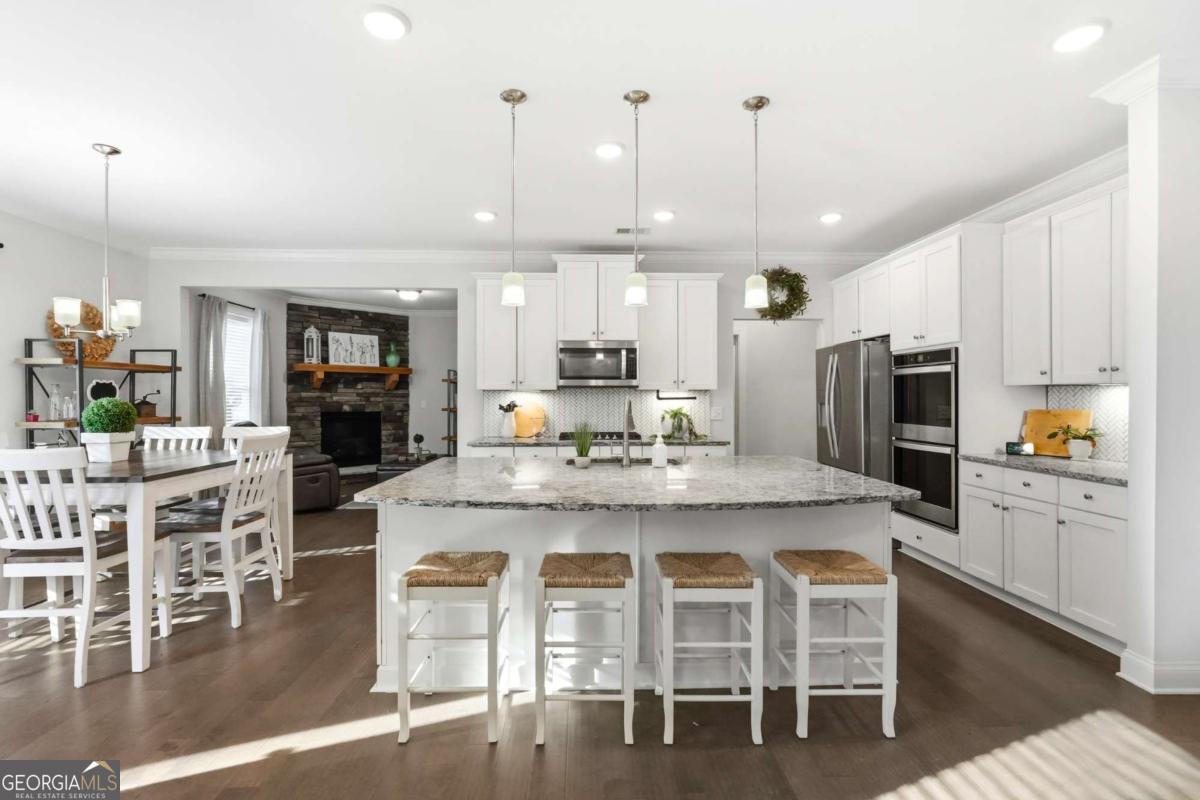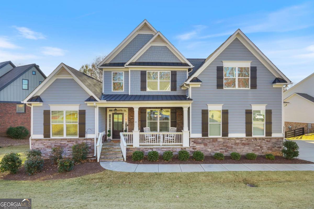 Motivated Sellers!! Beautiful 5-bedroom home in the highly desirable River Rock community-nestled along the Etowah River and zoned for top-rated Forsyth County schools. Built in 2021 and offering an oversized blueprint with 12 foot ceilings in the basement, this home features a primary suite on the main level, boasts an open-concept layout, and luxurious neighborhood amenities rarely found. Main Level - Open living with hardwood floors and abundant natural light - Family room with stacked-stone fireplace and custom beam mantel - White chef's kitchen with granite countertops, double ovens, stainless appliances, oversized island, and walk-in pantry - Keeping room off the kitchen-ideal for a second living space - Formal dining room with coffered ceiling and wainscoting - Primary suite on the main level with vaulted ceiling, spa-like bath with granite countertops, double vanity, soaking tub, walk-in closet, and seperate shower - Main-level laundry room + guest half bath Upstairs you will find - Four spacious bedrooms including an oversized media/bedroom with closet - Two full bathrooms with modern finishes and light pouring in from every aspect. As for the basement and garage you will find... - Enormous walk-out basement with 12-foot ceilings-ready to be finished - 3-car garage with 12-foot ceilings and extra storage Exterior & Lot - Charming craftsman exterior with stone accents - Covered front porch and rear deck overlooking private, wooded yard - Sought after River Rock Community: Enjoy resort-style amenities including: Clubhouse, large pool + kids pool, tennis courts, playground, walking areas along the Etowah River, fire pit, and year-round community events. This beautiful home offers exceptional space, a flexible floorplan, and a premium location within one of North Georgia's most sought-after communities. Don't miss your chance to experience the unbeatable amenities and lifestyle River Rock has to offer.