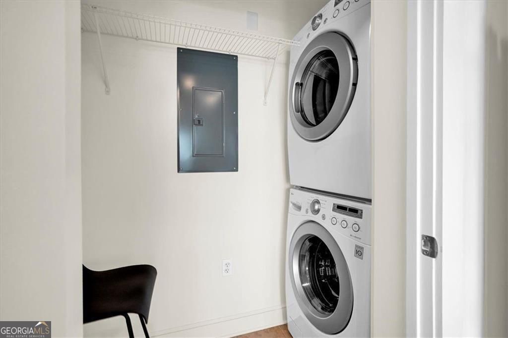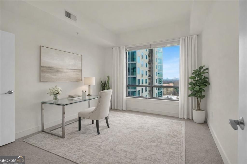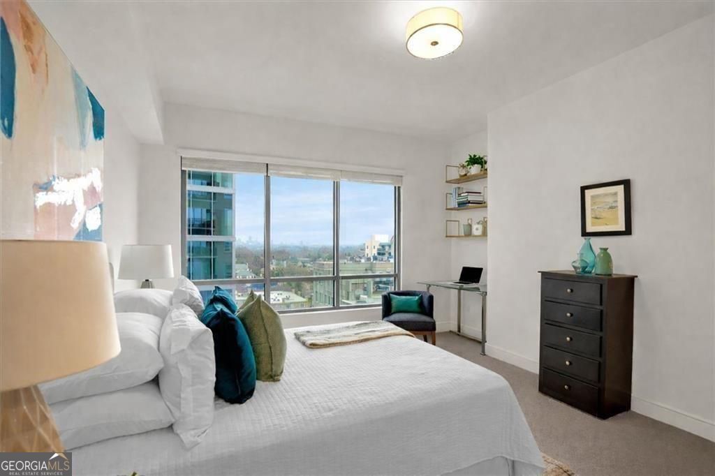 Positioned on the 15th floor of Luxe designed by Niles Bolton, this north-facing residence captures elevated views that extend beyond the surrounding skyline toward Buckhead's evening lights, with side views of Piedmont Park. Situated above neighboring buildings, the home is exceptionally quiet and filled with natural light throughout the day. A private terrace extends the living area outdoors, offering a peaceful retreat to enjoy morning coffee, evening sunsets, or simply watch the seasons change over the park. Luxe was purposefully designed for homeowners transitioning from single-family homes, and this residence reflects that thoughtful planning throughout. Unlike typical condos, the layout includes a proper entry foyer, exceptional storage, and well-proportioned rooms that accommodate full-size furnishings and art. Thoughtful details include extensive built-in cabinetry, a kitchen pantry, dedicated utility closet, linen storage, in-unit full-size washer and dryer, motorized window shades, and two generous walk-in closets. The result is a home where everything has its place, allowing you to maintain an organized, uncluttered lifestyle with ease. The kitchen balances elegant design with serious functionality - stone countertops, Bosch stainless appliances, and a professional gas range serve those who love to cook, while the gracefully curved peninsula creates natural gathering space without disrupting sight lines to the living and dining areas. Hardwood floors flow throughout the main living spaces, while bathrooms feature classic tile work that will remain beautiful for years to come. The primary suite easily accommodates a king-size bed and features a versatile alcove - ideal for a home office or bookcase with treasured collections - without compromising the generous bedroom proportions. The second bedroom is equally well-sized and light-filled, with views extending toward both Buckhead and Piedmont Park. It serves beautifully as a guest room, hobby space, or home office, with room for a full bedroom suite plus desk or sitting area. The home is move-in ready, freshly painted in soft neutral tones, with new plush carpeting in both bedrooms. 2 assigned side by side parking spaces in the secured garage provide exceptional convenience - invaluable in Midtown - with additional guest parking available for visitors. The building is known for its warm, attentive concierge team who graciously serve residents. Luxe delivers a true lock-and-leave distinguished lifestyle with 24-hour concierge, on-site management, and secure building access. Top-caliber amenities include a saltwater pool, well-equipped fitness center, elegant clubroom with catering kitchen for private entertaining, massage room, sauna, steam room, guest suite for overnight visitors, and a 6th-floor terrace with a walking loop, dog area, grilling patio, and outdoor lounges. Positioned directly at Piedmont Park - Atlanta's most celebrated urban greenspace - amid Midtown's finest dining, Woodruff Arts Center, Piedmont Hospital, and MARTA, this residence offers a rare combination: sophisticated city living with the best amenities, all without the burden of home maintenance. Schedule your showing today. Investor friendly - rental permits available for long term rentals - can be rented out.