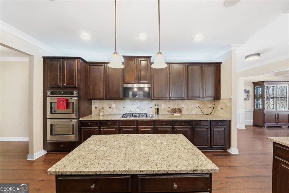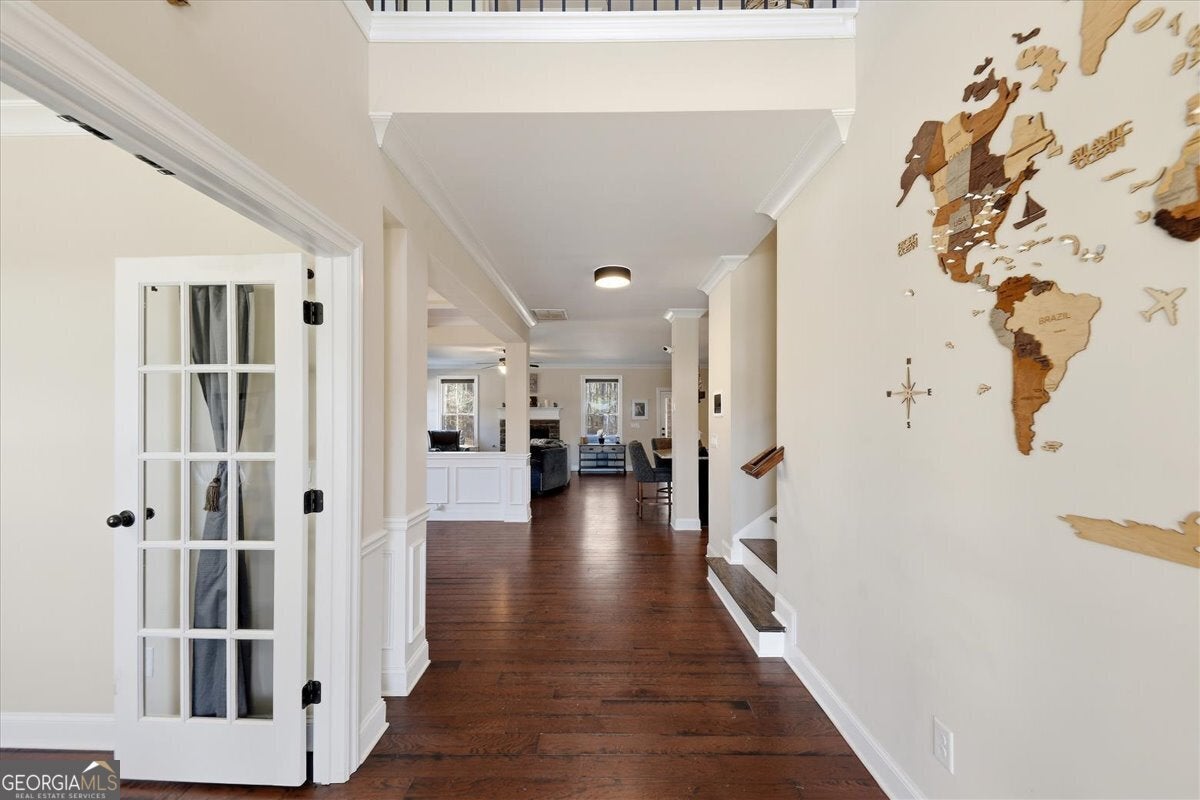 Pristine brick and stone executive home nestled on a premium, pool-ready .72-acre wooded lot in the exclusive, gated Castille community of West Forsyth. Tucked away on a quiet cul-de-sac, this exceptional residence offers over 4,600 sq ft with 5 bedrooms, 4 full baths, and a 3-car garage-perfectly blending luxury, privacy, and everyday functionality. Incredible curb appeal welcomes you with a stately brick facade, stone accents, and inviting covered front porch. The open-concept main level features hardwood floors throughout, a formal dining room with coffered ceiling and detailed trim, a flexible living/office space or a guest bedroom with full bath. The chef's kitchen is the heart of the home, boasting stone countertops, dark cabinetry, tile backsplash, stainless appliances, double ovens, center island with breakfast bar, and a spacious walk-in pantry. The kitchen flows seamlessly into the breakfast area, keeping room, and expansive family room-each offering cozy gas fireplaces and walls of windows overlooking the private backyard. Enjoy effortless indoor/outdoor living in the enclosed three-season sunroom with views of the expansive fenced yard. Upstairs, the oversized owner's suite impresses with a sitting area, tray ceiling, spa-like bath with whirlpool tub, separate shower, double vanities, and oversized his-and-hers walk-in closets outfitted with California Closet systems. Three additional generously sized bedrooms, a large loft area, and a convenient upper-level laundry room with sink, counters, and cabinetry complete the upper floor. An abundance in recent upgrades make this home truly turnkey, including a new roof, new HVAC system, electrical panel replacement with sub-panel addition, whole-home water softener and filtration system with warranty, reverse osmosis system at the kitchen sink, engineered hardwoods upstairs, hardwood stairs, secondary bedrooms with new closet systems installed and a newly cleared yard with fencing. This Highly Coveted gated West Forsyth Neighborhood of Castille is an Exclusive Small Community of Only 37 Executive Homes Privately Tucked Away Yet Extremely Convenient Ideally located just minutes from Vickery Village, Halcyon, The Collection, GA 400, Hwy 20, Northside Forsyth Hospital, golf and country clubs, and top-rated Forsyth County schools offering advanced STEM programs. Prestigious Alpharetta address with Forsyth County taxes. This exceptional home offers luxury, privacy, and unbeatable convenience-an absolute must-see