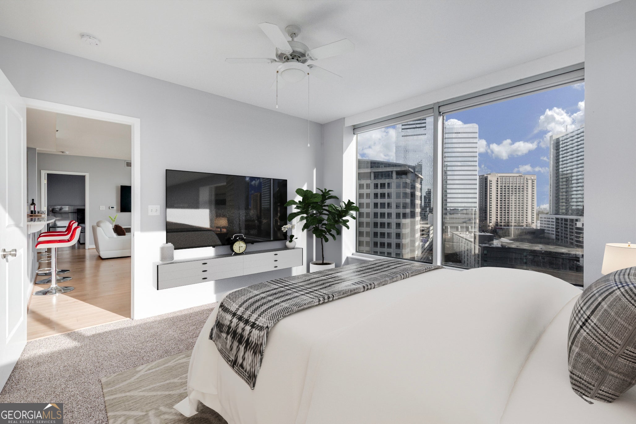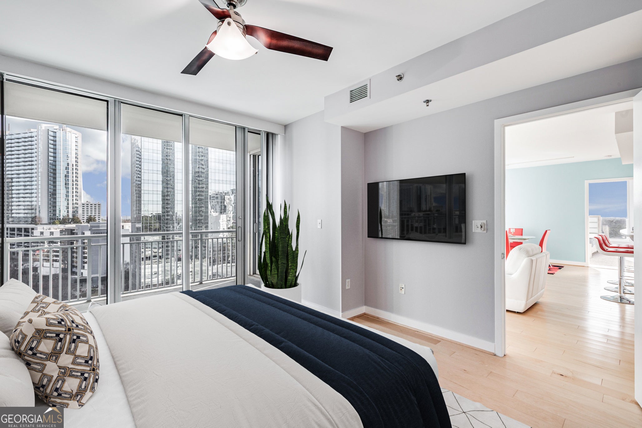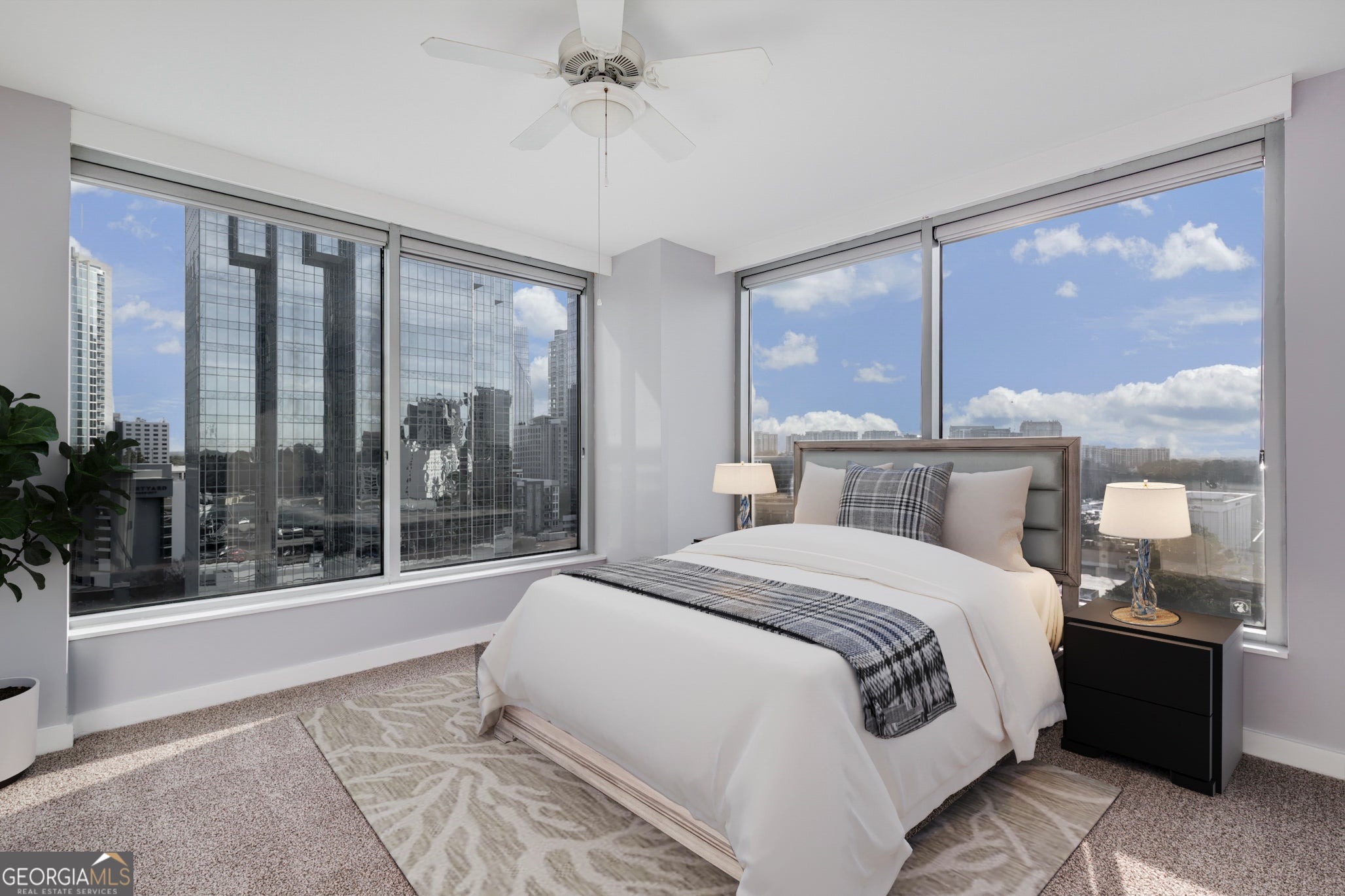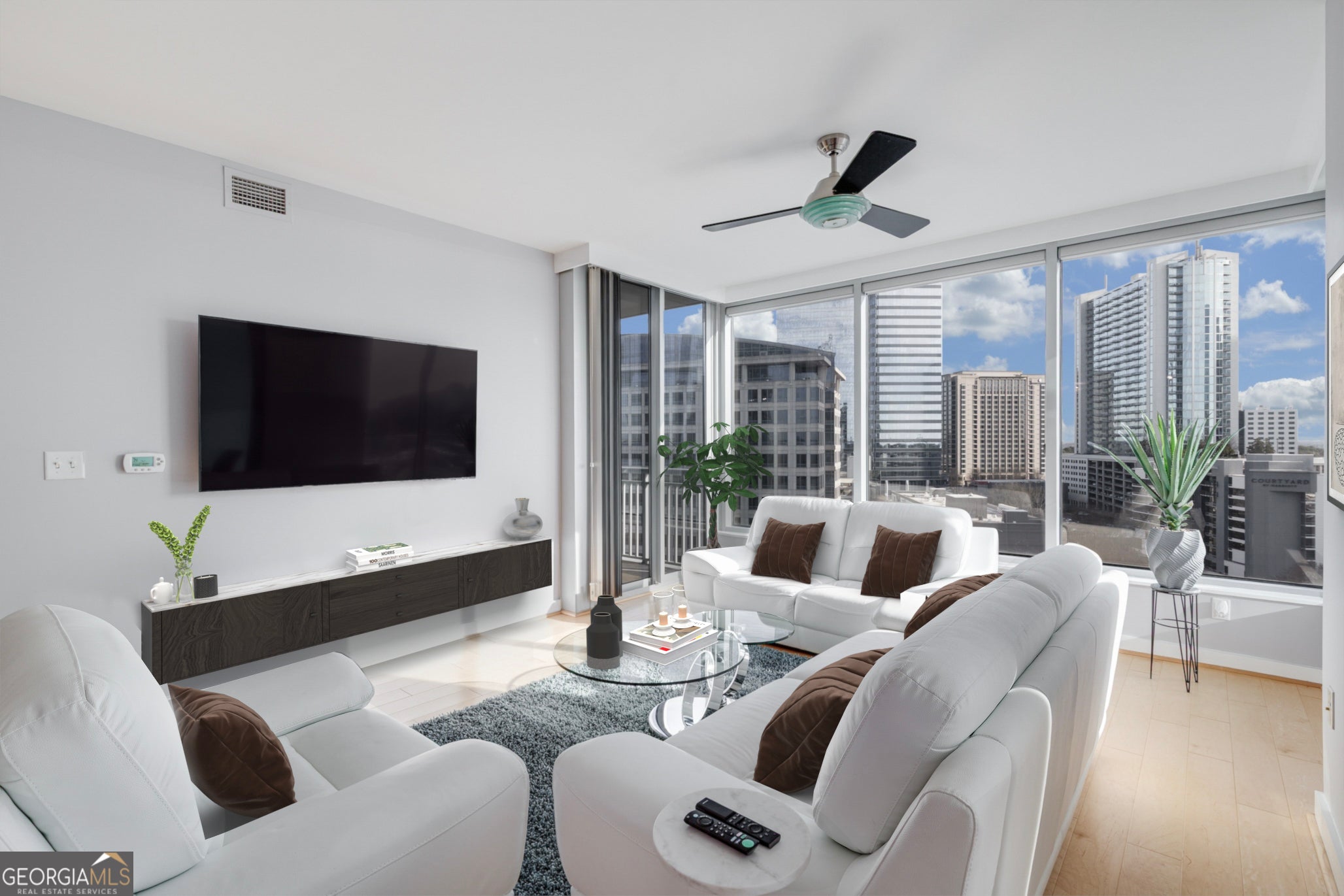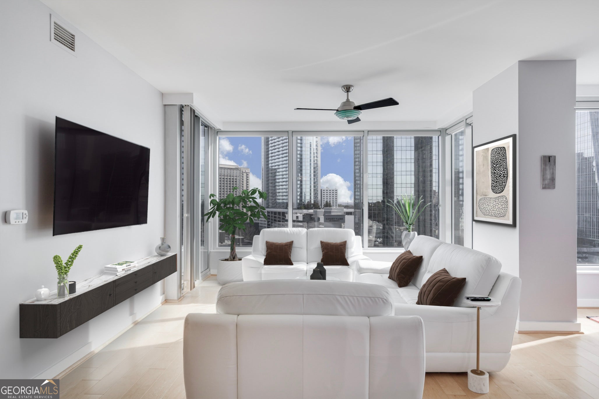Perched high above the pulse of the city, this rare, coveted corner residence at Buckhead Grand is a true expression of Atlanta's most elevated high-rise living. Set in the heart of the Tower Place District, this premier address places you just steps from Buckhead's finest dining, luxury retail, shopping, and restaurants-offering a lifestyle that is as effortless as it is refined. Behind the doors of this beautifully reimagined home, a thoughtful modern renovation unfolds with significant updates completed within the last three years, curated for the most discerning eye. Sunlight pours through floor-to-ceiling glass, showcasing breathtaking skyline views that feel cinematic from every room-transforming the city into an ever-changing backdrop of beauty and energy. Designed with intention and elegance, the residence offers a rare combination of openness and definition-anchored by a graceful entry foyer and a highly desirable powder room, a feature not found in most two-bedroom layouts. The living and dining spaces flow seamlessly, creating the perfect setting for hosting and everyday living alike. A generous separate dining area adds a level of scale and sophistication rarely offered in high-rise living. The kitchen is sleek, elevated, and quietly luxurious, appointed with oak cabinetry, updated quartz countertops, stainless steel appliances, with a gas range, complementing the home's clean contemporary aesthetic. Oak hardwood floors throughout add warmth and continuity, enhancing the sense of timeless design. Offering 2 bedrooms and 2.5 bathrooms, both bedrooms are designed as true private suites, each featuring its own en-suite bath and walk-in closet-a rare level of comfort and privacy for residents and guests alike. The primary suite is an indulgent retreat, complete with direct balcony access and breathtaking views that elevate every moment. The fully updated primary bath brings a spa-like experience home with new tile flooring, a newly tiled shower, and double vanities with updated countertops, creating a space that feels both serene and luxurious. Step outside to the large private balcony, where the skyline stretches wide and the city feels like it belongs to you. This is where mornings begin slowly, where sunsets become a daily ritual, and where Atlanta's most iconic views surround you in absolute beauty. A dedicated laundry room with washer & dryer, along with newer HVAC and water heater, adds convenience and peace of mind. Buckhead Grand completes the experience with a true 5-star amenity package, including doorman/porter, 24-hour concierge, resort-style pool and pool bar, sky lounge/bar, fitness center, spa room, guest suite, and dog walk-delivering an elevated lifestyle defined by service, prestige, and effortless sophistication. This home is skyline-wrapped statement, a rare corner residence where luxury, light, and location converge in one unforgettable Buckhead offering.
