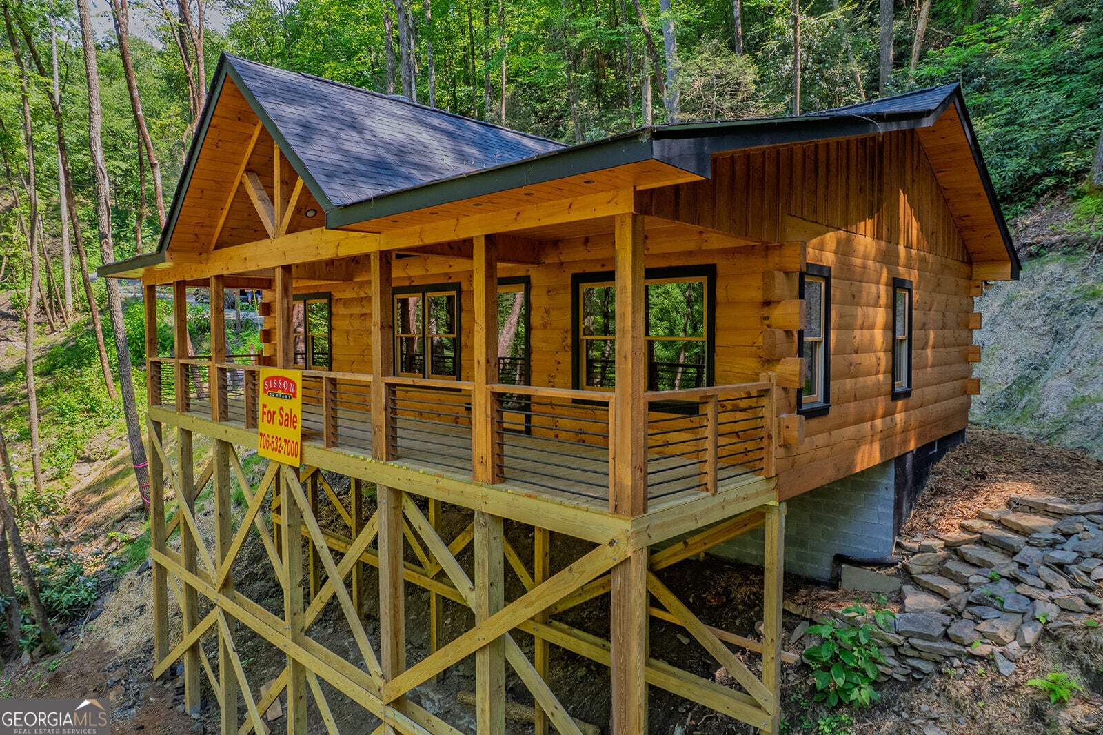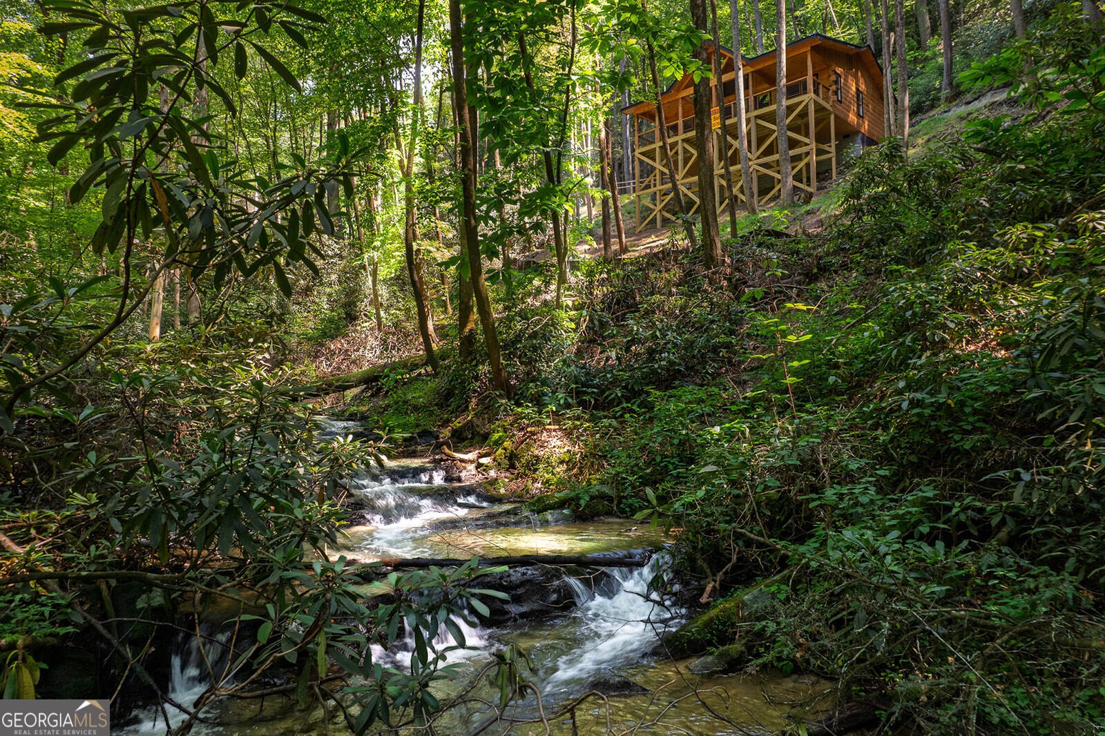 Tucked away on 1.2 picturesque acres with direct frontage on Laurel Creek, this authentic log cabin offers the perfect blend of rustic charm and peaceful waterfront living. Set along the roaring rapids of Laurel Creek, the home features a full-length covered porch-an ideal spot to relax, listen to the water, and take in the natural surroundings year-round. Inside, the soaring great room showcases dramatic exposed beams, rich wood finishes, and a warm wood-burning fireplace that anchors the space. The open floor plan flows seamlessly into the kitchen, where you'll find custom cabinetry, granite countertops, and plenty of room to gather, cook, and entertain. Designed with a split-bedroom floor plan, the layout offers privacy and flexibility. A spacious bedroom and full bath on each side of the great room makes this home perfect for hosting guests, multi-generational living, or creating a private retreat for family and friends. Whether you're seeking a full-time residence, weekend getaway, or investment opportunity, this creekfront log cabin delivers timeless character, soothing water views, and a true connection to nature-all just steps from Laurel Creek.
