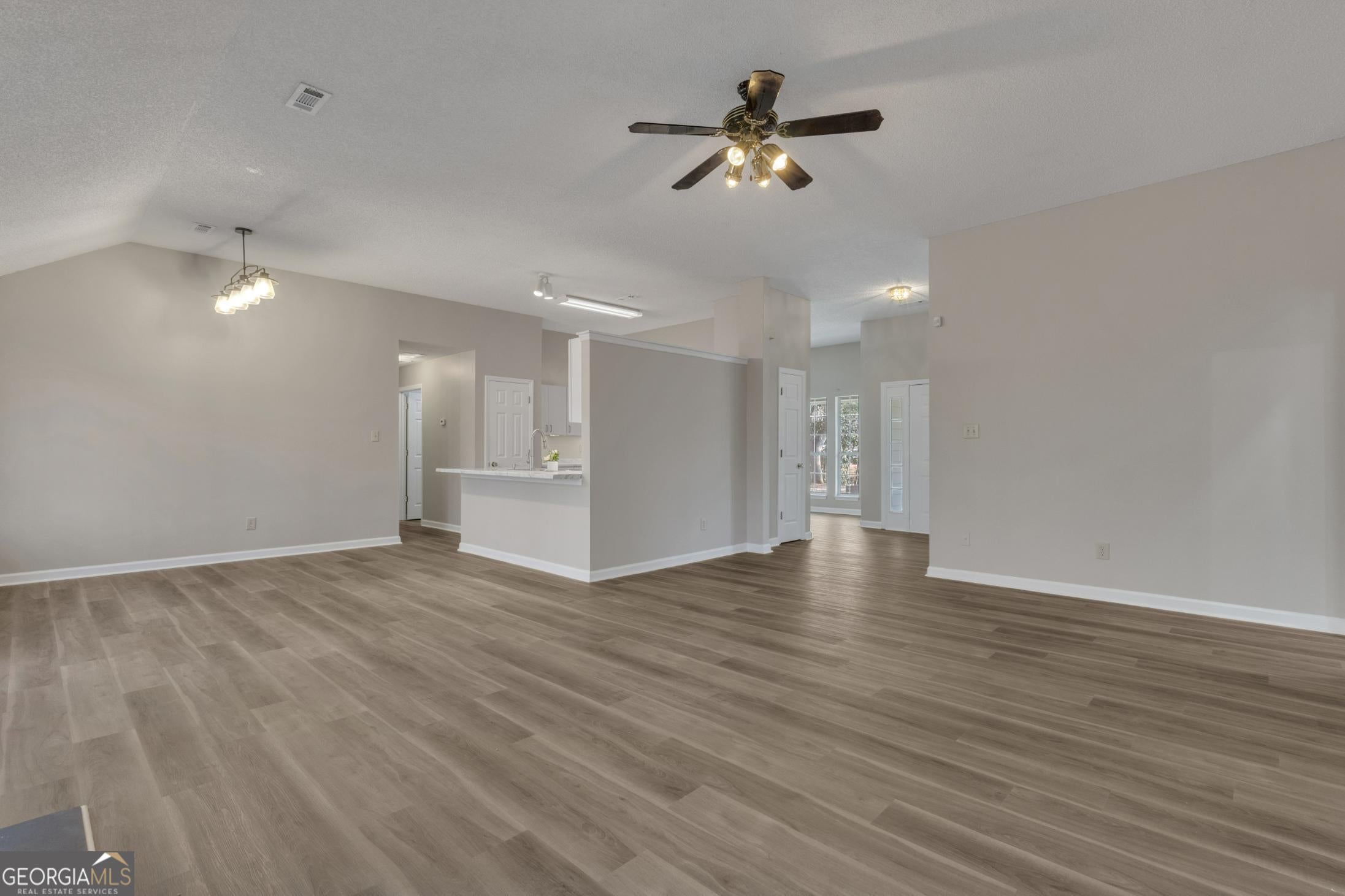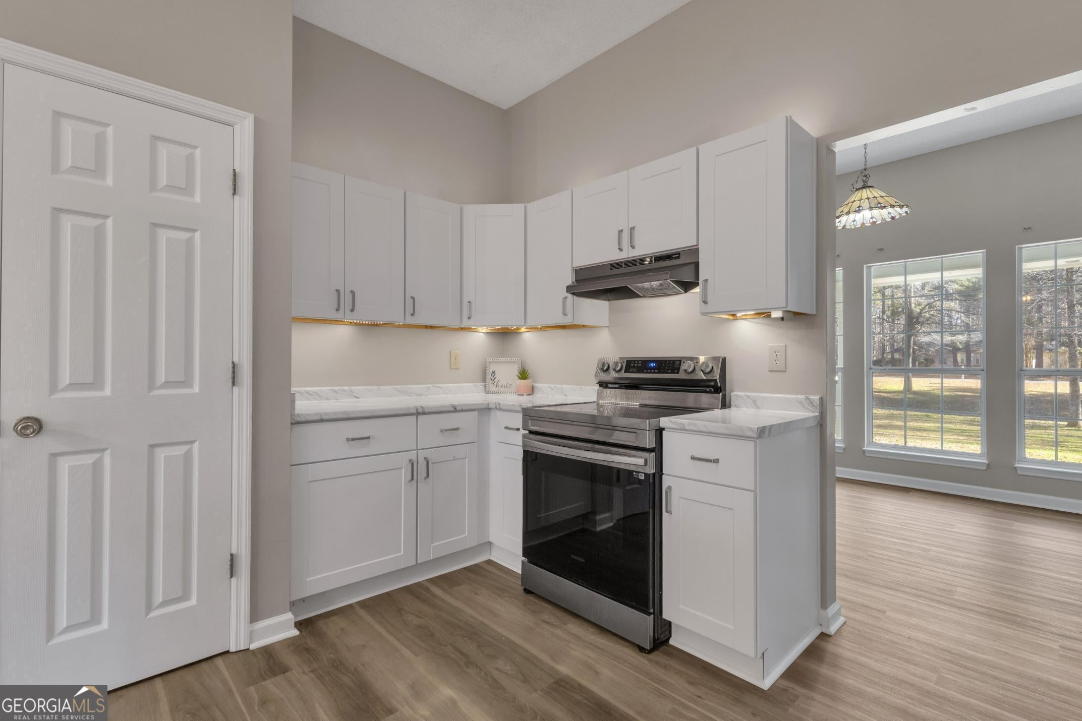 Welcome home to this beautifully refreshed 3-bedroom, 2-bath ranch offering 1,872 sq ft of comfortable, single-level living in Coweta County. Nestled on a peaceful, wooded lot, this home combines privacy with a bright, open interior designed for everyday living and easy entertaining. Step inside to a spacious, open-concept layout featuring vaulted ceilings, LVP flooring throughout the main living areas, and abundant natural light. The family room is anchored by a cozy fireplace and flows seamlessly into the dining area and updated kitchen. The kitchen showcases white cabinetry, stainless steel appliances, and a functional peninsula with bar seating-perfect for casual meals or hosting guests. The primary suite offers a relaxing retreat with a double-vanity bathroom, soaking tub, separate shower, and a large walk-in closet. Two additional bedrooms provide flexibility for guests, a home office, or growing households. Both bathrooms feature updated finishes that feel fresh and timeless. Additional highlights include a laundry room, neutral paint throughout, and thoughtful updates that make this home truly move-in ready. Enjoy the serene outdoor setting from the comfort of your own yard, surrounded by mature trees and natural beauty. Conveniently located with easy access to shopping, dining, and schools, this well-maintained ranch offers space, style, and functionality all on one level.