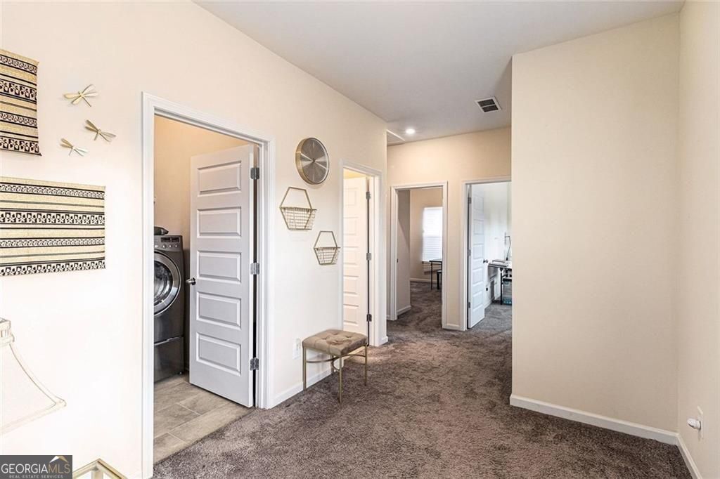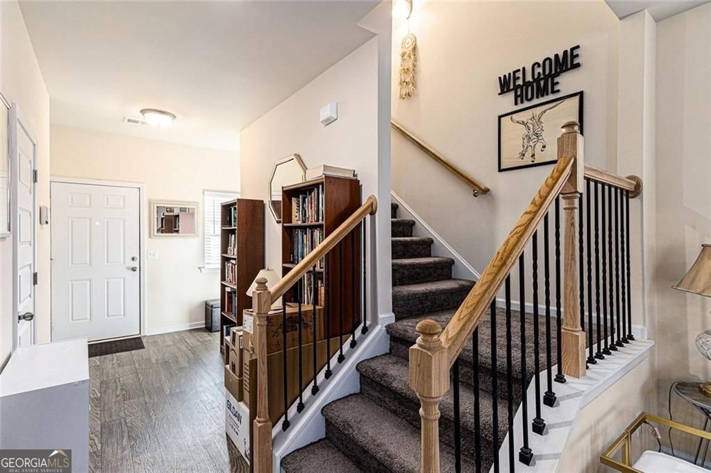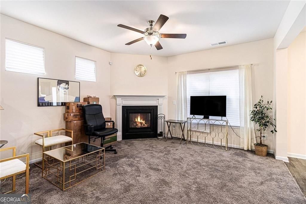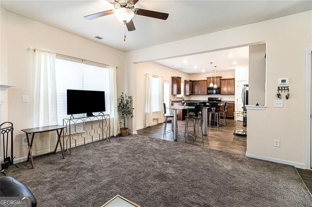 THIS IS THE ONE! Like-new 3-bedroom, 2.5-bath home in Stiles community-truly move-in ready. A covered front porch opens to an extra-wide foyer featuring two coat closets and a convenient guest powder room. The entire main level boasts gorgeous LVP flooring and soaring 9ft ceilings, creating an open, light-filled living space. The family room is anchored by a fireplace and flows seamlessly into the kitchen, complete with black appliances, gas range, built-in microwave, LG 4 door large capacity refrigerator with 2 ice makers, walk-in pantry, granite countertops, stained cabinets, and a spacious island with pendant lighting. Step outside to the 10x12 patio with natural gas hookup, a blank canvas for future outdoor living. Upstairs, carpeted stairs with decorative iron railing leads to a versatile loft area and a spacious laundry room complete with LG front load pedestal washer/dryer and built-ins ready for your personal organization style. The second floor continues the open feel with 9ft ceilings and abundant natural light. Two generous sized secondary bedrooms share a full bath with ample counter space, while the private primary suite at the end of the hall impresses with deep tray ceilings, a large walk-in closet, and a spa-like bath featuring double vanities, a separate tub and shower, and a private water closet. The HOA includes a pool and playground, with more amenities coming soon. Conveniently located near I-75, Downtown Cartersville, Lake Allatoona, LakePoint Sports, and a variety of shopping and dining options. Schedule your tour today! $8K Closing Cost with list price offer.