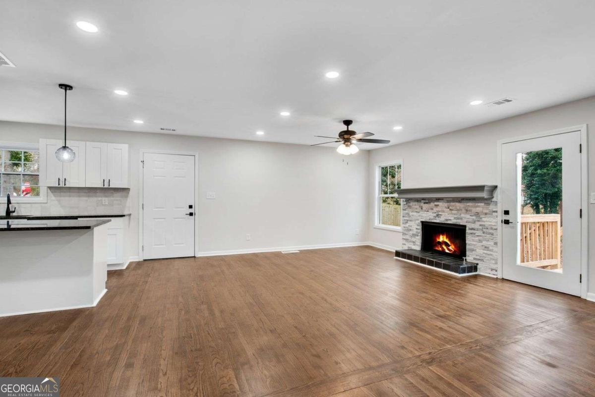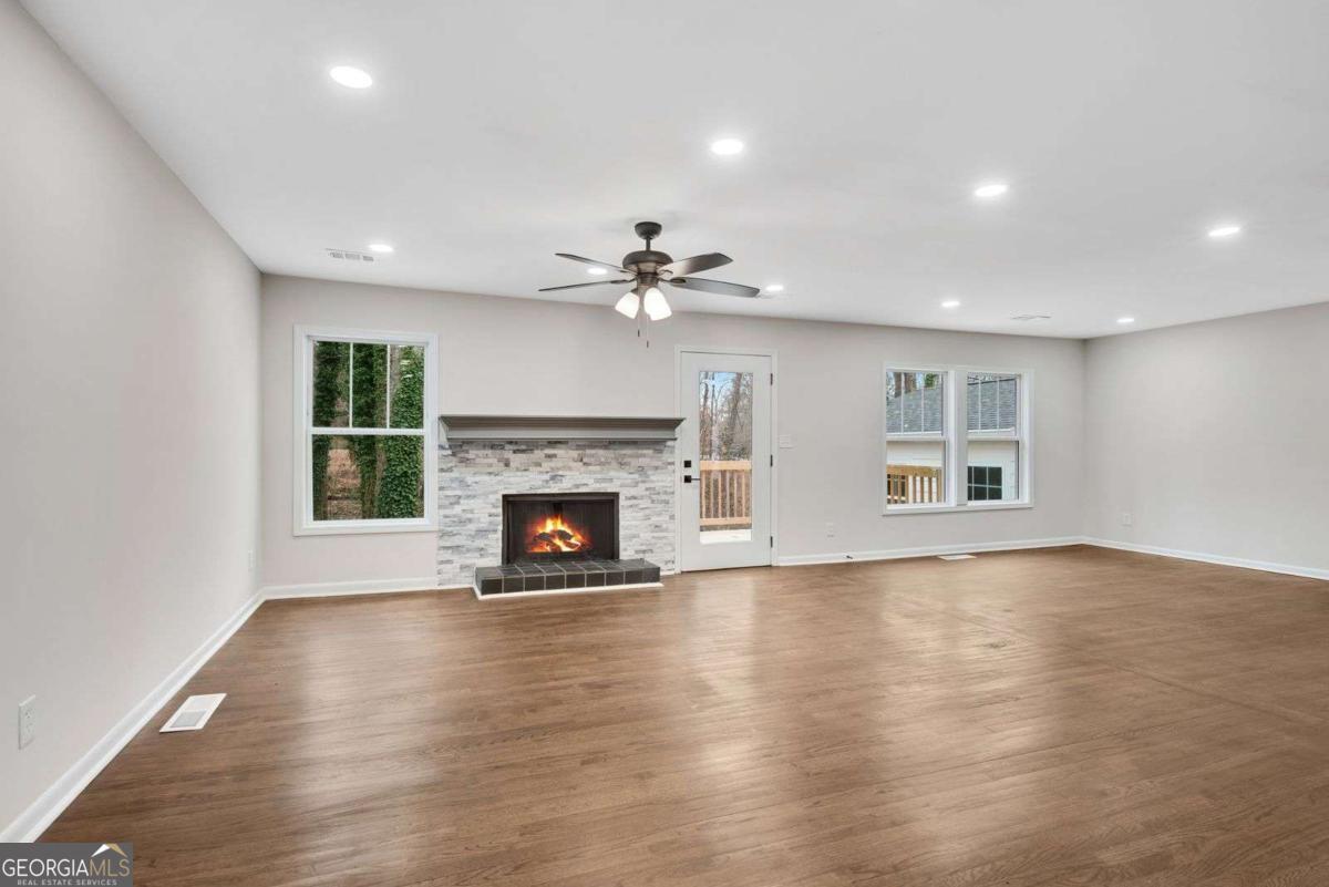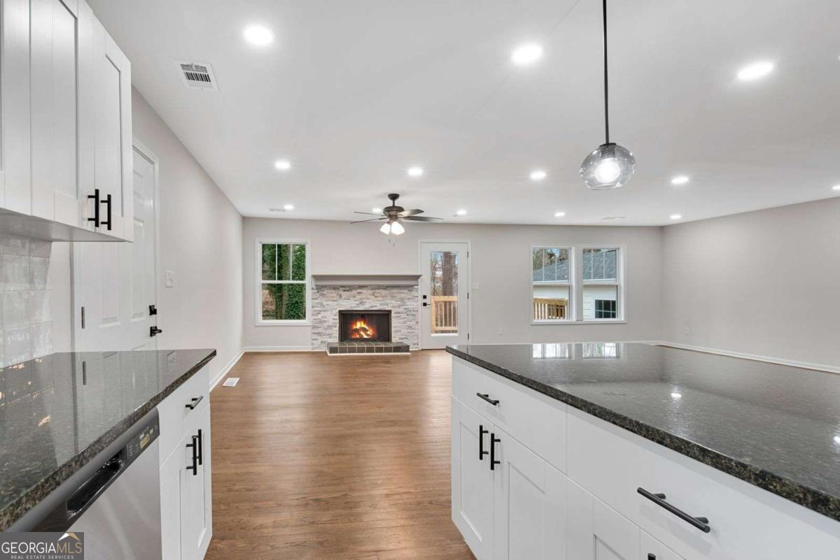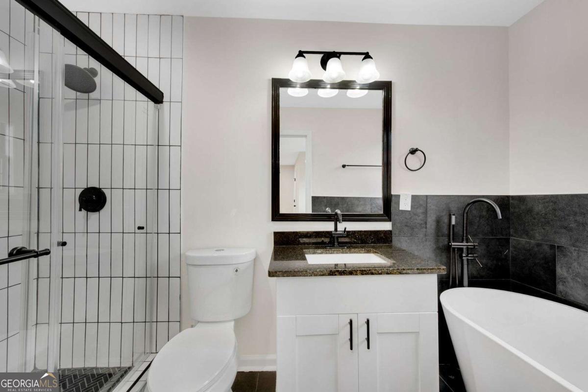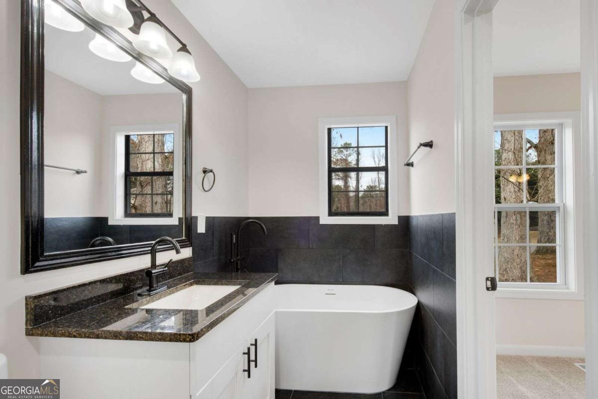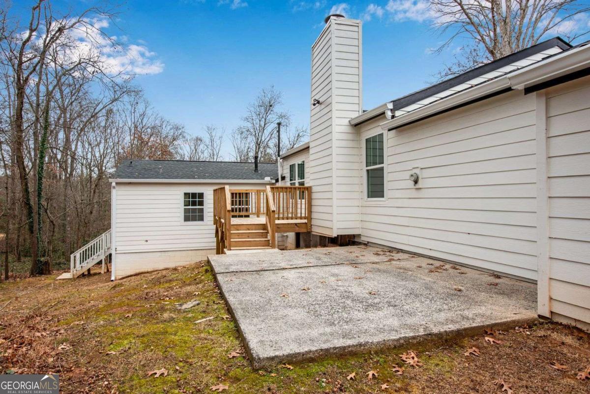 Beautifully updated home w/ 2 car garage in fantastic West Cobb area just minutes to West Cobb Avenue, tons of shopping, gyms, grocery stores, fabulous schools, and great restaurants all along Dallas Highway! From the new front porch deck, step into this open concept home with tiled cozy entrance foyer that has a coat closet & a bump out making it perfect for a mudroom! Spacious main level has views of the kitchen & many areas to create your own defined spaces! Living room has a beautiful stone fireplace w/ surrounding window & glass door that leads to a new back deck & concrete patio great for outdoor entertaining! Dining room has plenty of space for a large table and is the perfect place to gather. Kitchen is tucked away on the other side and showcases new white shaker cabinets, granite countertops, light colored tiled backsplash, new stainless-steel appliances, new sink, new fixtures, & black hardware! Kitchen island has overhang for bar seating & extra storage! Laundry is conveniently located in this main common area. The garage door is next to the kitchen making bringing in groceries a breeze! Head downstairs to discover the spacious primary bedroom that has a walk-in closet & private bathroom featuring a soaking tub, new vanity w/ granite countertop, ceramic tiled floors, & walk-in tiled shower. Secondary bedroom is across from the primary bedroom. There is a second full matching bathroom at the end of the hall that has easy access for guests. Third & fourth bedrooms are super unique as they both connect to a second living room that has outdoor access to a covered back porch w/ stairs going down into the backyard. This bonus space could easily be a home office, a second lounge area, a playroom, a game room, or a craft/hobby room as it has endless possibilities to suit your needs! Fourth bedroom has its own private full bathroom ensuite. This home is located in an established neighborhood with a low maintenance front yard & a wooded backyard. Complete w/ all new light fixtures & fans, new flooring throughout, both interior & exterior fresh paint, new water heater, new vapor barrier, new insulation, new doors, & new windows, this home gives you a piece of mind for years to come.