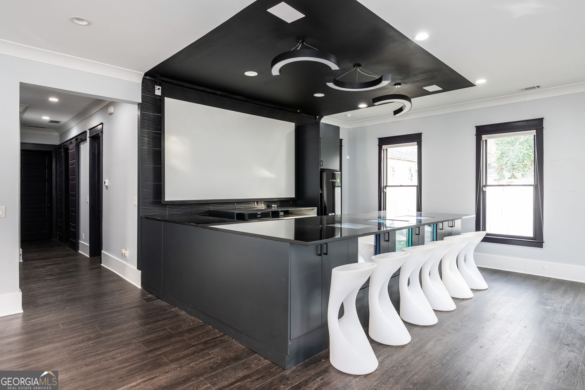 Set within the ever-coveted Brookhaven community, this striking modern residence delivers refined opulence with an unmistakably edgy architectural presence. Clean lines, contemporary design, and elevated finishes define more than 5,500+/- square feet of thoughtfully curated living space. Durable luxury vinyl plank flooring flows effortlessly throughout the home, complimented by designer light fixtures, an upgraded trim package, custom-built-ins, and a fully integrated recessed lighting plan that enhances the sleek design while delivering refined style and everyday functionality. Encouraging organization and efficiency, the main level features a dedicated home office outfitted with custom built-in desks, cubbies, smart storage solutions, and convenient drop zones. This generous plan features an oversized formal dining room that gives way to the central great room and gourmet kitchen. The sunlit living space sets the tone with a striking tile accent wall, custom shelving, and built-in cabinetry flanking a sleek electric fireplace, creating a warm yet modern gathering space. Anchored by the opulent kitchen, this culinary dream features an oversized island, premium appliances, abundant cabinet space, and custom pantry. The adjoining breakfast room currently offers modern, suspended egg chairs adding a unique touch of flare, before extending into the spectacular sunroom complete with 360' of built-in bench storage, perfect for year-round enjoyment. Upstairs, the layout converts to a split-level style with the perfect flex space---the oversized bonus room stuns with custom built-in Murphy beds and cabinetry, creating the ideal guest space, playroom, or lounge. Ascend to the upper level where generously sized bedrooms provide comfort and privacy. The primary suite stands out amongst the rest with a private balcony, custom closet, and lavish primary bath with all the expected upgraded amenities. The fully finished terrace level elevates entertaining to the next level, showcasing a sports-club-inspired bar complete with a built-in big screen TV and open to the billiards room. This daylight basement continues to serve with a mini-gym or optional bedroom suite, potential theatre room and ground-level patio allowing for extended entertaining space. Completely fenced, the private rear yard enhances the overall desirability. Elevating this homes total package, notable features that can't be overlooked include energy-efficient features such as solar panels, multi-zone HVAC, and a tankless water heater. From the tranquil exterior water feature to the meticulously landscaped grounds, every detail has been designed to impress. This is a rare opportunity to own a bold, upscale home that seamlessly blends modern luxury, functionality, and style in one of the most sought-after neighborhoods. Welcome to Brookhaven !!!
