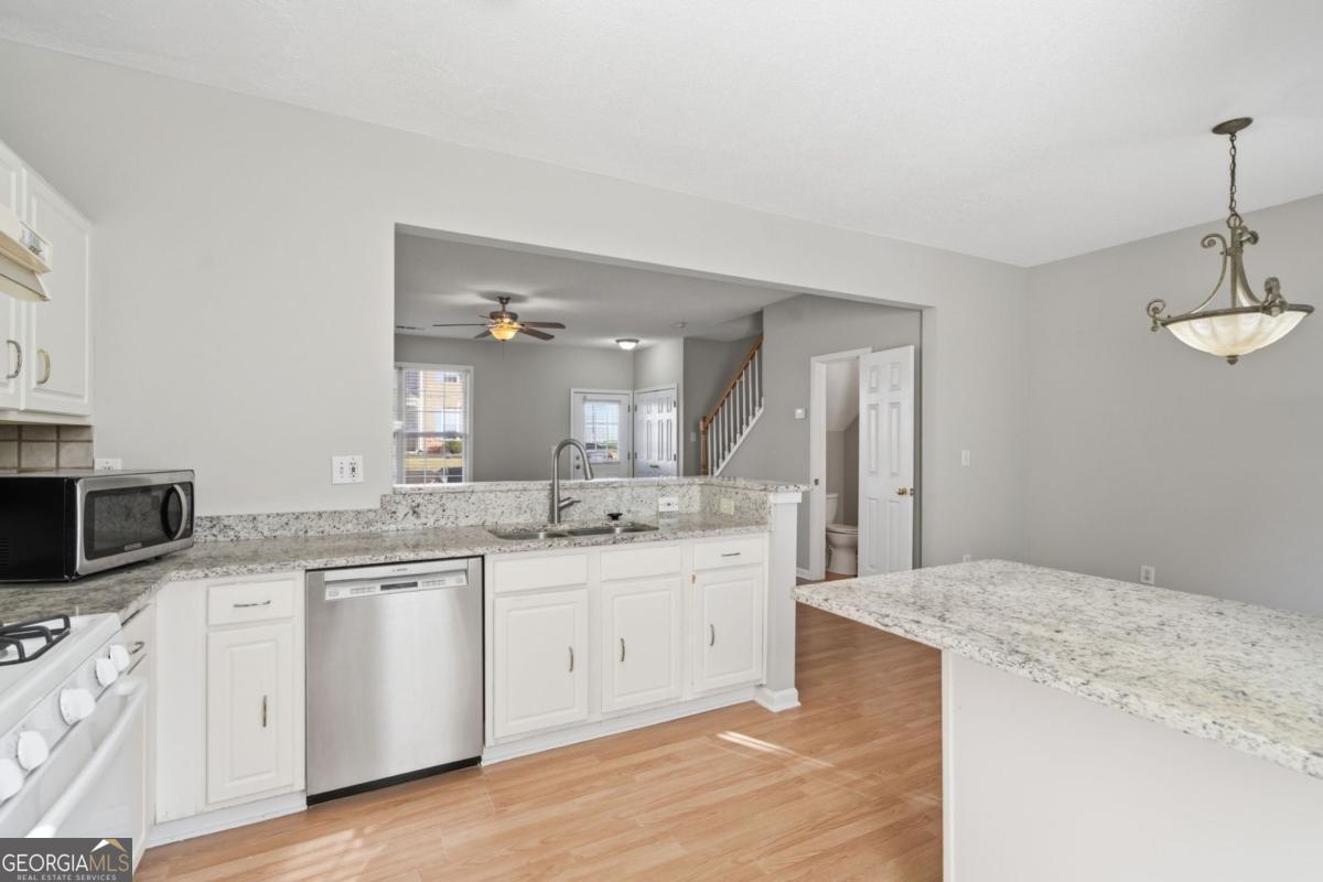Fantastic townhome in sought-after Johns Creek HS district. This bright, open plan has a large kitchen with granite counters which is open to the family room. New paint throughout and new flooring upstairs. The master suite is oversized. Large patio and privacy in back. The community is located between 400 and HWY 141, in close proximity to restaurants, groceries, all conveniences. No rental restrictions in community. Trash, water and exterior landscaping included in HOA fee
