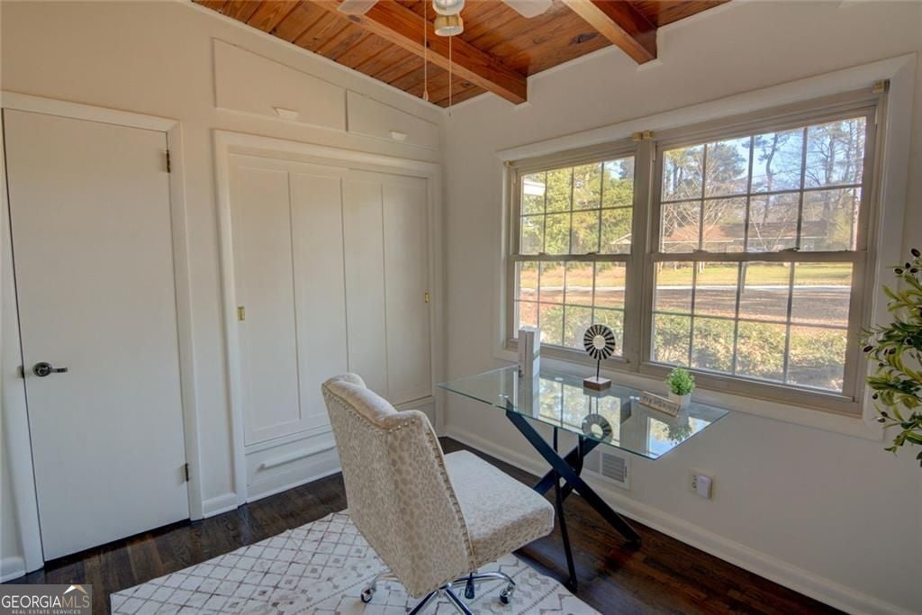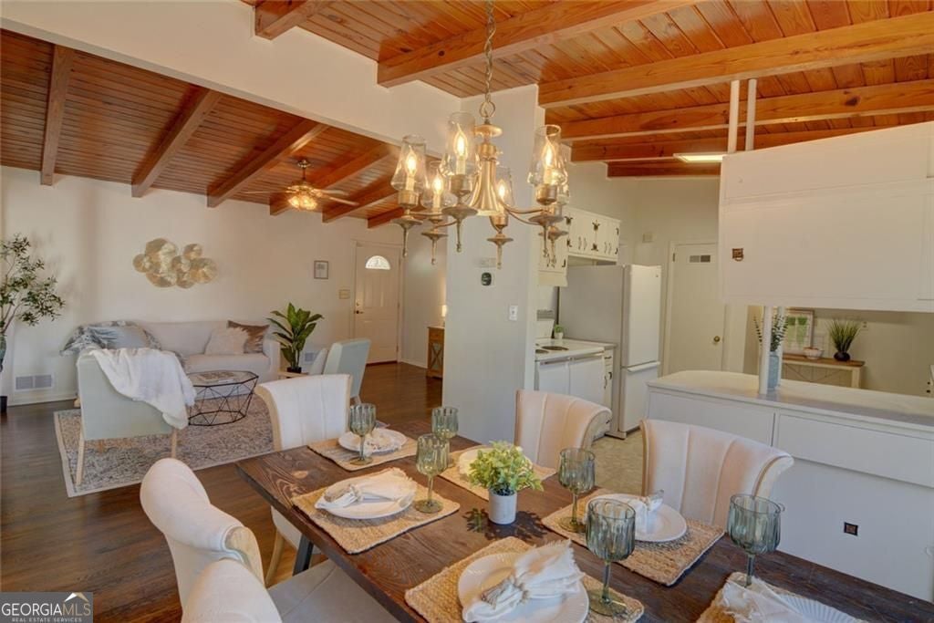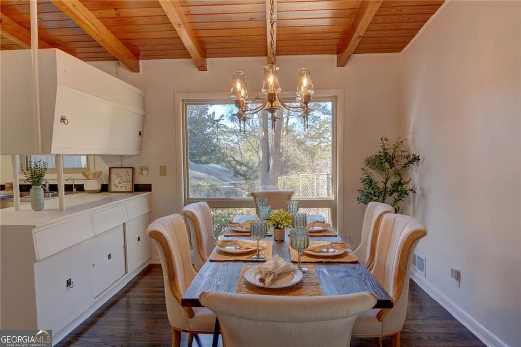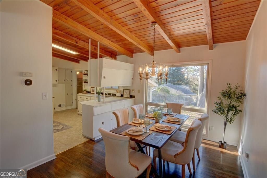 Look who got a facelift! This cherished mid-century bungalow has been lovingly refreshed and is now truly move-in ready, blending timeless character with thoughtful updates. Set on a spacious corner lot in Chamblee, this 1955 gem welcomes you with adorable curb appeal, parking for up to five cars, and classic architectural charm. Inside, original hardwood floors have been beautifully refinished in a rich walnut tone and fresh paint throughout brightens every space. Wood-beamed vaulted ceilings anchor the open living and dining areas, preserving the home's vintage soul while feeling fresh and inviting. The classic original kitchen now features new retro-inspired linoleum flooring and offers the perfect opportunity to enjoy as-is or personalize over time. The home includes three bedrooms, with a primary suite featuring a private half bath, plus a full hall bath. Just off the kitchen, a bright sunroom provides a peaceful year-round retreat. Downstairs, the basement has been fully gutted and professionally waterproofed, offering flexible space ready to be finished to suit your needs, whether that's extra living space, a workshop, or storage. Outside, the property continues to impress with a covered side patio, multiple sheds, and a woodworking workshop with a dust evacuation system. Practical upgrades including a tankless water heater and a Generac whole-house generator add comfort and peace of mind. With fresh updates, timeless mid-century details, and a fantastic lot, this lovingly cared-for home is ready for its next chapter.