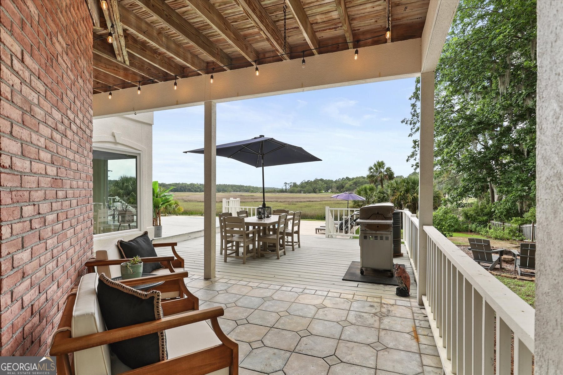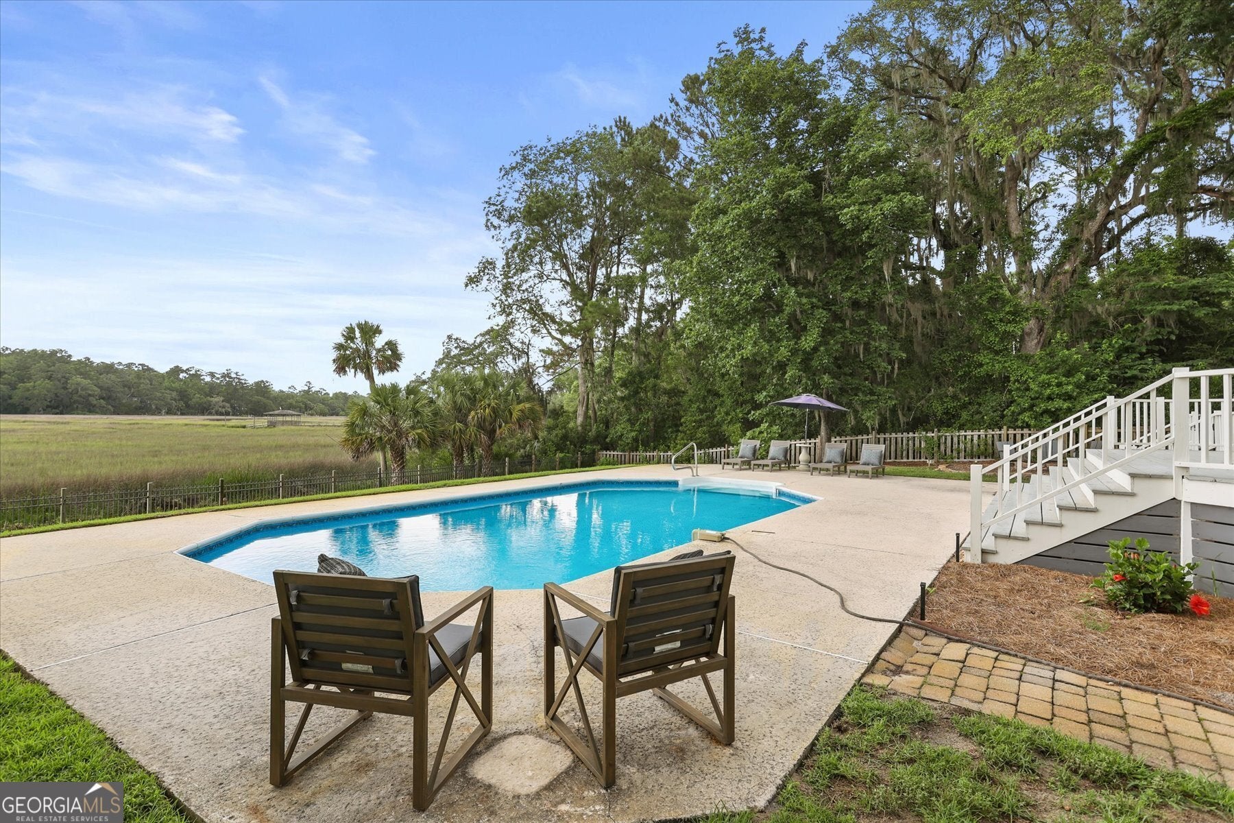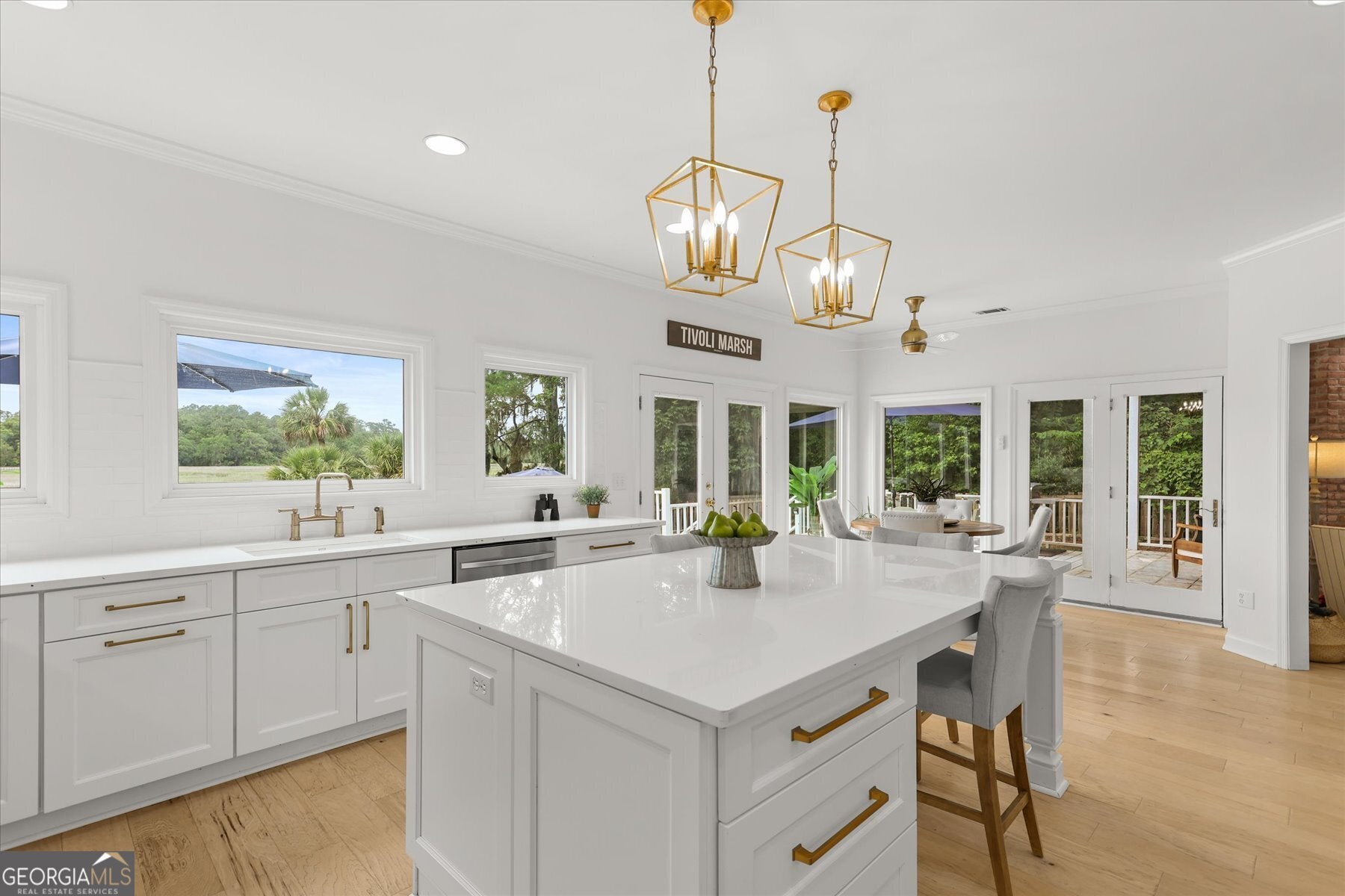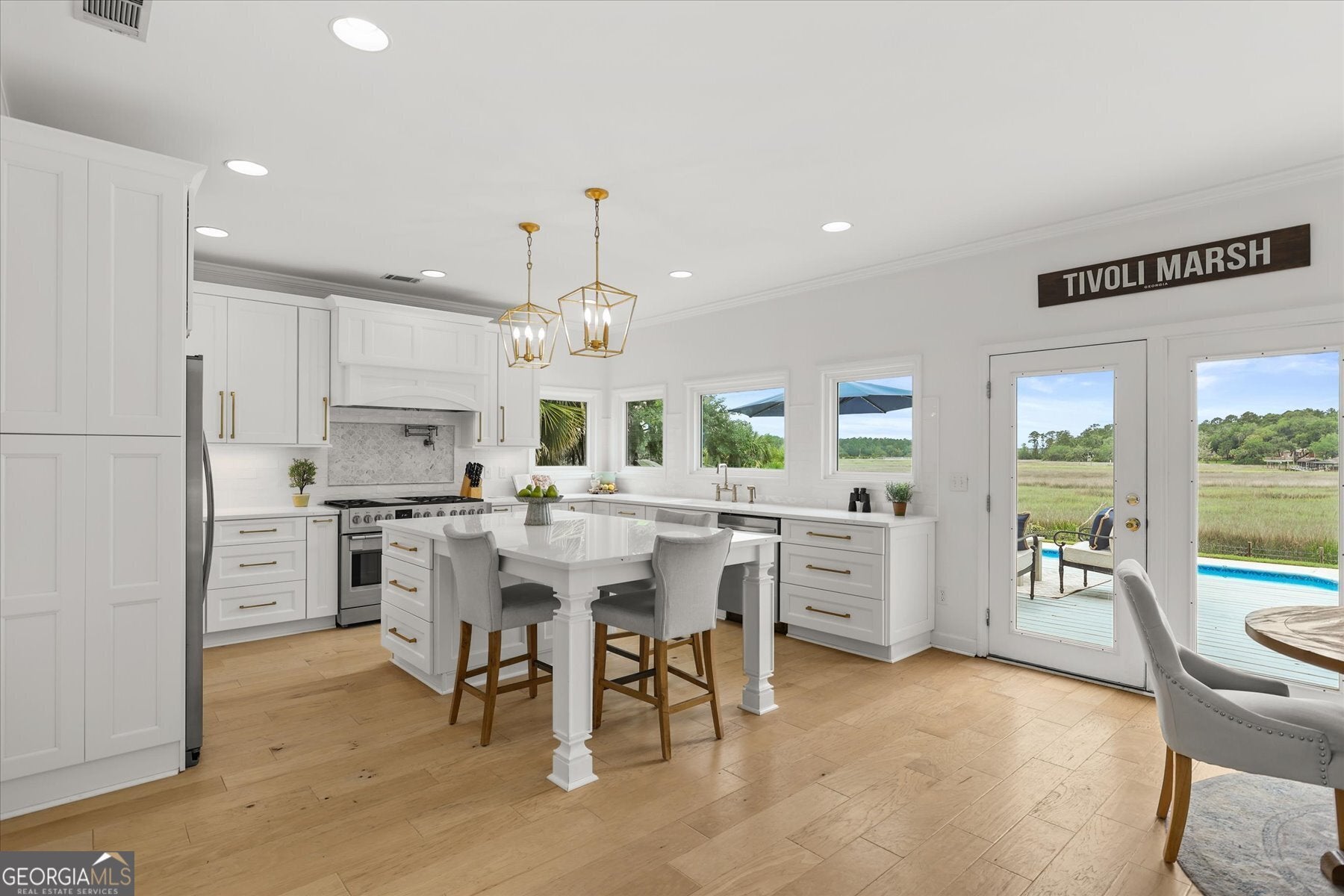 Beautifully updated Marshfront home on the Tivoli River! A grand two-story foyer leads the way into this stunning home where custom designer details are showcased throughout. Entertain effortlessly in the formal dining room, highlighted by arched windows and a striking chandelier or relax in the richly designed office/library. The gourmet kitchen features white cabinetry, a 48-inch Fulgor Milano dual-fuel gas double oven range, island seating and a cozy breakfast nook. The windows over the sink capture stunning marsh views, creating a natural masterpiece. The great room features a classic brick fireplace and access to the outdoor oasis complete with private saltwater pool, expansive deck and covered courtyard. The owner's suite with fireplace and private balcony boasts double vanity, soaking tub, and glass shower. Additional highlights include 2 guest bedrooms, a vaulted bonus room easily convertible to a fourth bedroom, stylishly updated baths, custom laundry and a 2-car garage. Beautiful design, versatile living spaces, and an inviting outdoor retreat define this waterfront home in Sayles Landing!