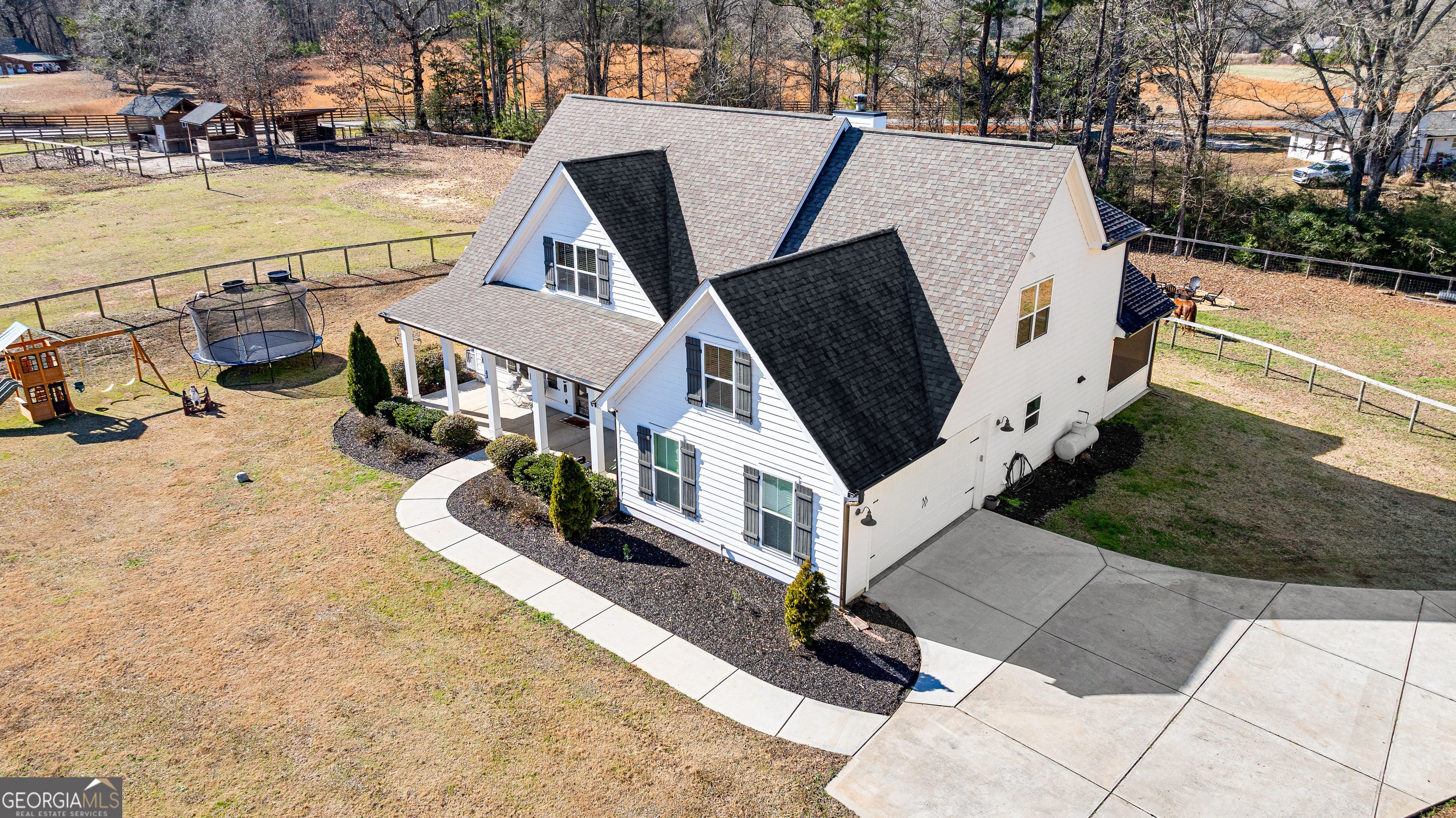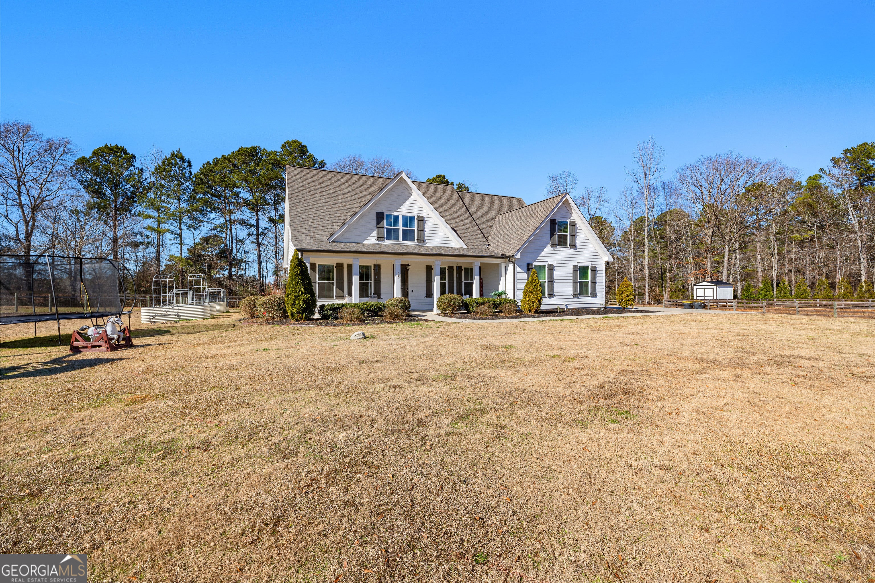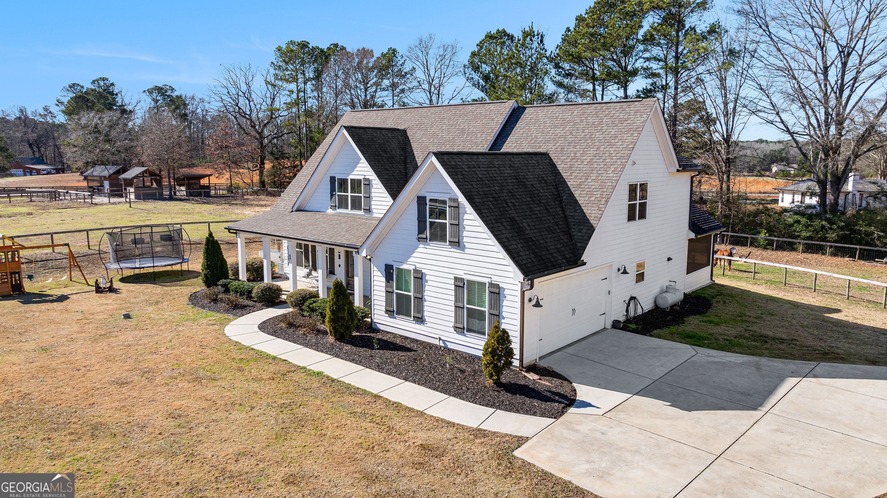Welcome to the heart of Brooks, GA! This charming farm offers the perfect blend of space, comfort, and country living on over 3 acres. The property features 4 board perimeter fencing, three fenced pastures, a paddock, arena, additional yard space, and a solar-powered private gate-ideal for equestrian or hobby farm living. Bring your green thumb to utilize raised garden beds with their own irrigation system! Growing fresh vegetables right outside. Enjoy an inviting front porch, screened-in back porch, and patio perfect for BBQs and gathering around the outdoor fire pit. Inside, timeless elegance awaits with a beautiful kitchen featuring custom cabinets, stainless steel appliances, gas stove, island, separate pantry, and breakfast room. The living room showcases a NEW wood-burning fireplace, while the dining room comfortably seats twelve. The main-level owner's suite offers a paradise retreat with a garden tub overlooking pastures, walk-in shower, dual vanity, and custom closet. A huge plus is the oversized laundry room with folding table and tons of storage throughout. Upstairs includes three additional bedrooms with stunning natural light and a HUGE theater room with custom lighting. Whole house water softening system and osmosis water filtration. Enjoy nearby attractions like Lake Horton Park spanning over 82 acres and 3.2 miles of walking paths, boat ramp, picnic area and playgrounds, Peachtree City, Trilith and Downtown Fayetteville. Entertainment is a short drive away! Award winning schools and activities for the entire family. Schedule your private tour today and start living your farm dream!
