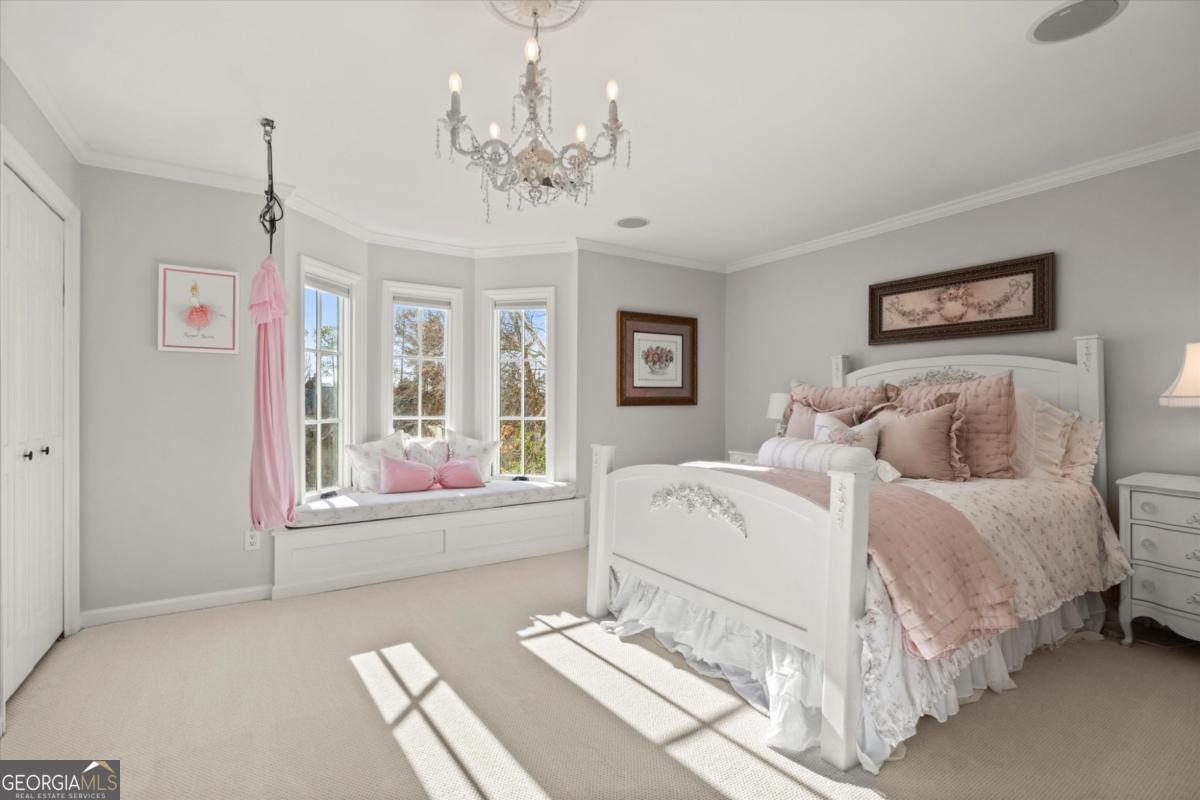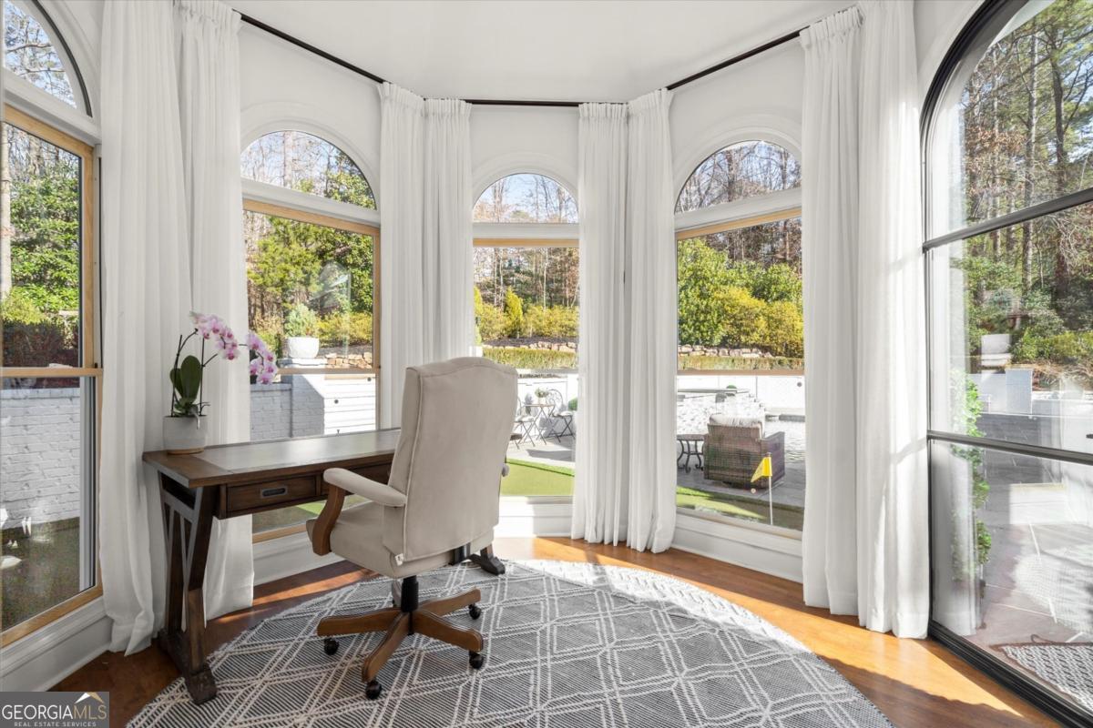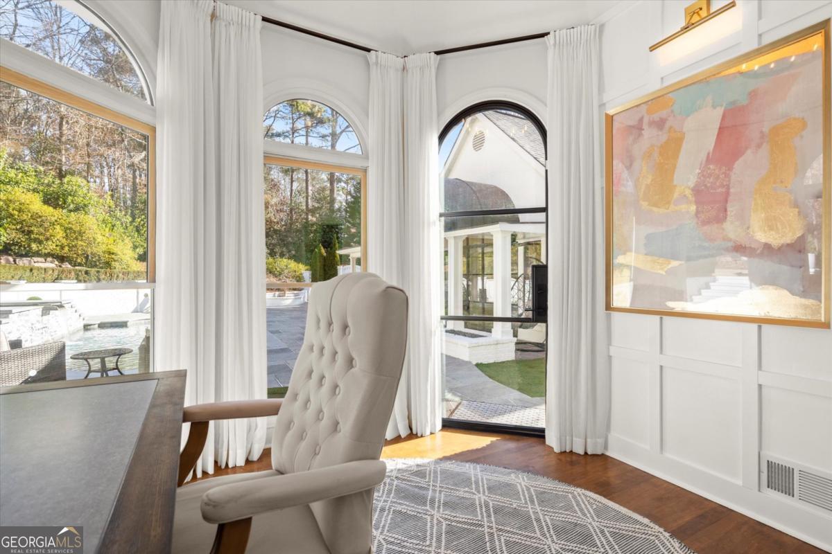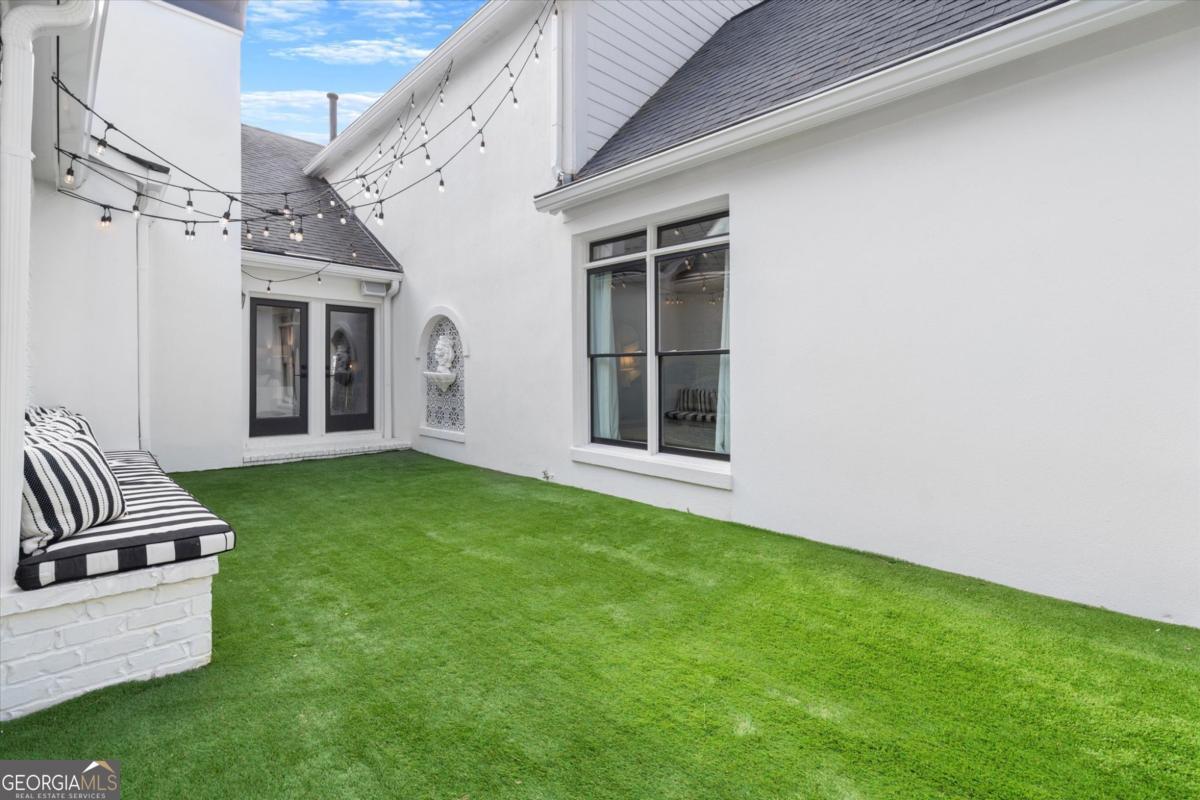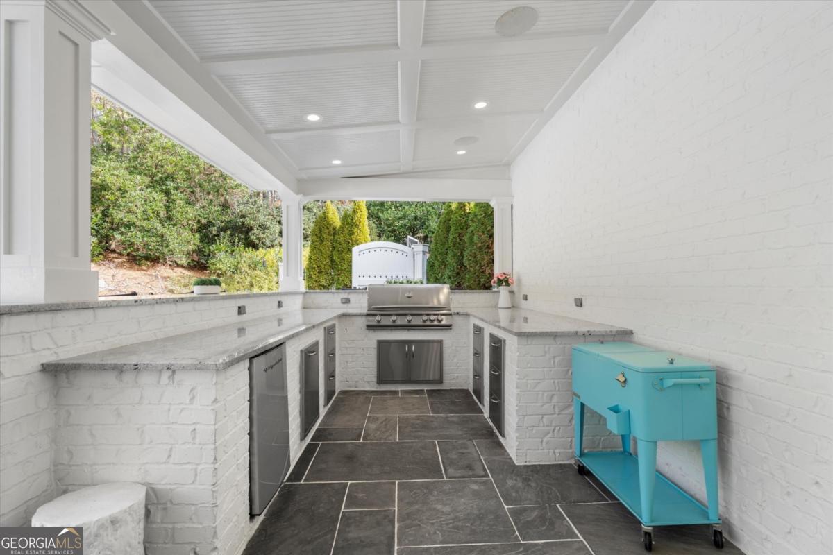 Tucked away on a quiet cul-de-sac in the prestigious Atlanta Country Club community and located within Cobb County's top-rated school district, this custom-designed, all-brick residence (stucco on top) is a true entertainer's retreat. Thoughtfully positioned on a beautifully landscaped half-acre+ flat lot, the home offers exceptional privacy, generous separation from neighboring properties, and a rare sense of both exclusivity and community. The resort-style backyard renovation is nothing short of spectacular. Designed for year-round enjoyment, it features a walkout level saltwater, heated pool and spa with WiFi-controlled, multicolored lighting and flagstone decking, a private putting green, an expansive outdoor kitchen and grilling area, and plenty of flat, grassy space-all fully fenced and surrounded by lush landscaping for total seclusion. Whole-home audio with four independent outdoor zones completes this exceptional outdoor living experience. A circular paver driveway and ample parking provide ease for everyday living and effortless entertaining. Inside, the home showcases solid construction and timeless design, lovingly maintained by the current owner, who grew up in the residence. The floor plan seamlessly blends formal and casual spaces, ideal for both intimate gatherings and larger celebrations. A gracious foyer opens to expansive main living and dining areas adorned with hardwood floors and abundant natural light, creating a warm yet refined atmosphere. The kitchen is both functional and elegant, featuring white cabinetry, a large center island, Thermador double ovens, and a Viking gas cooktop, perfect for cooking and hosting simultaneously. The kitchen flows into a light-filled sunroom with built-in bookshelves and striking steel doors, overlooking the tranquil backyard oasis and pool. The main-level primary wing is a private sanctuary. Along the way, you'll pass a spacious walk-in laundry room. The primary suite offers stunning pool views, a separate private movie room with a double-sided fireplace, and an adjoining circular office with beautiful pitched ceiling-both overlooking the putting green and amazing backyard. The spa-like primary bath includes a corner jetted tub, separate shower, double vanities, two walk-in closets, and a dedicated shoe closet. Also on the main level is a well-appointed private guest suite with a walk-in shower, ideal for visitors. Upstairs, brand-new carpeting leads to two spacious bedrooms connected by a Jack-and-Jill bath. The terrace level expands the living space further with a gym, theater area, playroom, an additional bedroom and full bath, plus abundant unfinished storage. Notable upgrades include a whole-home PowerShare backup generator, Tesla electric car charger, new windows, fresh paint, new carpet. Atlanta Country Club is one of the area's premier private golf clubs, yet notably has no homeowners association and no mandatory club membership. Residents enjoy proximity to The Avenue East Cobb, shopping and dining, Cochran Shoals Riverwalk, Truist Park and The Battery, with quick access to I-75 and GA-400 for convenient travel to Buckhead and beyond. Enjoy a country club lifestyle-or simply the exceptional convenience of this sought-after East Cobb community-with access to top-rated public schools (Sope Creek, Dickerson, and Walton), premier entertainment, outdoor recreation, healthcare, and low Cobb County property taxes.