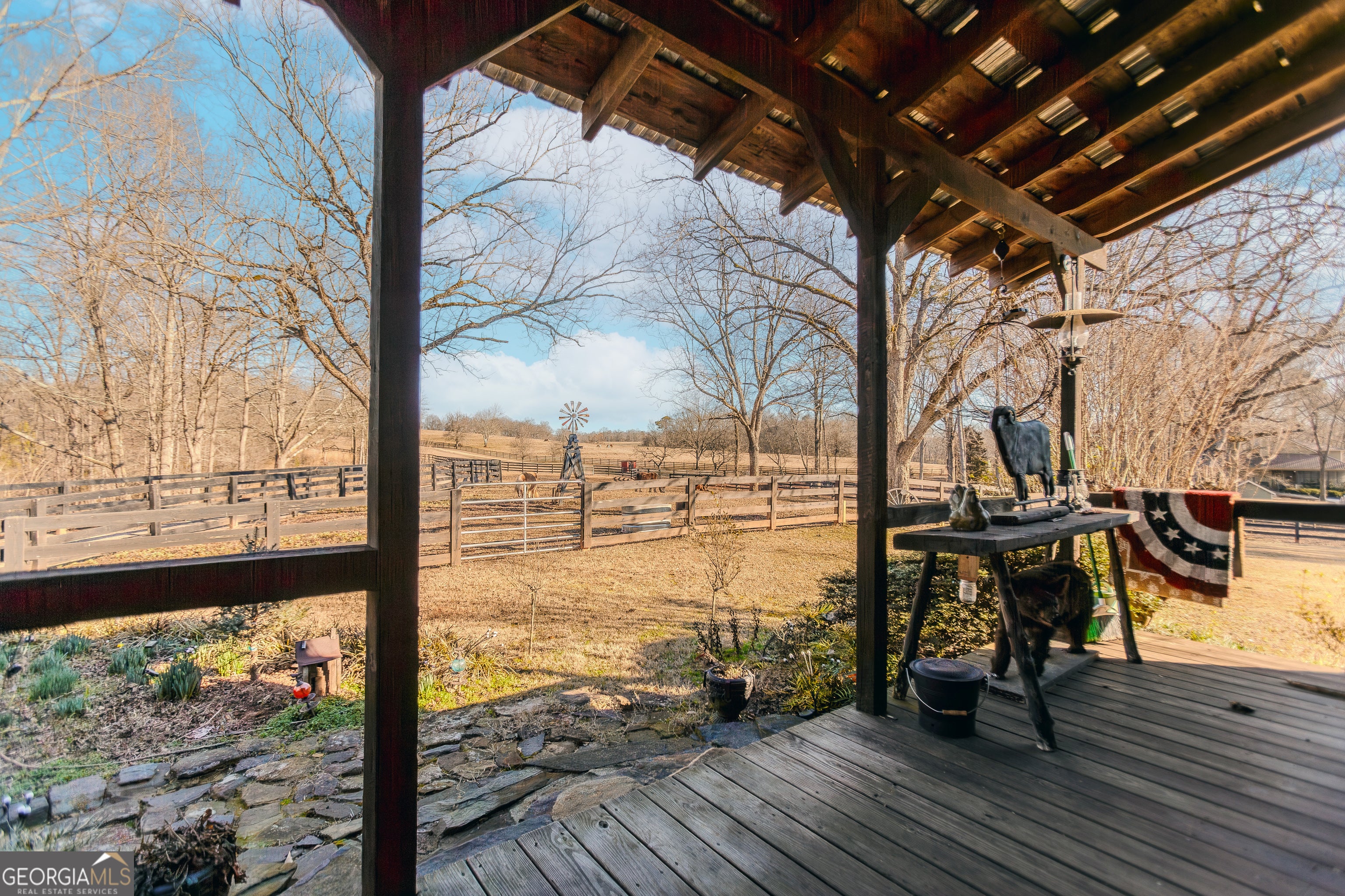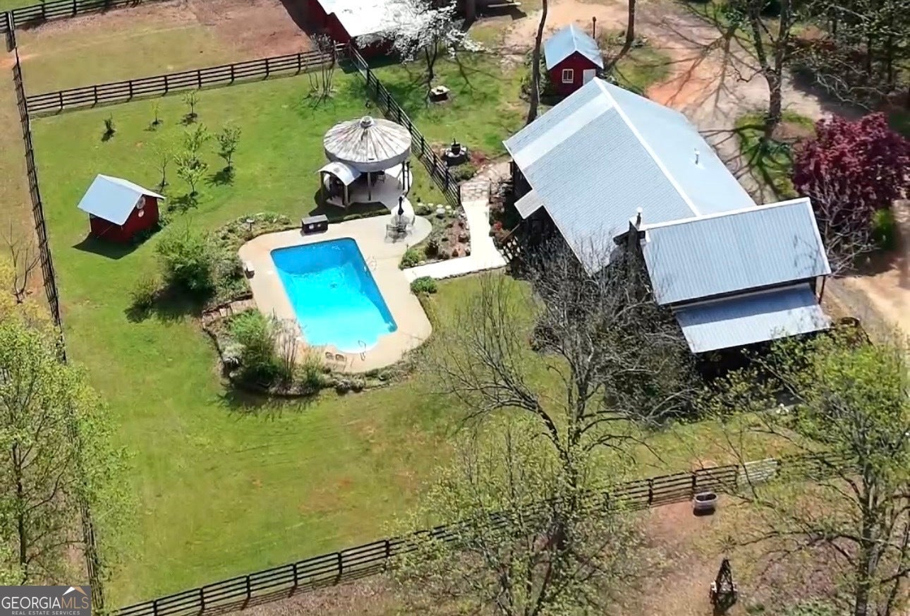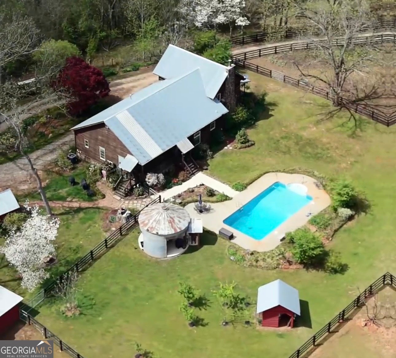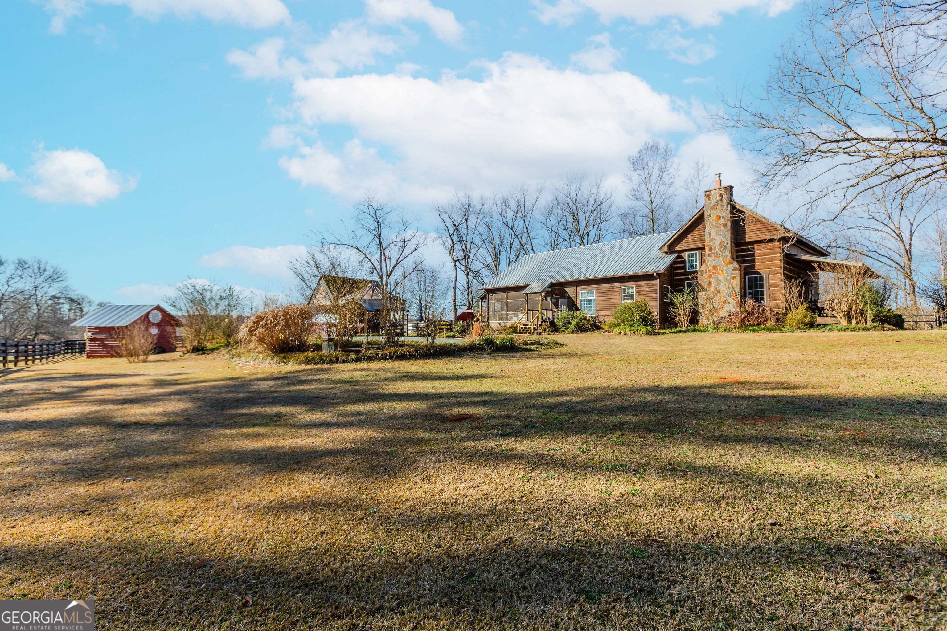 Own a true piece of history-and get ready for everyone to talk about it. Originally built in 1873, this stunning cabin showcases soaring vaulted ceilings with exposed rafters crafted from tree saplings. A thoughtfully designed modern addition offers 3 bedrooms and 2.5 baths sitting on 7.32 acres with a little over 2,700 square feet of space, beautifully carrying the original character forward while adding today's comfort. On the main level, you'll find a spacious formal dining area and an inviting living room anchored by a fireplace built from stones found right on the property. Upstairs, a loft offers flexible space for relaxing, or working. Every inch of this home reflects remarkable artistry and craftsmanship-the kind of place that truly stops you in your tracks. The kitchen is made to impress with a center island, separate built-in gas cooktop, stainless double ovens, and a massive Sub-Zero refrigerator-perfect for everyday living and hosting. The owner's suite is tucked at the back of the home and opens to a screened-in side porch overlooking the saltwater pool and lush gardens. The ensuite bath includes double vanities, a corner shower, and a walk-in closet, while secondary bedrooms are bright, roomy, and welcoming. You'll love the authentic touches throughout: original wide-plank flooring in select areas, breakfast area ceiling joists from the original cabin, antique doors and hardware, and stunning stained-glass windows (just to name a few!). Now, let's talk land. It's level, gorgeous, and shaded by massive pecan trees that appear to be over 200 years old. The original barn with stables is refreshed with new wood and paint, and the property is fenced and cross-fenced for function and beauty-including a wire horse fence and three fenced in pastures for horses. There's also a shed with a metal roof and a fallout shelter beneath the floor, plus farm-ready additions like a chicken coop/run, turkey coop, and geese coop, along with an aviary space in the barn (indoor/outdoor). And the upgrade list is extensive: Gutters/LeafFilter system, new under-house venting, insulation, vapor wrap and dehumidifier, entire home stained, new windows, repaired chimney, a wood stove insert, real tin kitchen backsplash, and all new lighting and chandeliers inside and out. Additional improvements include barn roof and electrical updates, a brand new stand alone 3-car garage, a concrete-based pavilion area, new fencing at the front of the home, and a new pasture with a small pond-making this property as practical as it is unforgettable. The photos do not do the property any justice. You HAVE to see it in person.