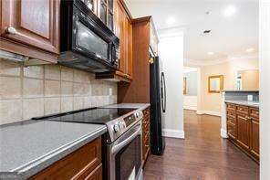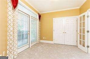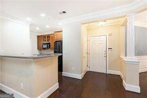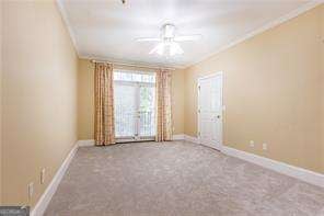 Best price for a 3 bedroom in this complex! This lovely condo in a fabulous location convenient to everything features 3 bedrooms and 2 baths (the 3rd would make a great office) The open concept living area features a spacious dining room, open kitchen with wood cabinetry, solid surface counters, a breakfast bar, brand new stainless electric range and an adjacent laundry room with ample storage and pantry space. All appliances remain! The elegant dining room with its detailed millworker is ready for entertaining. The spacious fireside living room has great natural light and features a French door to the covered balcony with plenty of seating space. The owner's suite has brand new carpet, a walk-on closet, access to a private small balcony and an en suite bath complete with double vanity, soaking tub and separate shower. The second bedroom also features a walk-in closet. The office/den, accessed through French doors, has a large closet and doors to the balcony. Additional tiled Bath. Hardwood floors in the main living areas and new carpet in the bedrooms and office. The unit also has 2 dedicated covered parking spots and a storage unit. This gated community is in a prime location close to Vinings Village, Silver Comet Trail, Truist Park and the Battery.