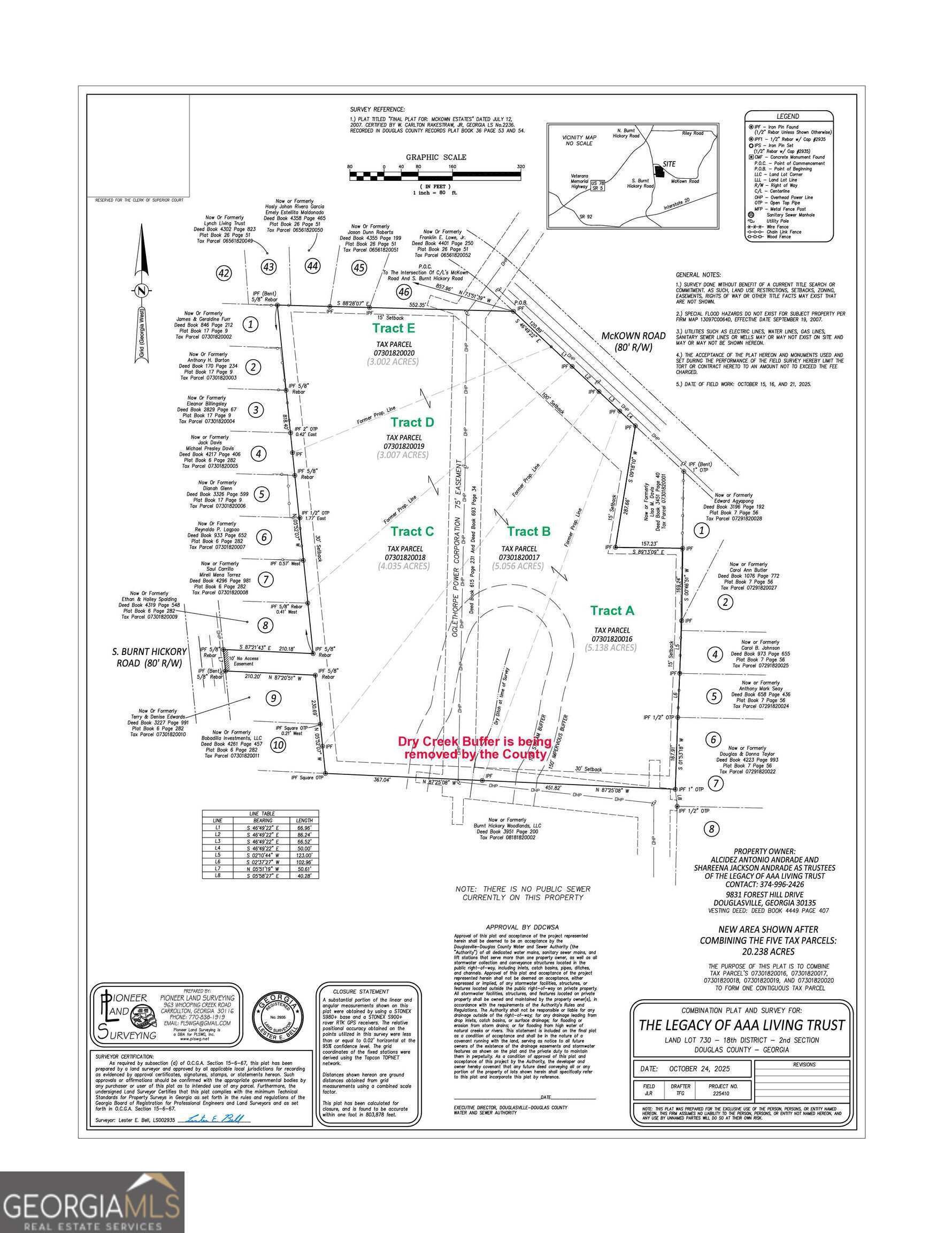 Unlock the potential of this 20+ acre tract in Douglasville ready for development! Zoned R-LD and perfect for a 15-20 single family home subdivision, this land offers public water, gas, and electric. Located just 5 miles from the thriving Downtown Douglasville amphitheater and shops, just a few miles from the new LionsGate Studios. The land has already been subdivided into 5 tracts (tract A is 5.14 acres, tract B is 5.06 acres, tract C is 4.03 acres, and tracts D and E are 3 acres), but Sellers will sell the land only in its entirety. Current survey available-note the power line easement. New homes are all around this land, come and get your piece of the action in hot Douglasville! Call for more information!