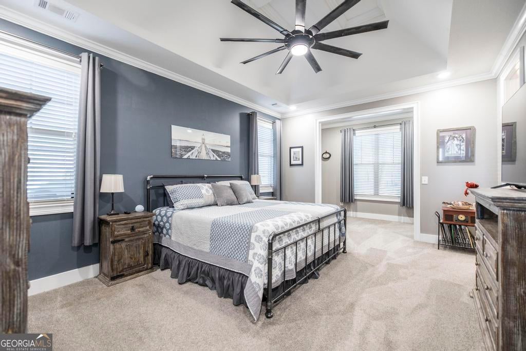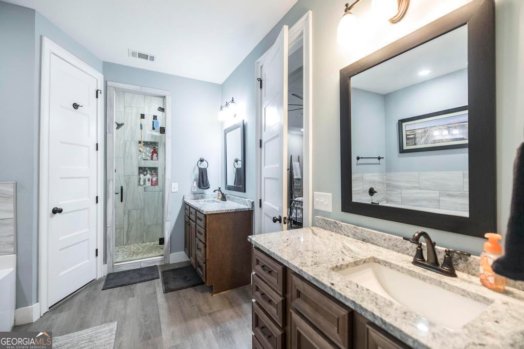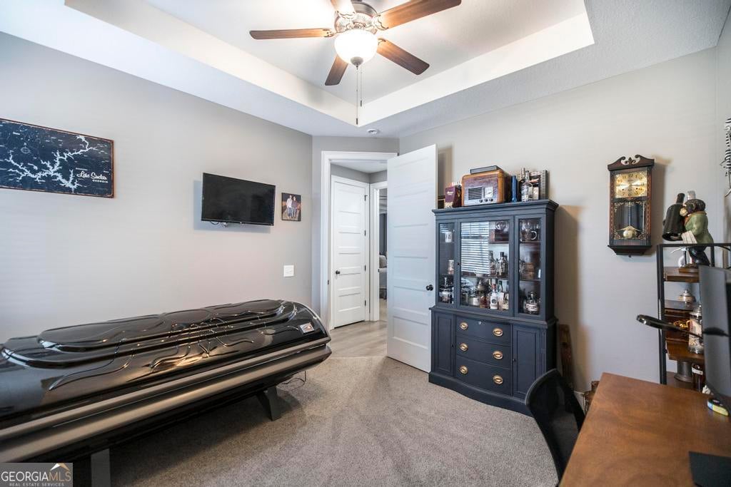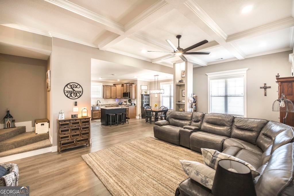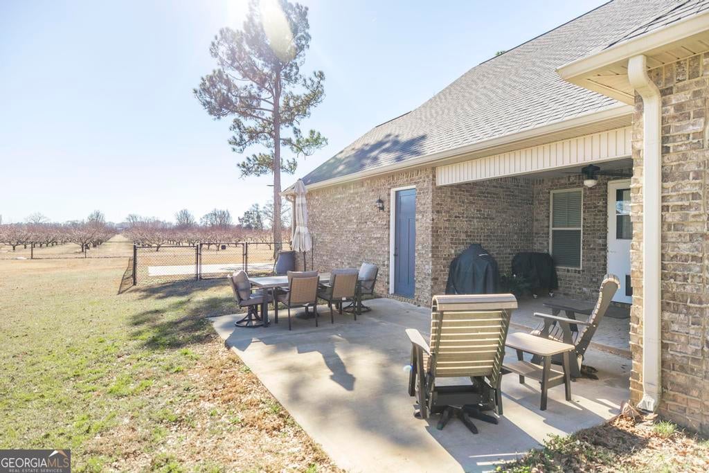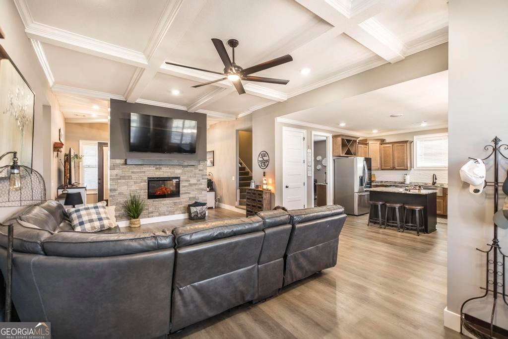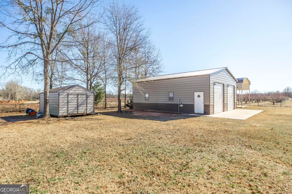 Spacious 4 bed 2.5 bath home offering approx. 2325 sqft of living space, located just 2 miles from I-75 and Centerville/Warner Robins. This home boasts great curb appeal with welcoming front porch and a large fenced back yard on approx .81 acres. The spacious interior features an open concept from the living room to the kitchen, highlighting coffered ceilings, LVP flooring, stunning stone 2-sided electric fireplaces (individually ran) with extra living space and abundant light. The kitchen offers granite countertops, 2 year old stainless steel appliances (to include fridge) and ample cabinetry. The primary suite includes a sitting area ideal for office or reading nook and the ensuite features a garden tub, custom tiled shower, two vanities and walk in closet. Additional features include: a large laundry with extra storage, mud bench, and utility sink, a covered back porch for entertaining, a detached garage/workshop with power-ideal for projects or extra storage/cars, and a Large RV carport with poured concrete and power hookup. HVAC approx 1 yr old. This beautiful home offers both space and comfort with convenient access to shopping, dining, medical facilities and I-75-perfect for everyday living and entertaining!