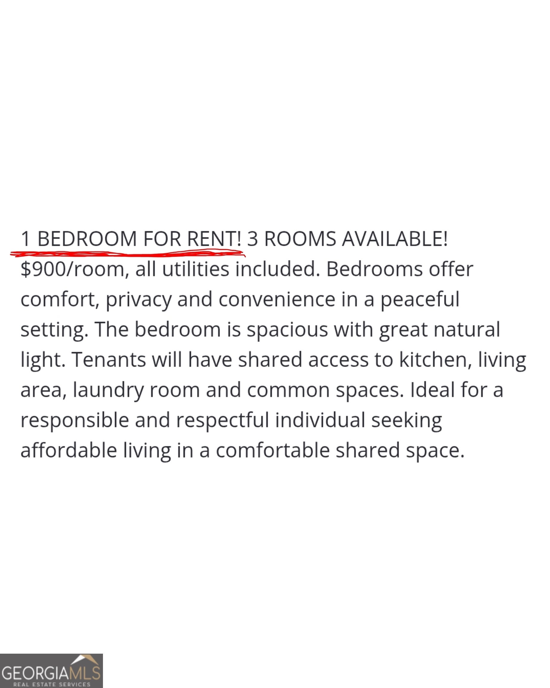 Rooms available for rent. $900/room, all utilities included. Bedrooms offer comfort, privacy and convenience in a peaceful setting. The bedroom is spacious with great natural light. Tenants will have shared access to kitchen, living area, laundry room and common spaces. Ideal for a responsible and respectful individual seeking affordable living in a comfortable shared space. Contact (404) 857 - 7652 to schedule a tour.