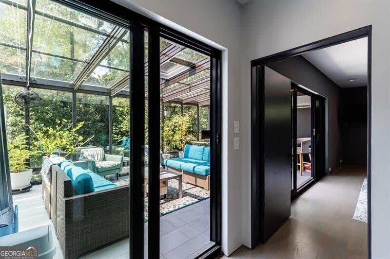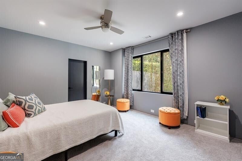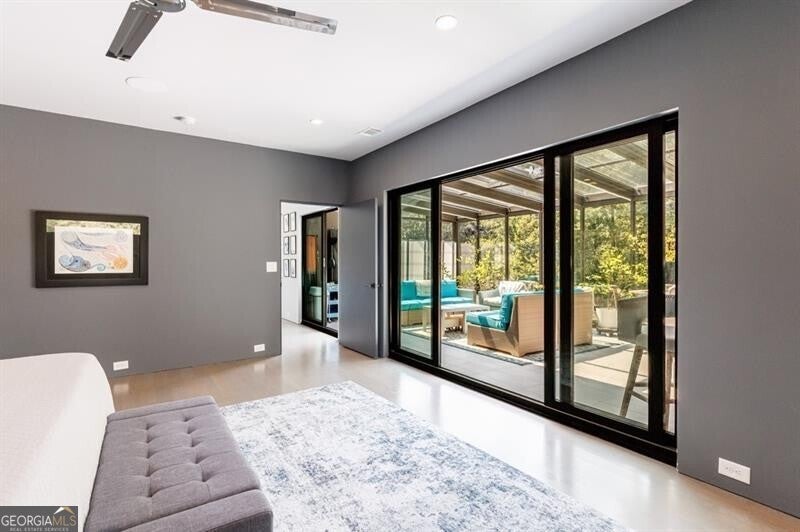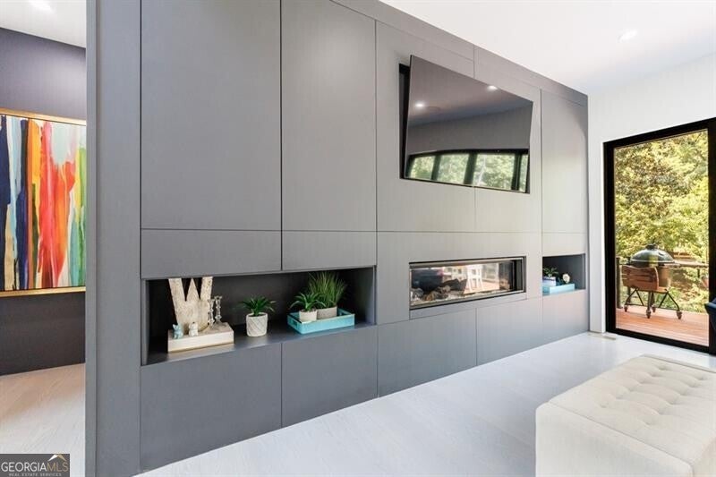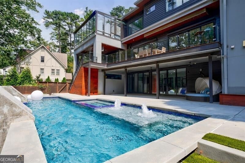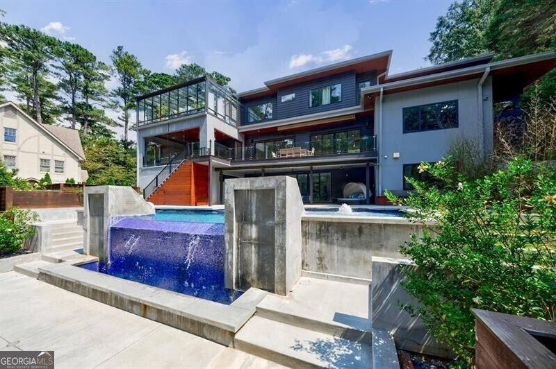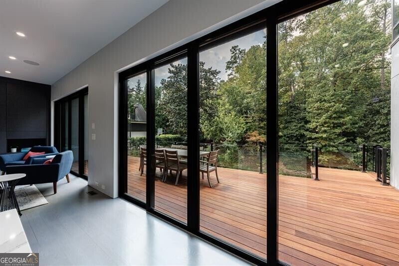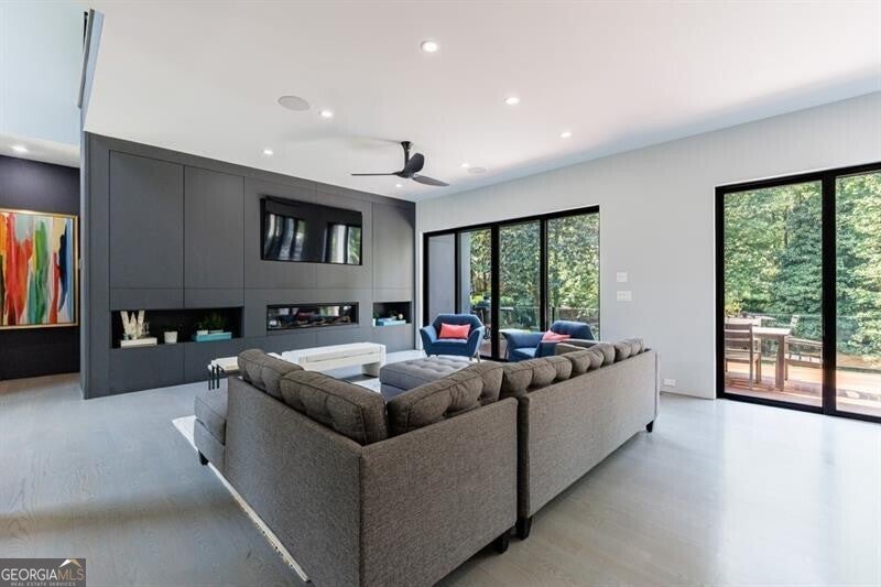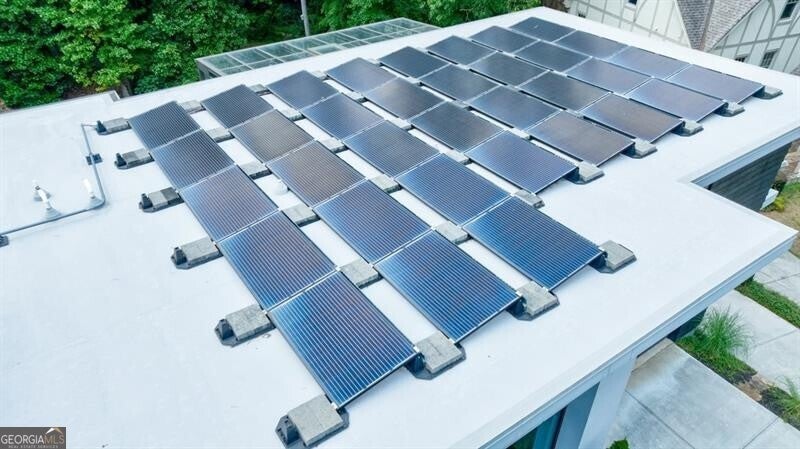 Tucked away on a quiet, tree-lined street in the heart of Buckhead, this exceptional modern residence sits on a private and expansive 0.83+/-acre lot-just minutes from top-rated schools, premier shopping, PATH 400, and all that Atlanta has to offer. From the moment you enter, the home captivates with its light-filled, open-concept main level, soaring ceilings, and clean, contemporary lines. The spacious great room seamlessly flows into a stunning chef's kitchen, featuring a dramatic quartz waterfall island, top-of-the-line Miele and Sub-Zero appliances, custom soft-close cabinetry, and double ovens, including a steam oven. The main level offers a formal dining room, a dedicated home office, and a private guest suite with a full bath. A spacious two-car garage with soaring 16-foot ceilings is also located on this level, the garage already has an indoor basketball hoop but could also be transformed into a car lift system, making it a perfect fit for automotive enthusiasts or collectors. The two car garage is complete with two electric car chargers. Another feature of the home is a total of seven electric shades throughout the house, the electric shades on the main living area doors can remain open while keeping out the sun, insects etc. The two electric shades on the covered outdoor deck on the main level can transform the space from an open-air setting to a fully enclosed screened porch - a truly impressive and versatile feature. A modern staircase leads to the upper level, where you'll find three generously sized en-suite bedrooms, plus a versatile bonus room ideal as a second office or a fourth upstairs bedroom. The primary suite is a true retreat with a spacious walk-in closet and a luxurious spa-inspired bathroom, complete with a steam shower and Japanese insulated soaking tub-perfect for hot/cold plunge therapy. The finished terrace level includes a guest bedroom, home gym, media room, and an oversized single garage-an ideal setup for an au pair or in-law suite with private exterior access. Each level of the home offers seamless indoor-outdoor living, with over 2,000 square feet of deck and patio space. Step outside to your resort-style backyard oasis, where you'll find a breathtaking infinity-edge pool with waterfalls, integrated spa, fire pit, and a level lawn-perfect for play, entertaining, or simply relaxing in total privacy. Designed with sustainability and quality in mind, this home features a solar array with battery backup, spray foam insulation, and energy-efficient windows for optimal comfort and efficiency. Premium materials include a durable TPO roof, IPE wood cladding and decking, modern solid wood doors, architectural hard plank, and stucco exterior-blending cutting-edge design with timeless craftsmanship.