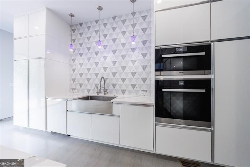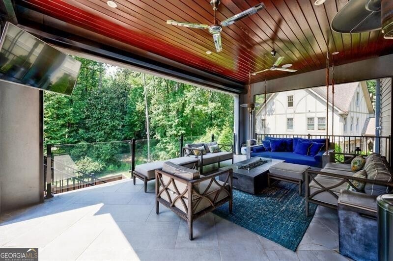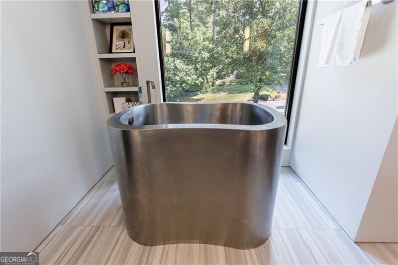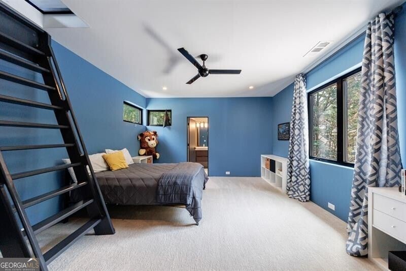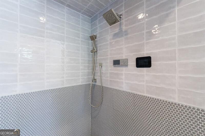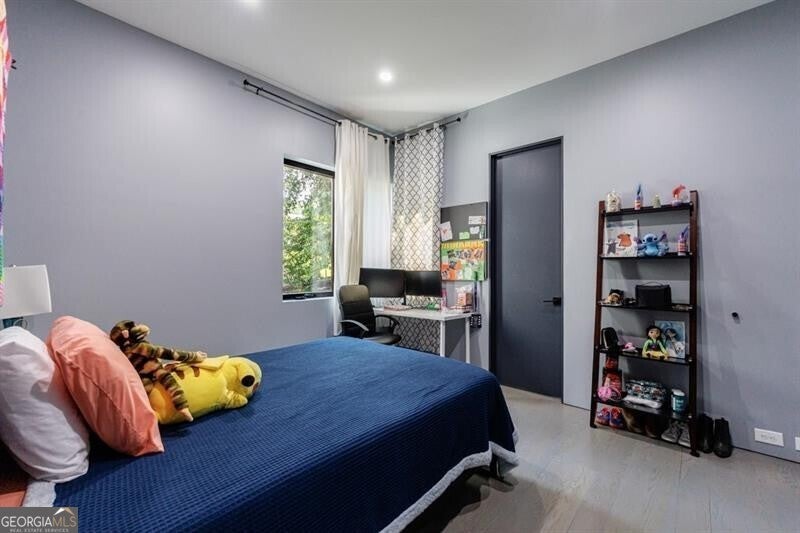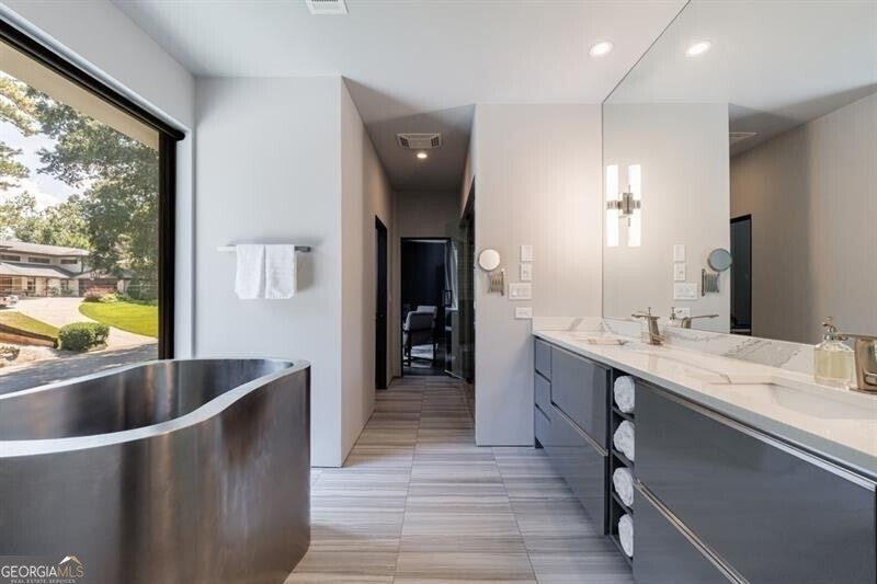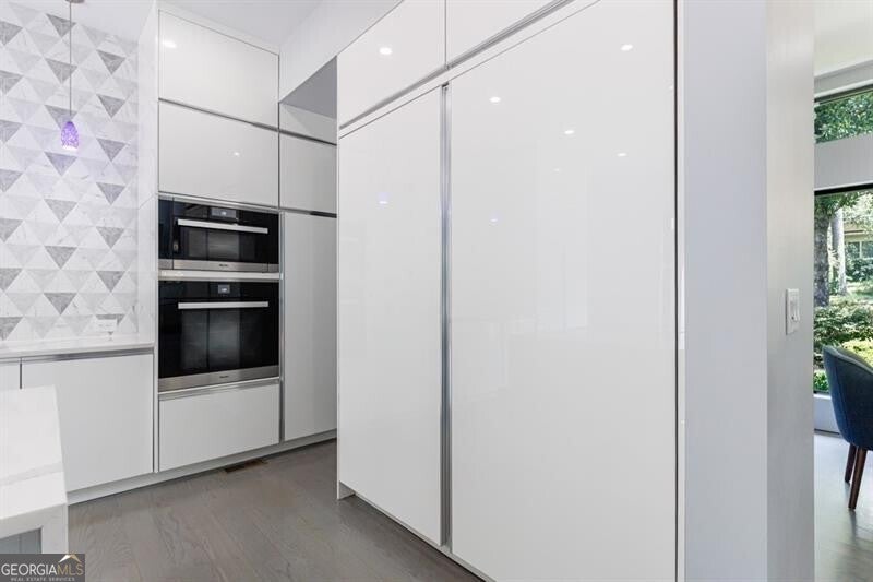 Tucked away on a quiet, tree-lined street in the heart of Buckhead, this exceptional modern residence sits on a private and expansive 0.83+/-acre lot-just minutes from top-rated schools, premier shopping, PATH 400, and all that Atlanta has to offer. From the moment you enter, the home captivates with its light-filled, open-concept main level, soaring ceilings, and clean, contemporary lines. The spacious great room seamlessly flows into a stunning chef's kitchen, featuring a dramatic quartz waterfall island, top-of-the-line Miele and Sub-Zero appliances, custom soft-close cabinetry, and double ovens, including a steam oven. The main level offers a formal dining room, a dedicated home office, and a private guest suite with a full bath. A spacious two-car garage with soaring 16-foot ceilings is also located on this level, the garage already has an indoor basketball hoop but could also be transformed into a car lift system, making it a perfect fit for automotive enthusiasts or collectors. The two car garage is complete with two electric car chargers. Another feature of the home is a total of seven electric shades throughout the house, the electric shades on the main living area doors can remain open while keeping out the sun, insects etc. The two electric shades on the covered outdoor deck on the main level can transform the space from an open-air setting to a fully enclosed screened porch - a truly impressive and versatile feature. A modern staircase leads to the upper level, where you'll find three generously sized en-suite bedrooms, plus a versatile bonus room ideal as a second office or a fourth upstairs bedroom. The primary suite is a true retreat with a spacious walk-in closet and a luxurious spa-inspired bathroom, complete with a steam shower and Japanese insulated soaking tub-perfect for hot/cold plunge therapy. The finished terrace level includes a guest bedroom, home gym, media room, and an oversized single garage-an ideal setup for an au pair or in-law suite with private exterior access. Each level of the home offers seamless indoor-outdoor living, with over 2,000 square feet of deck and patio space. Step outside to your resort-style backyard oasis, where you'll find a breathtaking infinity-edge pool with waterfalls, integrated spa, fire pit, and a level lawn-perfect for play, entertaining, or simply relaxing in total privacy. Designed with sustainability and quality in mind, this home features a solar array with battery backup, spray foam insulation, and energy-efficient windows for optimal comfort and efficiency. Premium materials include a durable TPO roof, IPE wood cladding and decking, modern solid wood doors, architectural hard plank, and stucco exterior-blending cutting-edge design with timeless craftsmanship.