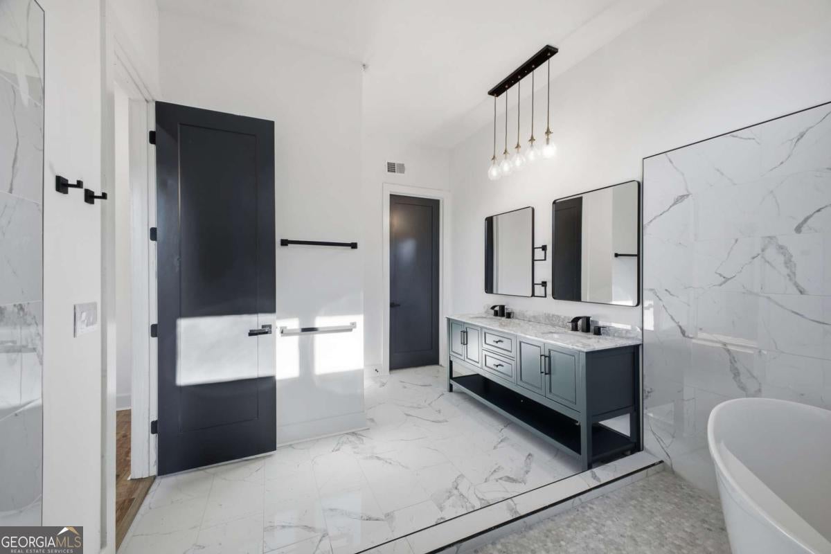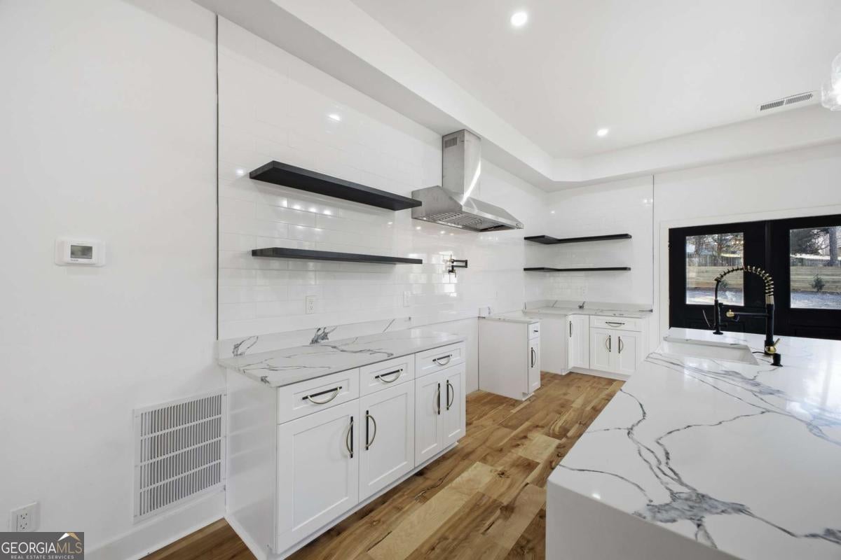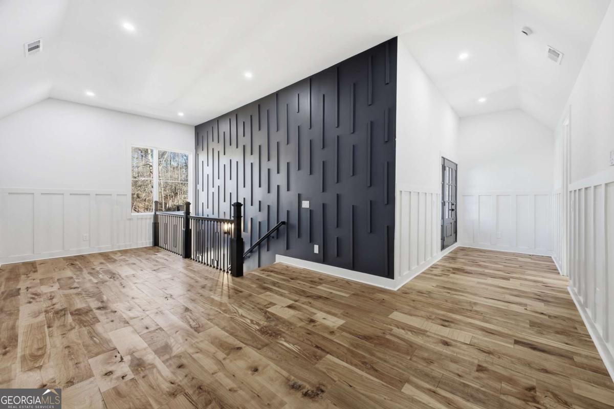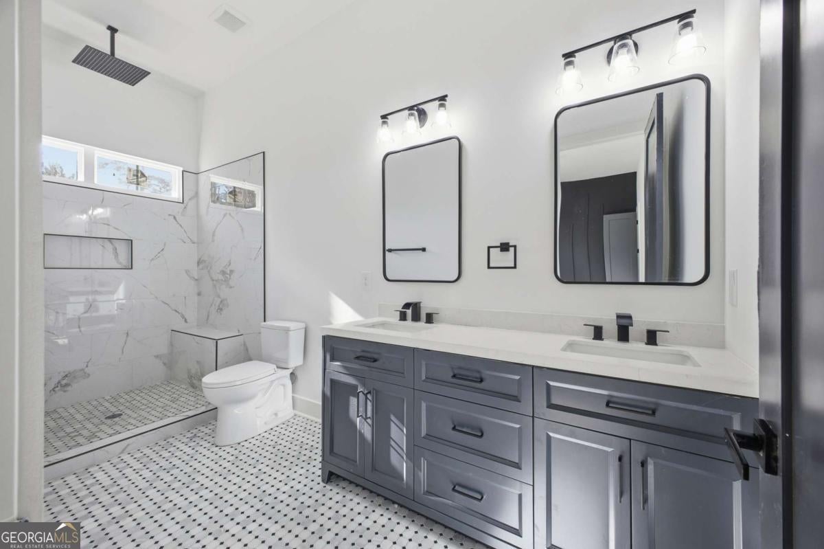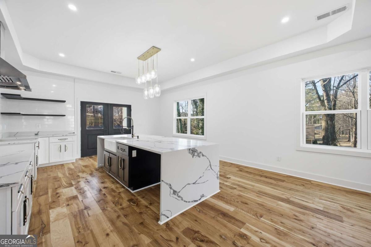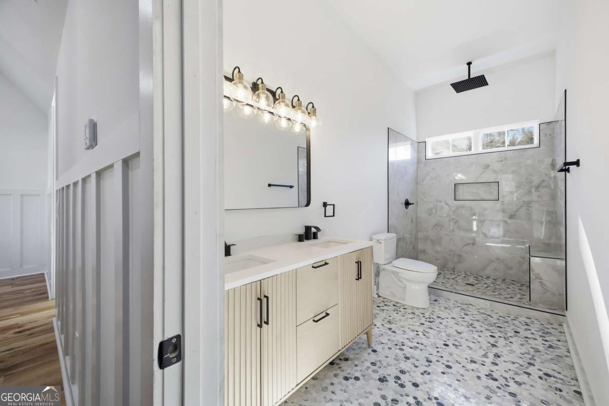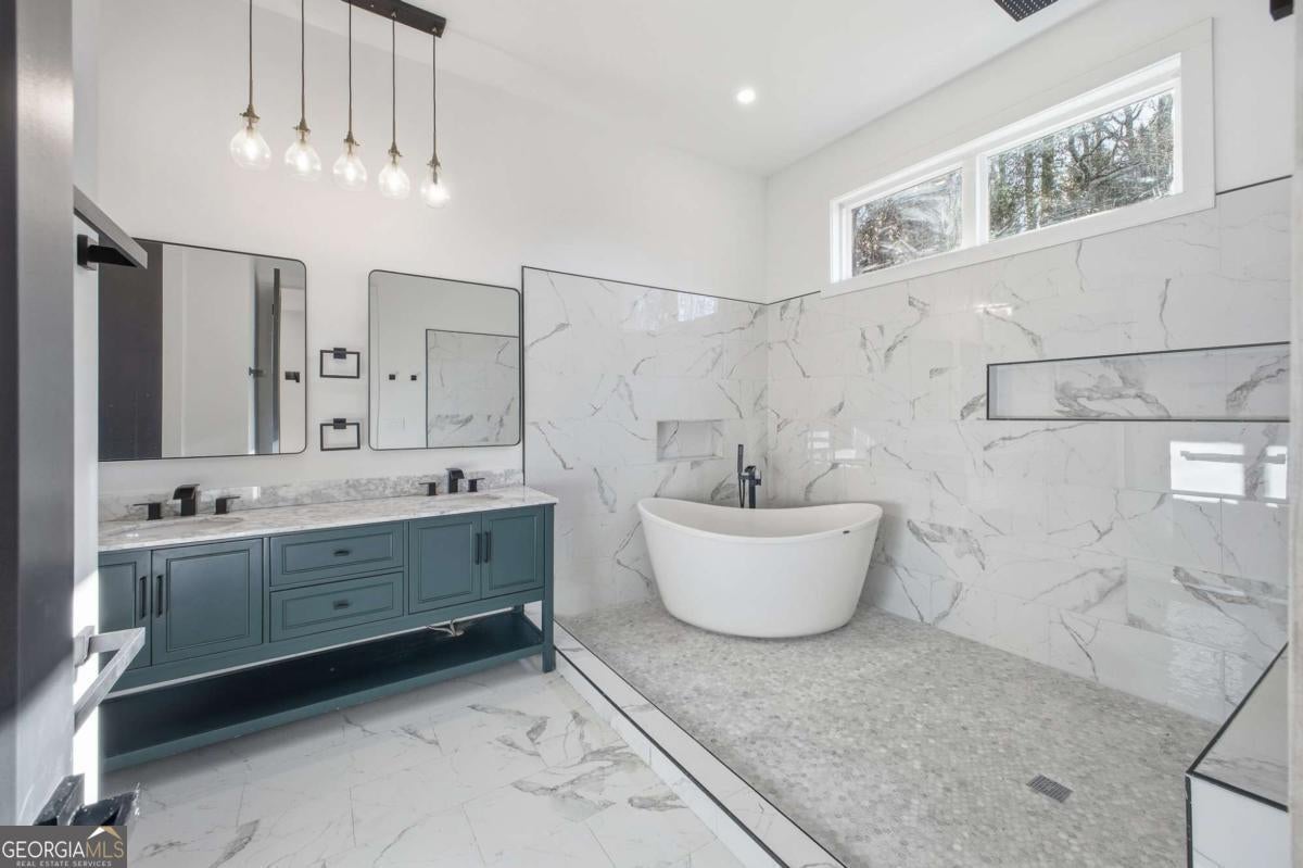 Experience elevated living in this exceptional brand-new construction home, ideally located just moments from Lake Lanier. Designed with both style and function in mind, this 4-bedroom, 3.5-bath residence showcases refined finishes, contemporary elegance, and a highly desirable lake-area lifestyle. Step inside to sun-filled interiors featuring solid hardwood floors, plush luxury carpeting in the bedrooms, and an open, modern layout perfect for entertaining. The chef's kitchen is a true showpiece, offering an oversized island, sleek quartz countertops, wall-to-wall white backsplash, custom white cabinetry with wood shelving, and a deep undermount sink-all complemented by clean, modern finishes. The main-level owner's suite is a private retreat, complete with a spacious walk-in closet and a spa-inspired bath featuring dual vanities, a soaking tub, and a stunning walk-in shower with waterfall fixture. Upstairs, additional bedrooms include a secondary primary suite, along with access to a spectacular terrace-ideal for relaxing or hosting guests. Additional highlights include a main-level laundry room, an elegant electric fireplace, and abundant natural light throughout. Every detail of this home is brand new-offering peace of mind and effortless living. Located just minutes from Burton Mill Park, Lake Lanier, and the University Yacht Club, this home delivers the perfect blend of luxury, modern design, and proximity to the water. A rare opportunity to enjoy high-end new construction in one of Lake Lanier's most desirable locations.
