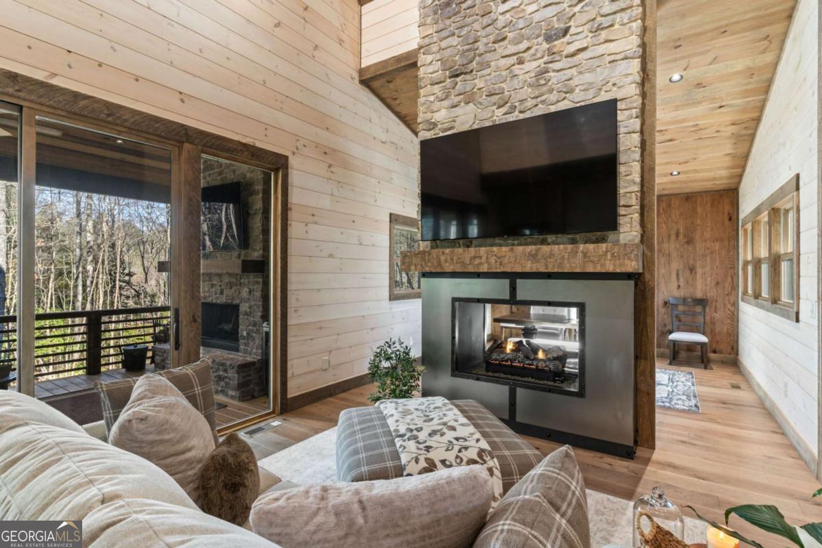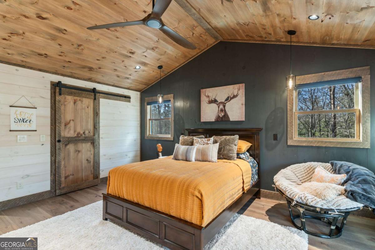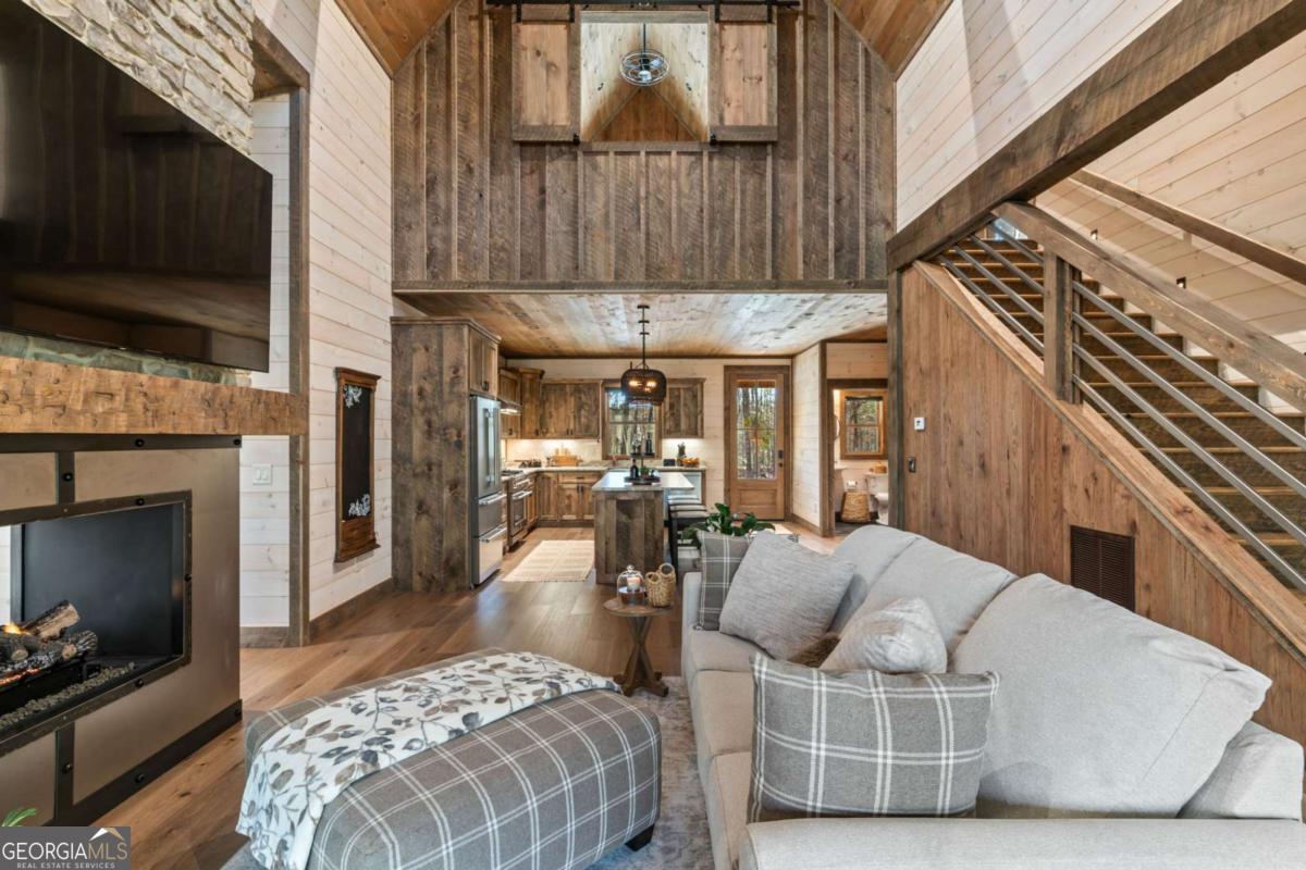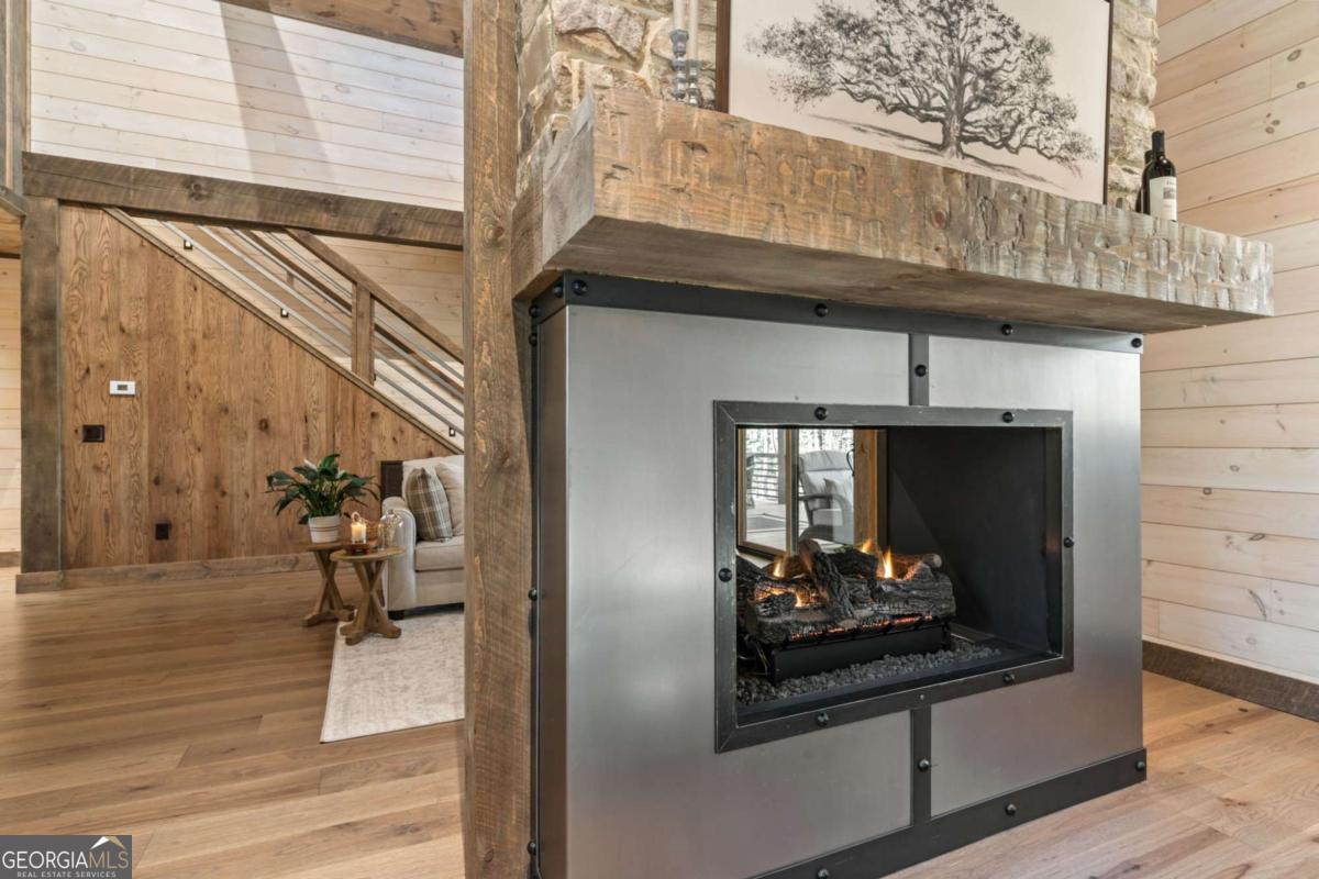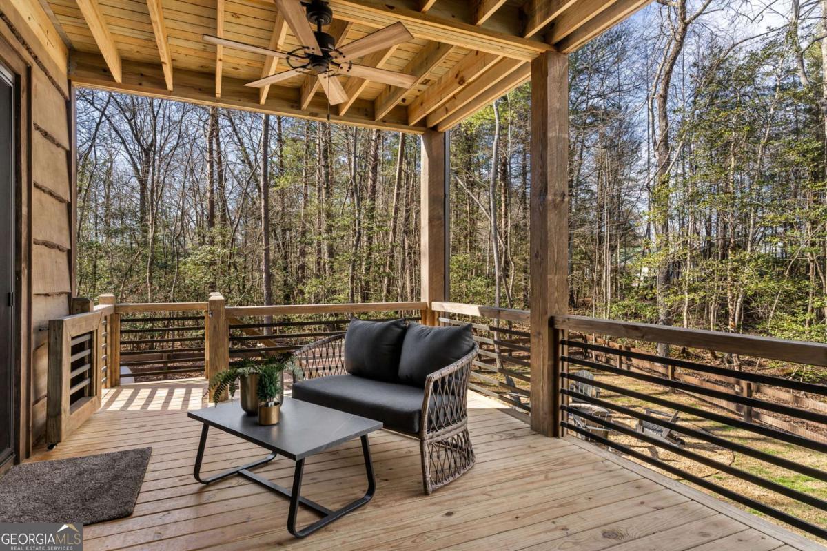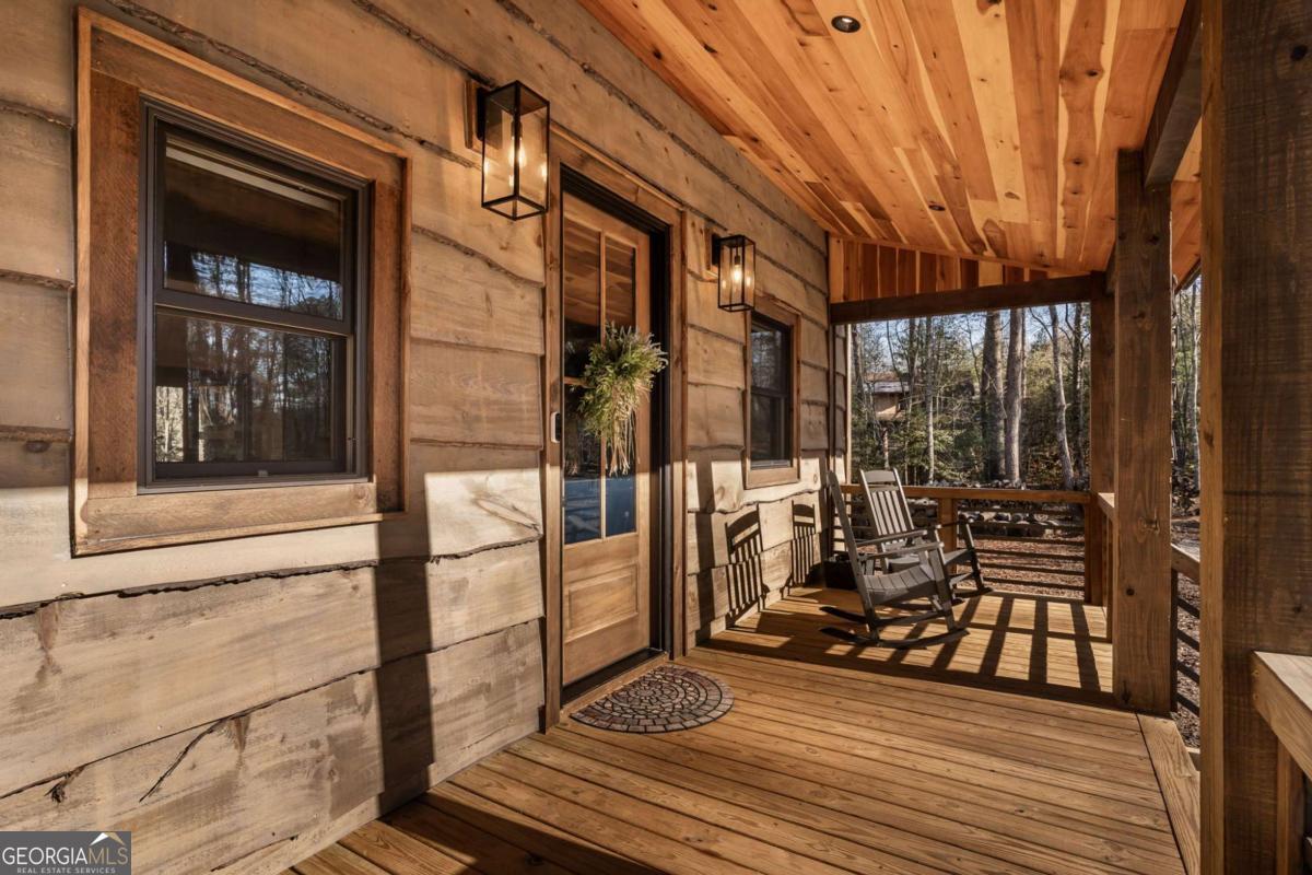 Quality construction in the scenic Blue Ridge Mountains of Georgia, this Eye-Catching Cabin offers over 2,300 square feet of rustic harmony, perfectly designed for those seeking Peace without sacrificing modern comforts. Ideally situated on 2 acres of level land, the property features ample parking and beautifully landscaped surroundings that blend seamlessly with the whispering pines typical of the North Georgia mountains. Its prime location offers easy access to the vibrant local town while providing a serene escape into nature, where you can truly appreciate life's simpler pleasures. Step inside to discover an open floor plan that harmonizes rustic colors with modern accents, showcasing a fully custom wood interior complemented by stylish metal elements. The dedicated dining space comfortably accommodates eight, making it perfect for gatherings. The centerpiece of the living area is a two-sided fireplace that effortlessly creates a cozy atmosphere, whether you're entertaining guests or enjoying a quiet evening at home. Crafted with care by a local builder, this quality home features a custom kitchen equipped with a gas stove, merging functionality with rustic charm for your perfect mountain retreat. The oversized bar area showcases upgraded granite and provides ample space for entertaining, allowing guests to mingle while remaining connected to the heart of the home. With the living room centered around a cozy fireplace and TV, this layout is perfect for gatherings. On those comfortable, climate-friendly days, open the expansive wall of windows to invite the outdoors inside, creating a seamless blend of nature and comfort for everyone to enjoy. The outdoor space is equally inviting, featuring a spacious area with a fireplace, ideal for year-round enjoyment. The level grounds provide a safe play area for pets and children, while a large fenced section with a fire pit enhances your outdoor experience. This unrestricted land presents endless opportunities.