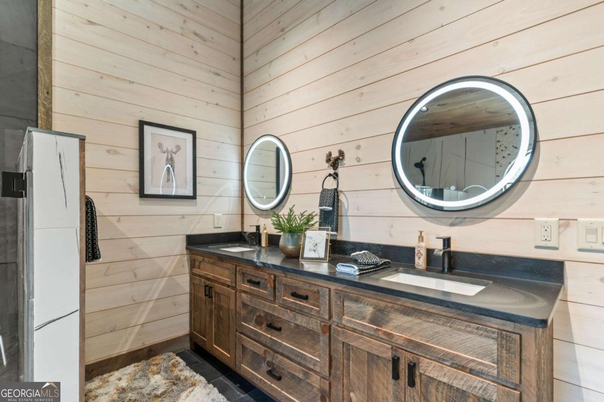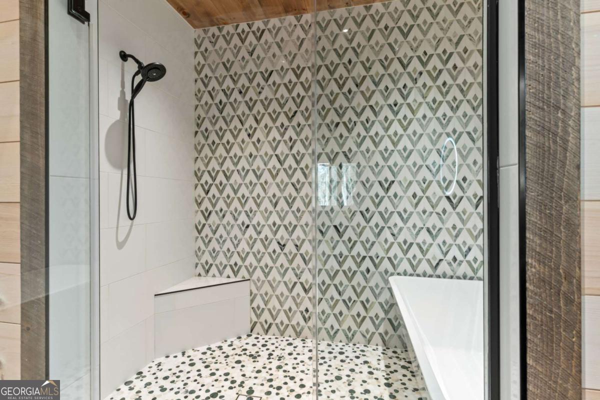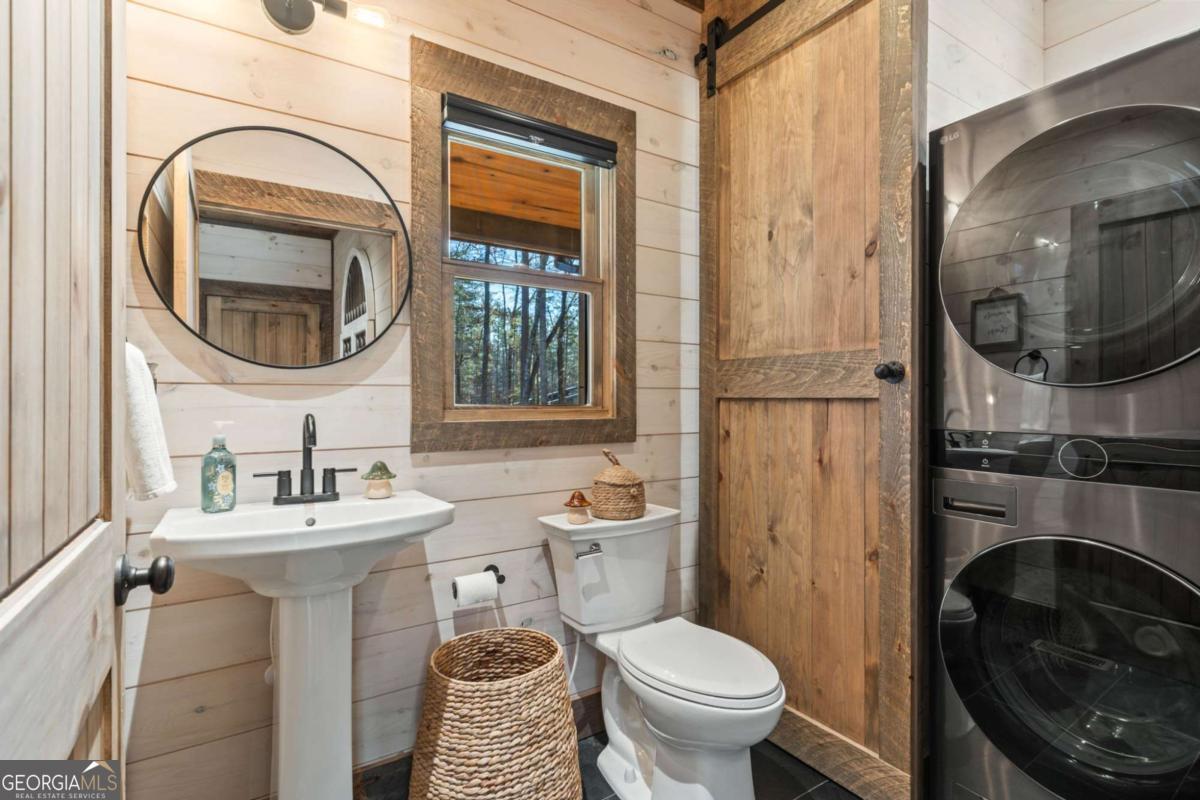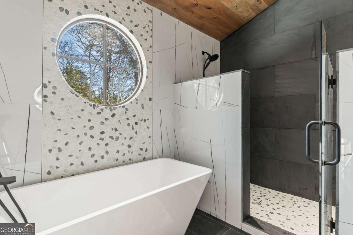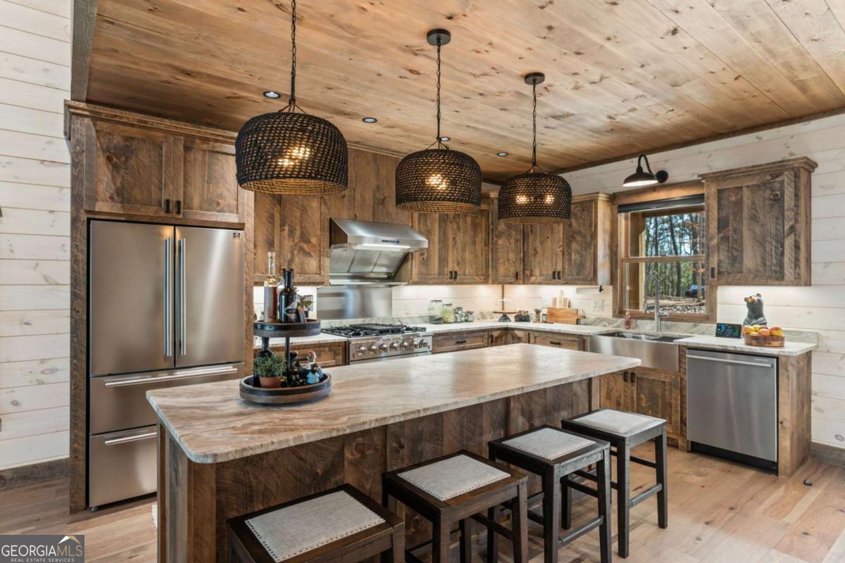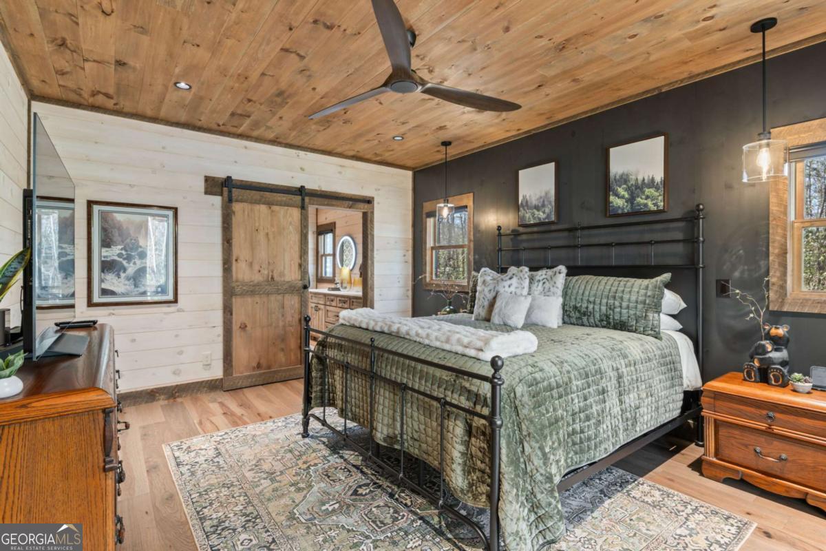 Quality construction in the scenic Blue Ridge Mountains of Georgia, this Eye-Catching Cabin offers over 2,300 square feet of rustic harmony, perfectly designed for those seeking Peace without sacrificing modern comforts. Ideally situated on 2 acres of level land, the property features ample parking and beautifully landscaped surroundings that blend seamlessly with the whispering pines typical of the North Georgia mountains. Its prime location offers easy access to the vibrant local town while providing a serene escape into nature, where you can truly appreciate life's simpler pleasures. Step inside to discover an open floor plan that harmonizes rustic colors with modern accents, showcasing a fully custom wood interior complemented by stylish metal elements. The dedicated dining space comfortably accommodates eight, making it perfect for gatherings. The centerpiece of the living area is a two-sided fireplace that effortlessly creates a cozy atmosphere, whether you're entertaining guests or enjoying a quiet evening at home. Crafted with care by a local builder, this quality home features a custom kitchen equipped with a gas stove, merging functionality with rustic charm for your perfect mountain retreat. The oversized bar area showcases upgraded granite and provides ample space for entertaining, allowing guests to mingle while remaining connected to the heart of the home. With the living room centered around a cozy fireplace and TV, this layout is perfect for gatherings. On those comfortable, climate-friendly days, open the expansive wall of windows to invite the outdoors inside, creating a seamless blend of nature and comfort for everyone to enjoy. The outdoor space is equally inviting, featuring a spacious area with a fireplace, ideal for year-round enjoyment. The level grounds provide a safe play area for pets and children, while a large fenced section with a fire pit enhances your outdoor experience. This unrestricted land presents endless opportunities.