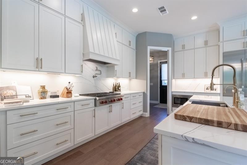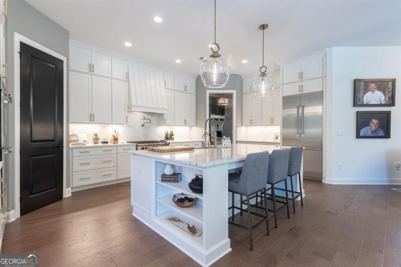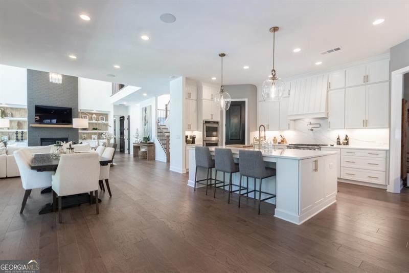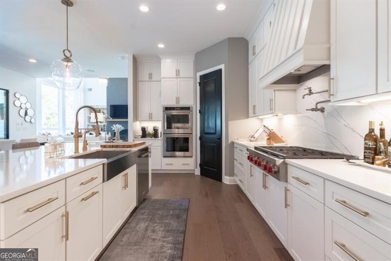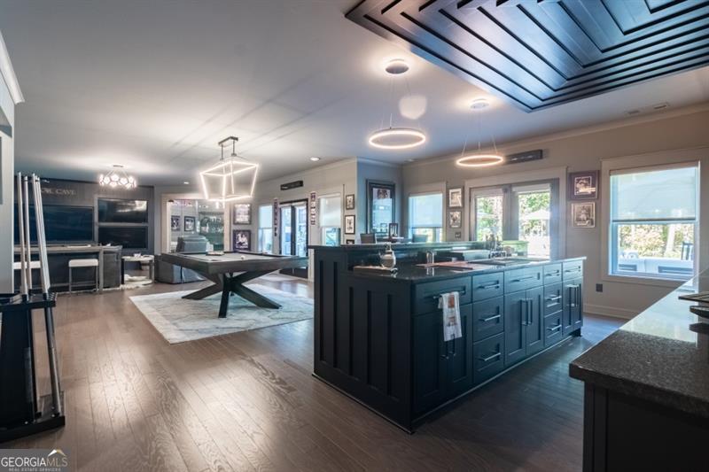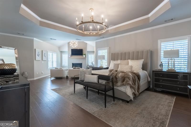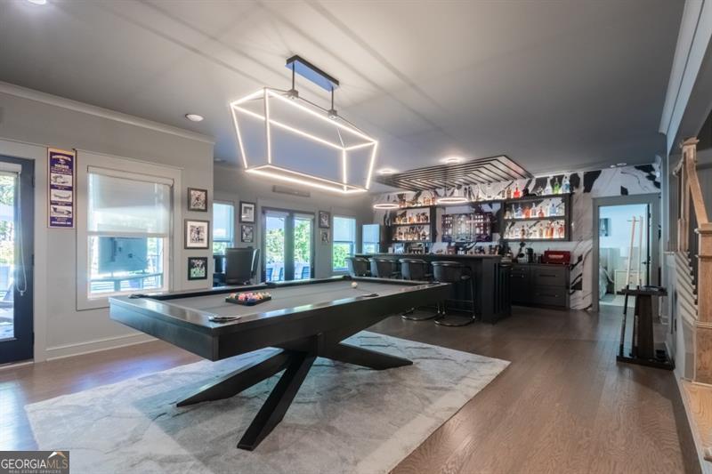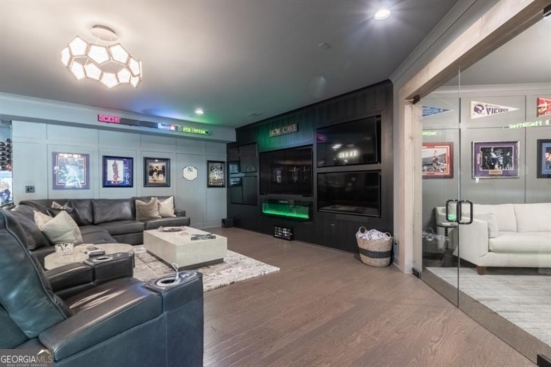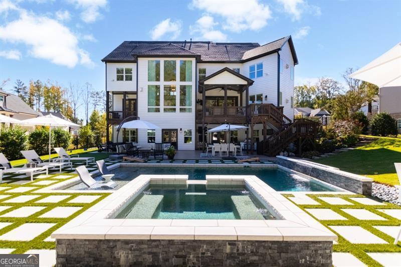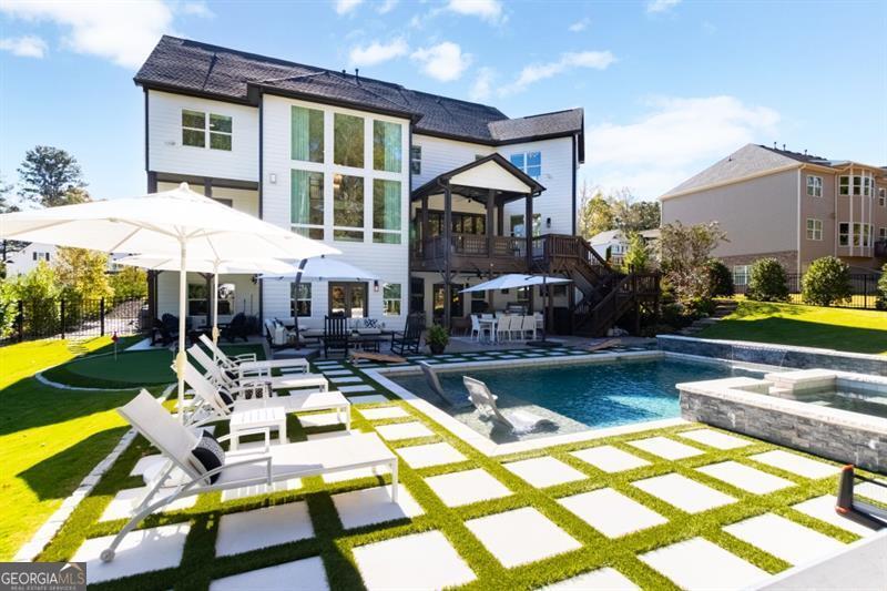 Discover your personal paradise in this stunning 6br 5.5ba home that blends luxury with comfort across an impressive 6,100 sqft on a private .61 acre lot! Main level features a guest suite with a full bathroom, large two-story great room with fireplace and soaring floor to ceiling windows, formal dining room with beverage center and private study with french doors. Expansive eat-in kitchen with custom cabinetry, oversized quartz island, top of the line appliances, cozy keeping room with fireplace, walk-in pantry and friends entrance/mudroom. The Secondary level features an oversized owners suite with an adjacent sitting room and fireplace, spa-like master bathroom with frameless glass walk-in shower, separate soaking tub and custom built walk-in closet system. Three additional bedrooms with full bathrooms, one being jack and jill, oversized laundry room with sink, cabinetry for storage and generous folding counter space. One of a kind fully finished terrace level is an entertainer's dream! Offering a custom-built bar with designer lighting, custom cabinetry, wood paneling ceiling, full slab marble backsplash, dual beverage centers, wine tasting room with full wet bar, wine cellar, movie room, large rec room and separate card room. Perhaps best of all, the resort-style backyard with a 16x24 heated salt water pebble pool with a raised spa, sheer descent waterfall, travertine decking with artificial turf, dedicated grill porch, 3 hole artificial turf putting green and the famous outdoor tiki bar!
