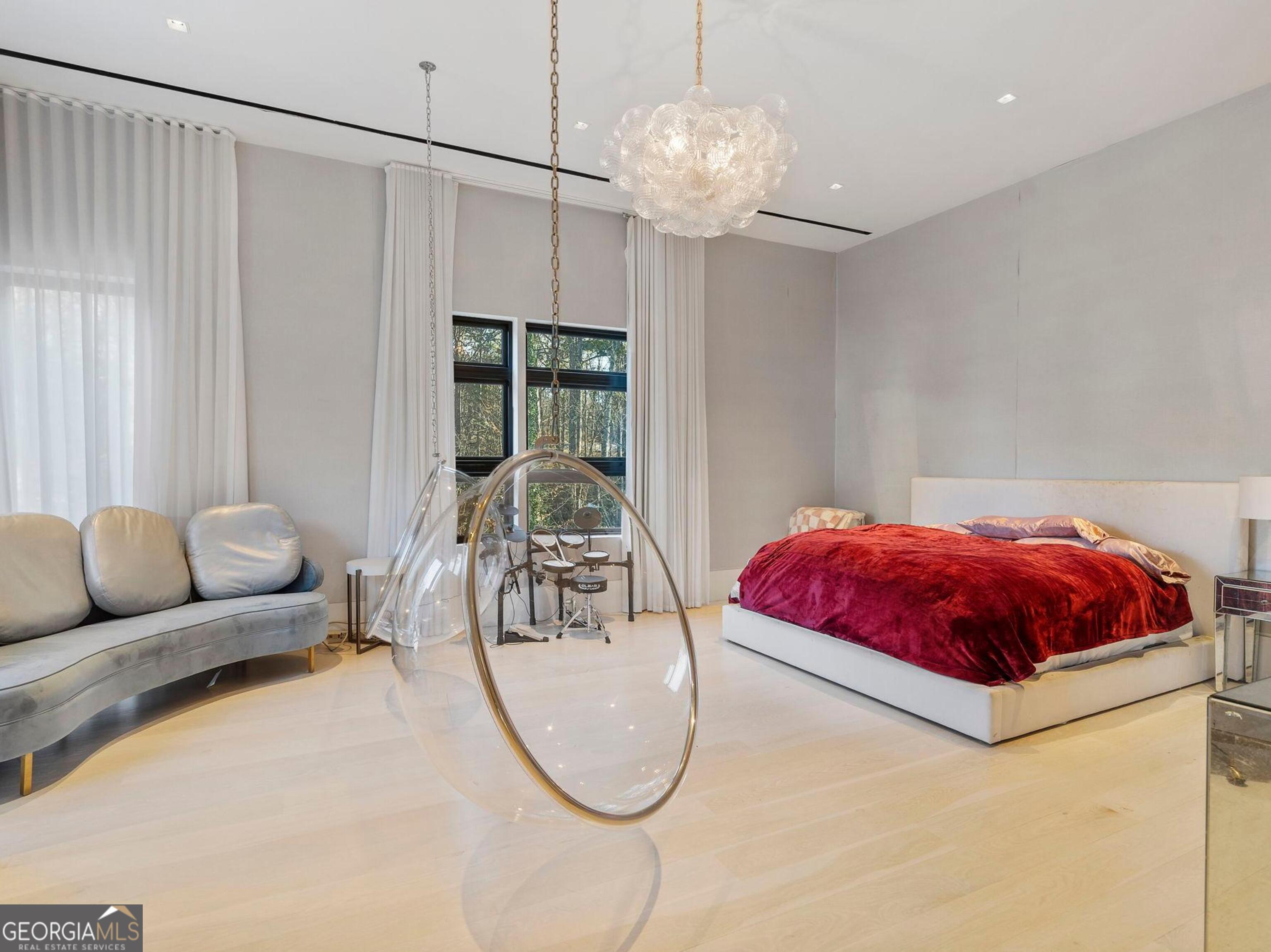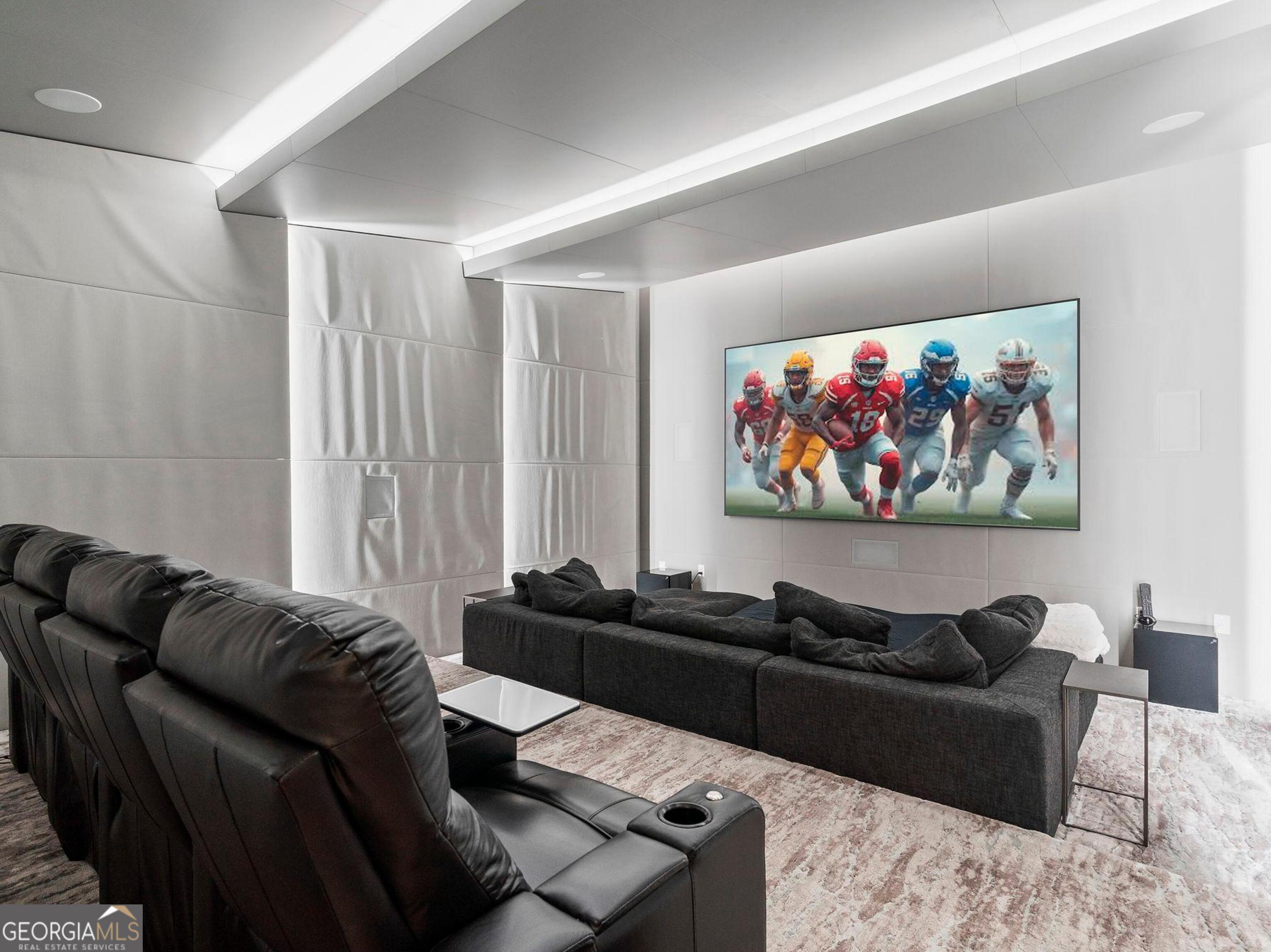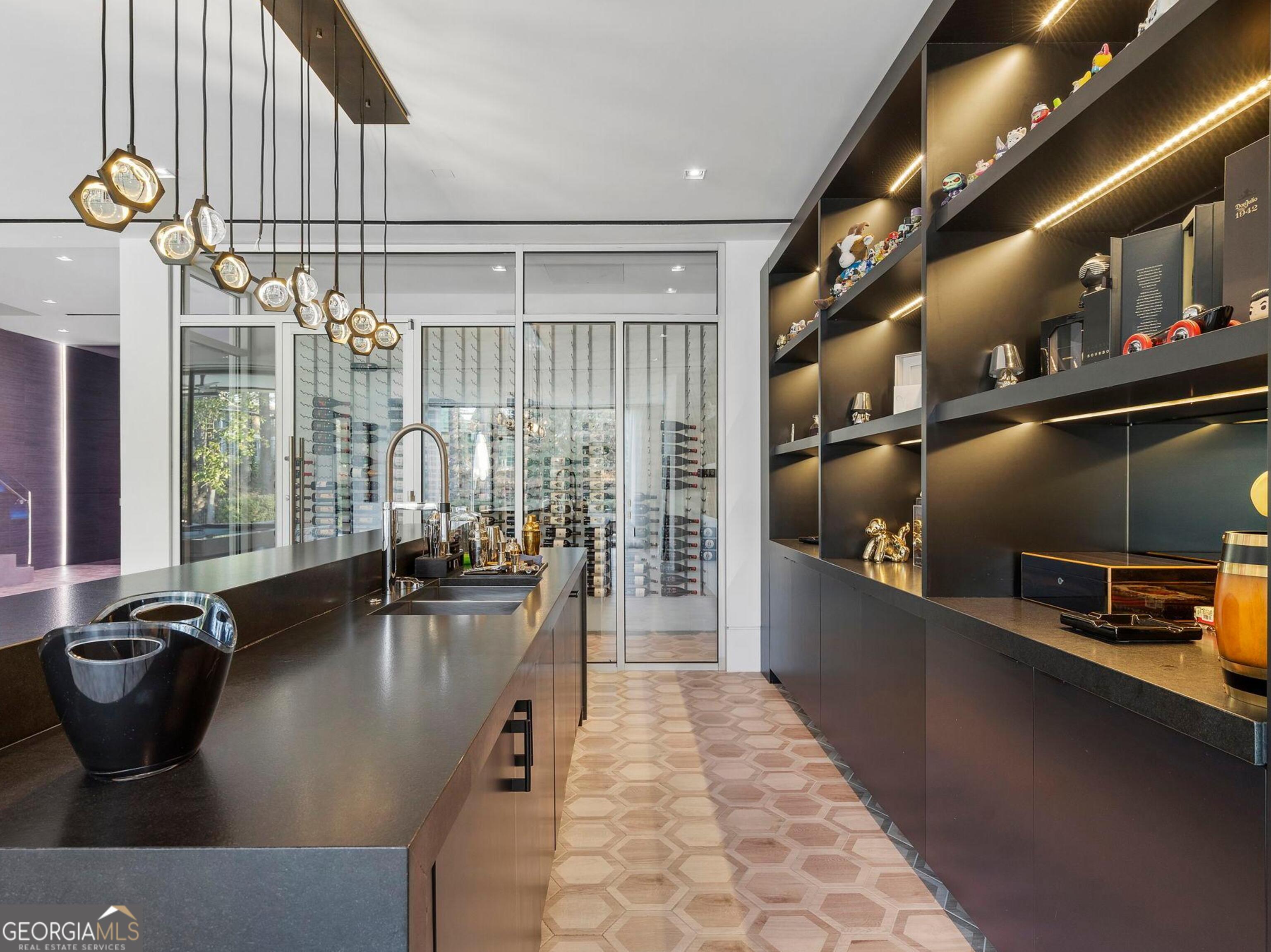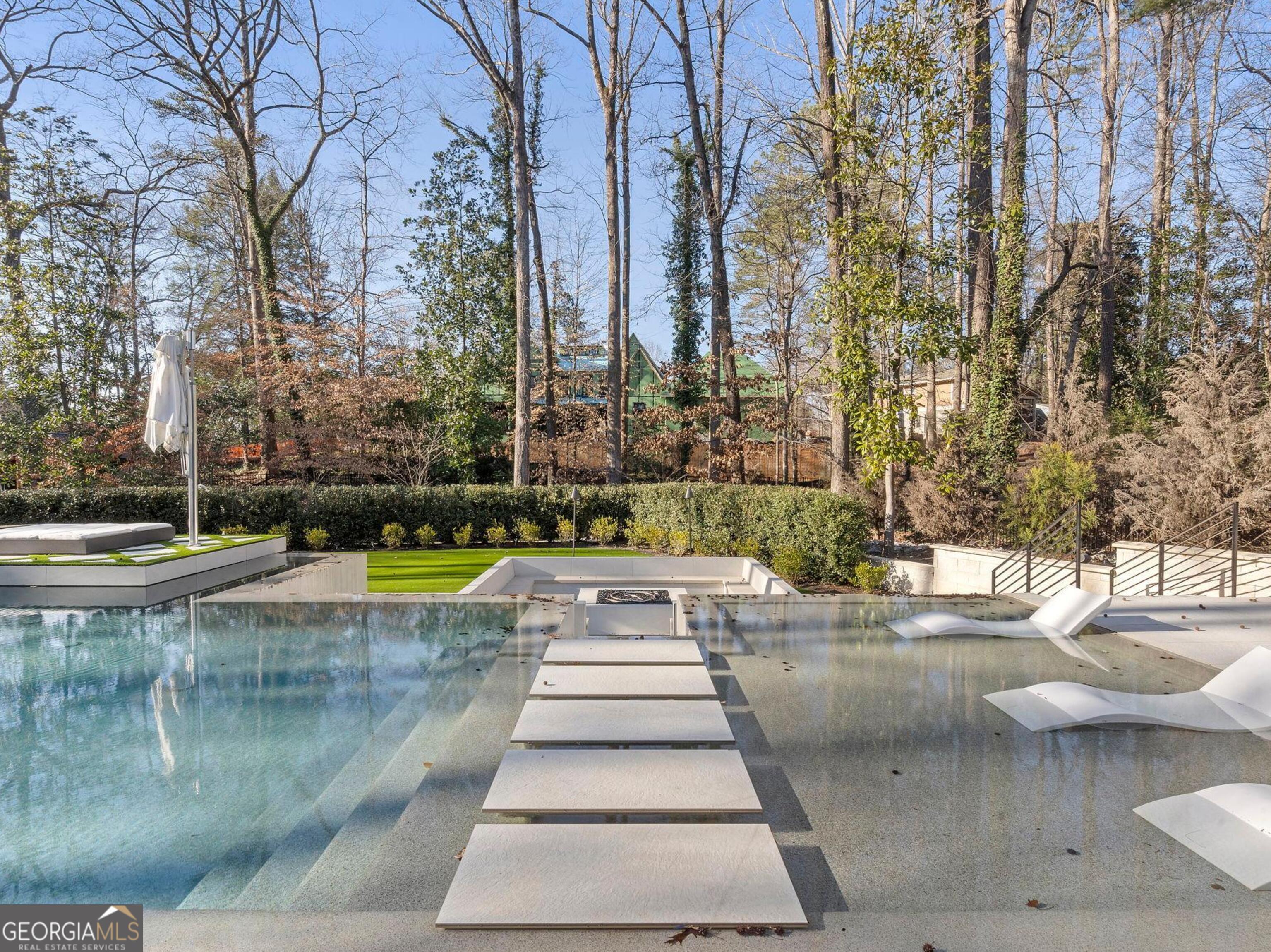 Interior photos this week! Privately gated and enveloped by mature trees, this newly constructed contemporary estate, completed in 2024, offers a rare combination of architectural distinction, total privacy, and resort-level living-just minutes from the heart of Sandy Springs and 15 minutes to Buckhead and the best of Atlanta. Set beyond the gates and elevated on a gentle rise, the residence makes a striking first impression with clean modern lines and a sophisticated blend of stone, stucco, metal, and warm walnut accents. Walls of glass and soaring 12-foot ceilings on the main and terrace level create an immediate sense of volume and light, seamlessly connecting the interiors to serene wooded views and outdoor living spaces. Starting with the dramatic walnut pivot entry door to steel floating staircases, illuminated reverse tray ceilings, 8-foot doors, and 5 inch bleached hardwood flooring installed onsite, custom stone and designer tile walls, every finish reflects a commitment to refined modern craftsmanship. The main level is anchored by a showpiece chef's kitchen designed for both performance and presentation. Premium appliances, double marble waterfall islands, expansive prep space, custom floor-to-ceiling cabinetry, and a concealed walk in pantry create a space equally suited for intimate dinners or large-scale entertaining. Living and dining areas flow effortlessly through oversized glass pocket doors to covered outdoor entertaining overlooking the pool. The terrace level is a true destination-an entertainer's retreat designed to rival a private members club. This level offers a full theater, game and arcade areas, sophisticated entertainment bars, a temperature-controlled glass wine room, a gym overlooking the pool, sauna, and versatile flex spaces ideal for hosting, working, or creative pursuits. Every detail is designed for immersive entertaining and effortless gatherings. The dream primary suite with fireplace, study space, rooftop deck and gardens that overlook the pool. Imagine an incredible marble spa bath with double shower, plenty of storage and separate dressing rooms. Outdoors, the estate unfolds into a private resort experience. An infinity-style pool with waterfalls, spa, tanning ledges, and floating walkways anchors the landscape, complemented by turfed golf practice areas, a sports court, enhanced decking, multiple Zen terraces, and a discreet enclosed dog area. The grounds are finished with maintenance-free turf, ensuring year-round beauty and ease of ownership. The home is fully automated for modern living, featuring Lutron lighting, integrated sound, automated gates, a backup generator, and seamless connectivity throughout. Convenient access to top schools, major highways, hospitals, dining, shopping, parks, and trails ensures privacy without compromise. This is more than a residence-it is a resort-caliber sanctuary crafted for those who appreciate exceptional design, thoughtful engineering, and the art of entertaining at the highest level.