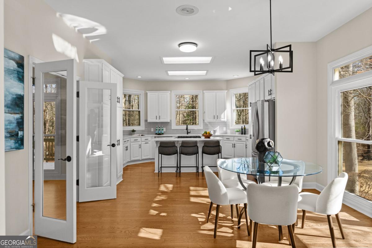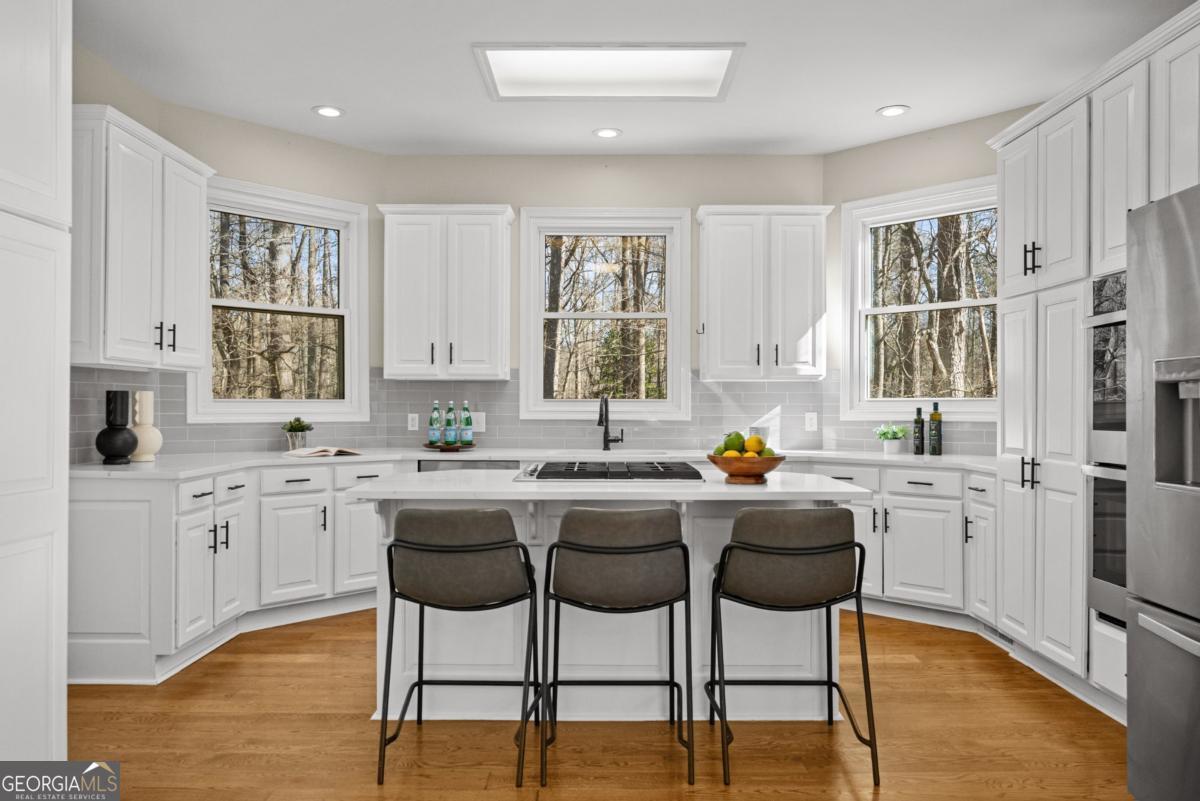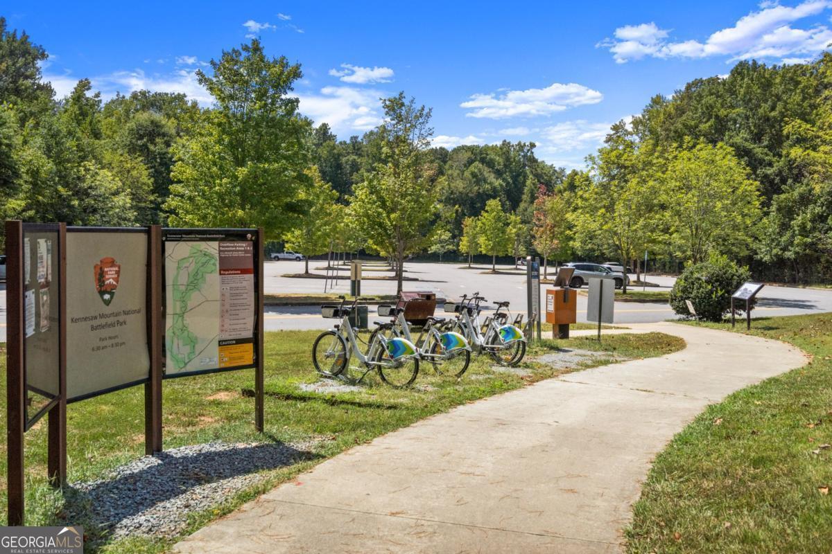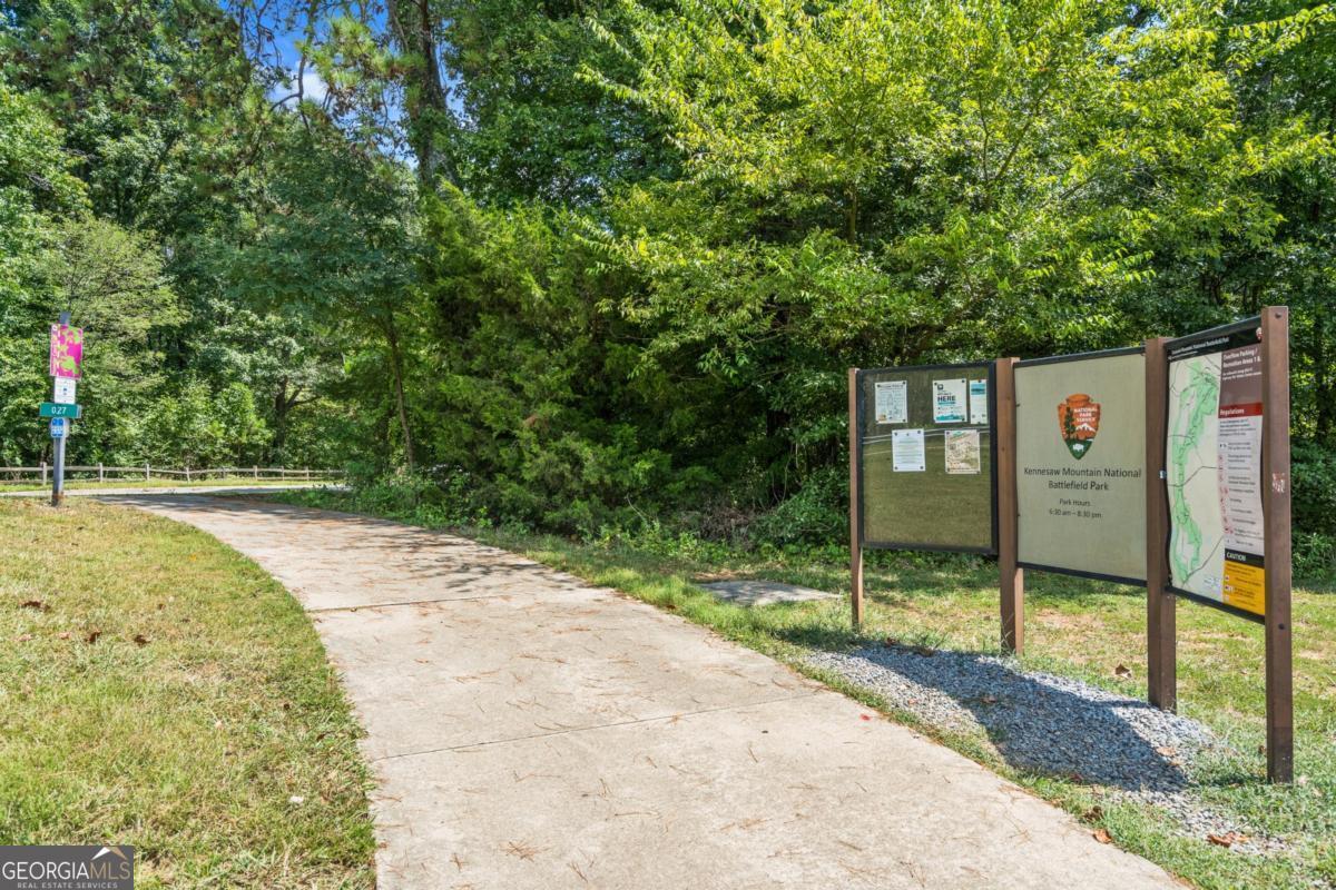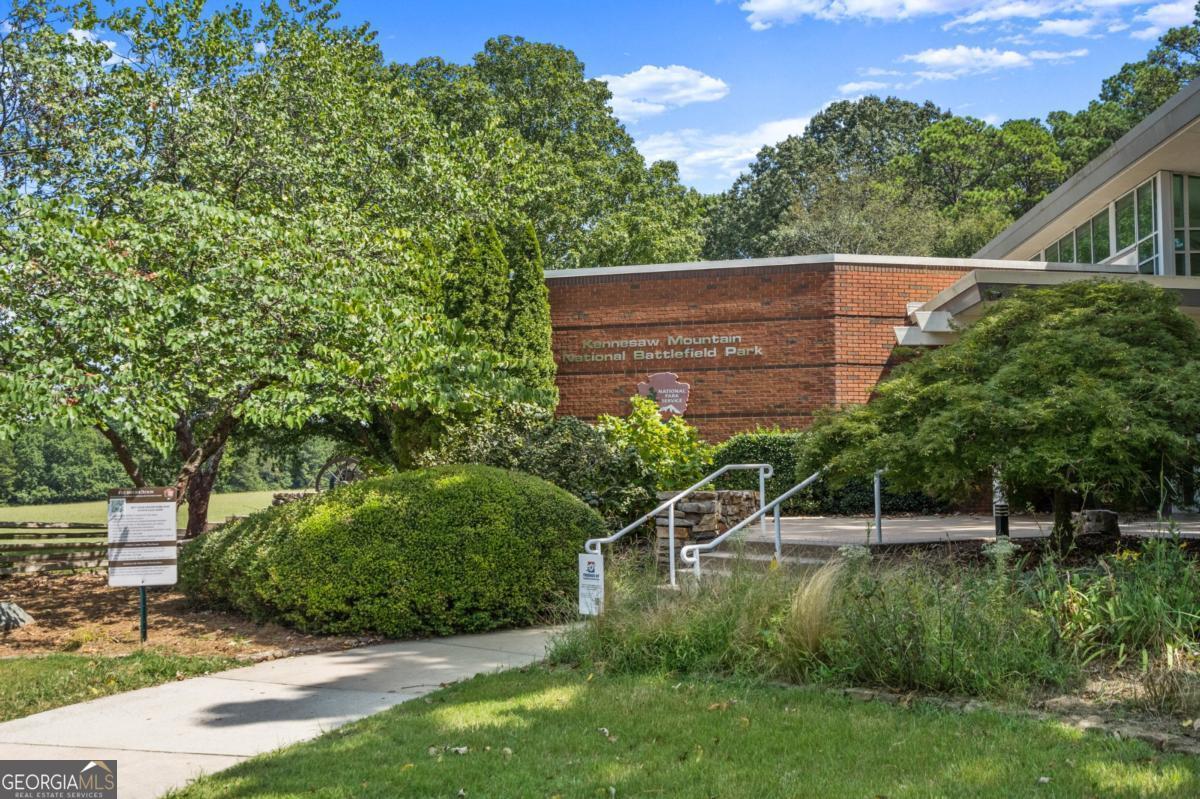 Wake up to protected forest views, peaceful wildlife, and miles of scenic trails just steps from your backyard. This exceptional ranch home directly borders Kennesaw Mountain National Battlefield Park, offering a level of privacy, serenity, and long-term value that simply cannot be replicated. Designed as a spacious ranch-over-basement, the home delivers effortless living with thoughtful flexibility for entertaining, remote work, and multi-generational living. The main level features three current bedrooms and three full baths, highlighted by a luxurious owner's retreat. The expansive primary suite offers a private sitting area, a cozy fireplace anchored by custom built-ins, and a vaulted flex space currently used as an office that could easily be converted back to serve as a forth bedroom. Direct access to the oversized deck allows you to enjoy peaceful mornings and sunset views surrounded by nature. The spa-inspired ensuite bath features a frameless tiled shower, a soaking tub, dual vanities, and elegant quartz finishes. The updated kitchen anchors the home with quartz countertops, a subway tile backsplash, and generous workspace. It flows seamlessly into the vaulted family room with a fireplace, creating an inviting environment for both daily living and entertaining. Outdoor living shines on the oversized deck overlooking protected parkland. This space is ideal for gatherings, quiet evenings, and taking in the sights and sounds of nature. The finished terrace level offers private exterior access with two bedrooms and a full bath, along with a dedicated private movie theater for an elevated entertainment experience. Plumbing is already in place for a future kitchenette, making this level well suited for an in-law suite, guest quarters, or an income-producing apartment. Over 1,800 square feet of additional unfinished storage, access to a third bay garage, and a well-equipped workshop further enhance the home's functionality and versatility. Major updates include a newer roof, 50% of the windows have been updated with the remaining windows ordered to be installed, whole-house water filtration, and recently serviced ductwork. These improvements provide peace of mind for years to come. The property is also located within a desirable swim and tennis community, offering access to a community clubhouse-ideal for hosting small gatherings and private events. The location offers exceptional convenience with proximity to top public and private schools, including Hillgrove High School and Mt. Paran Christian School. Enjoy easy access to Kennesaw Mountain Park, Marietta Square, and The Avenue West Cobb for shopping, dining, and entertainment. Quick connectivity to I-75 and surrounding commuter corridors makes daily travel effortless. This is more than a home. It's a lifestyle defined by permanent natural beauty, refined comfort, resort-style amenities, and unmatched accessibility in one of West Cobb's most desirable settings.