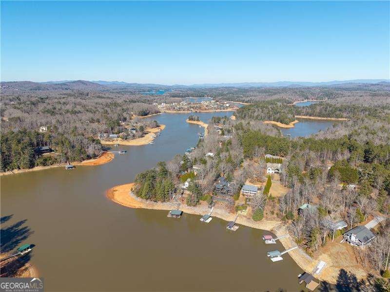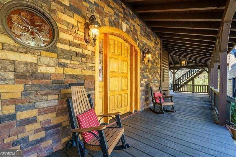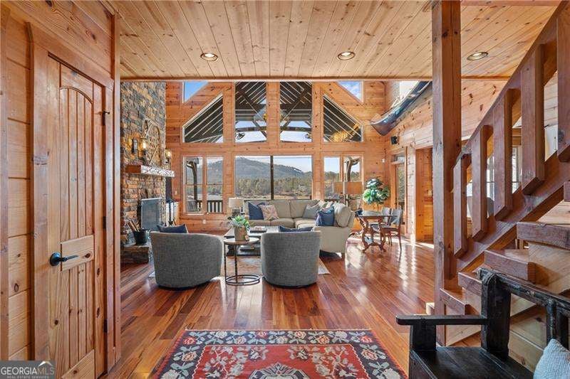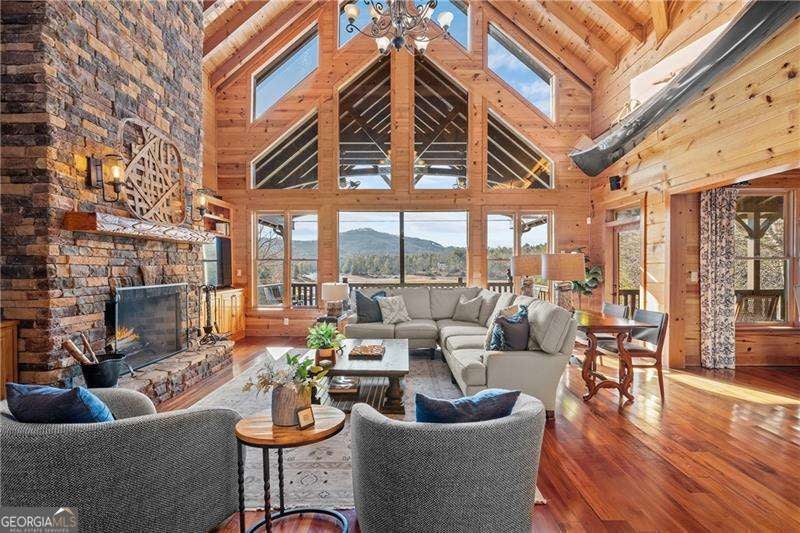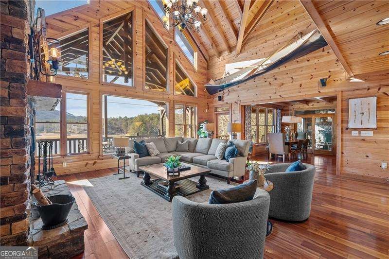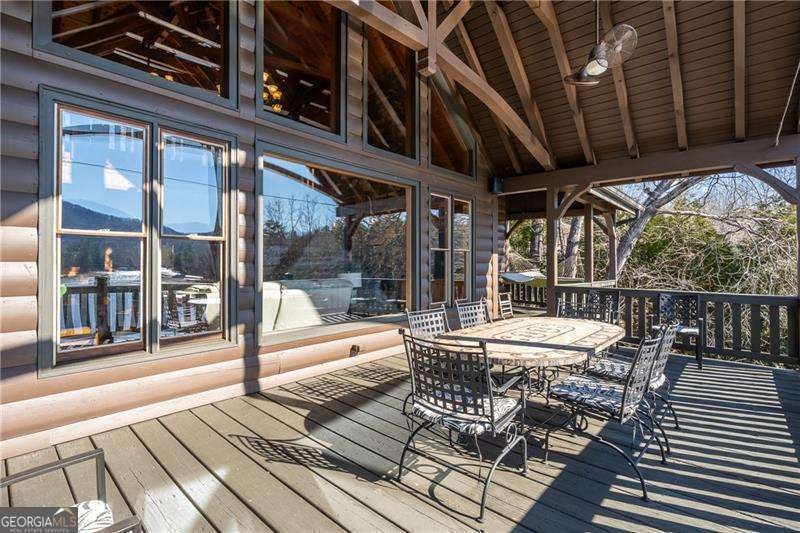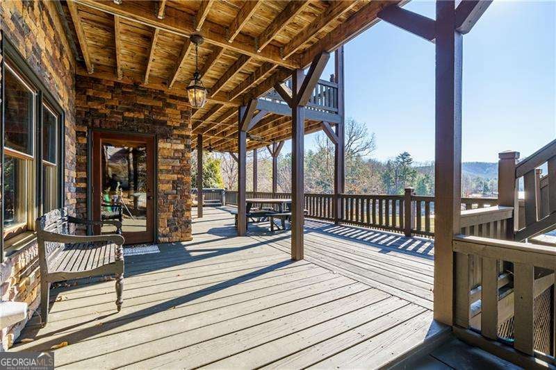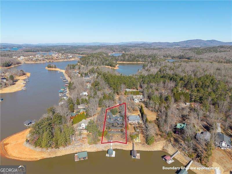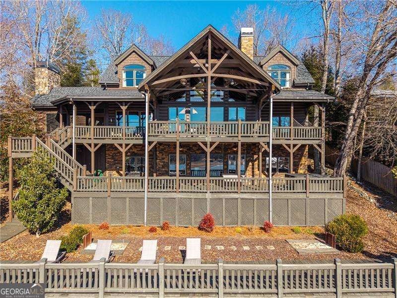 Experience elegant & sophisticated living on Lake Nottley, complemented by the stunning scenery of the Blue Ridge Mountains. This exceptional residence showcases log construction both inside & out, exemplifying rustic elegance. One of the most remarkable features of this property is its panoramic lake views. Whether relaxing in the living area, preparing meals in the kitchen or unwinding in the bedroom the beauty of the lake can be enjoyed from every room in the home. Throughout the main & upper levels, you will find vaulted, beamed, soaring ceilings that create an open & airy atmosphere. The two-story Great Room is a highlight of the home, featuring a striking wall of windows that allows abundant natural light to flood the space with breathtaking lake & mountain views. A stone wood-burning fireplace with custom built-in cabinetry adds warmth & charm to the living area. An open concept floor plan enhances the flow between living spaces, ideal for entertaining & family gatherings. The Gourmet kitchen cabinets finished with custom paint, leathered granite countertops & stainless-steel appliances make this perfect for culinary enthusiasts. The primary suite, conveniently located on the main level, provides ease of access & privacy. The main home offers five spacious bedrooms & five 1/2 bathrooms; each bedroom is ensuite, providing comfort & privacy for guests & family alike. The terrace level with a secondary living area, fireplace with built-in cabinetry & wet bar equipped with an ice maker & mini frig, is perfect for entertaining. The hot tub on the terrace level deck offers tranquil lake views, creating a relaxing retreat. Two expansive levels of covered wrap around porches span the length of the home, providing multiple vantage points for panoramic mountain & lake views. A screened porch, complete with a stone fireplace, offers a cozy space for year-round enjoyment & taking in the surrounding scenery. The newly finished suite above the garage with a private entrance offers an oversized great room, bedroom with bunks & double beds & a full bath. With over 5,000 square feet of living space, there is ample room for everyone. The property features a covered boat dock with deck space, a boat lift & jet ski dock, ensuring deep water lake access. Some recent upgrades include a new roof & fresh exterior paint for enhanced durability & curb appeal. This exceptional home features an extensive array of additional upgrades. Sold fully furnished with high-end furniture & linens for a turnkey experience. This home beautifully combines the rustic charm of log construction with every modern convenience. Its thoughtful design & premium amenities allow residents & guests to enjoy the best of mountain & lake living in comfort & style. This home is not just a residence- it's a mountain & lake sanctuary!