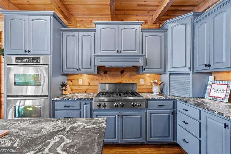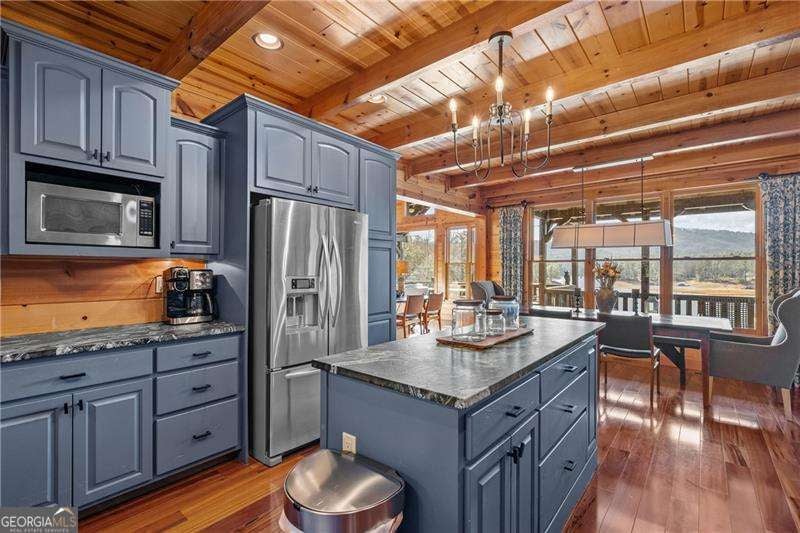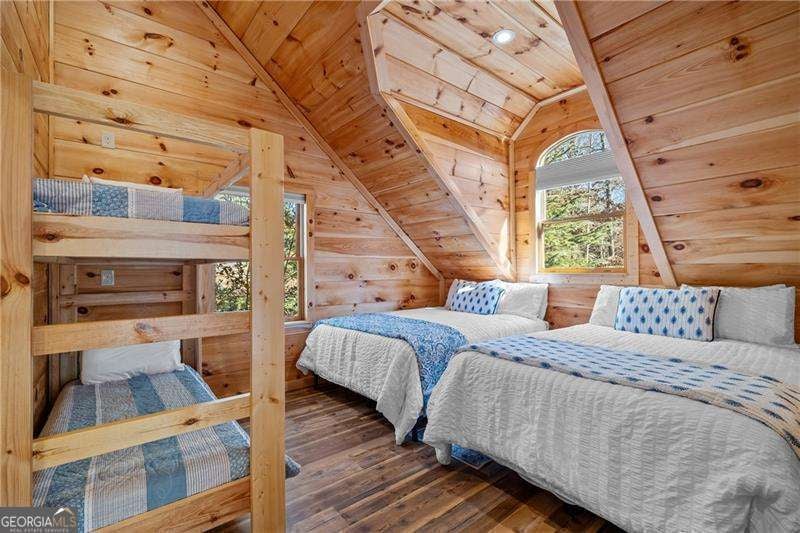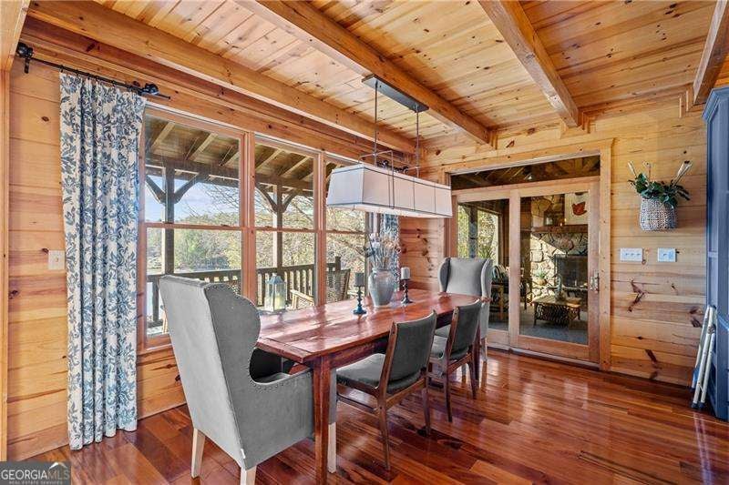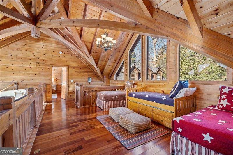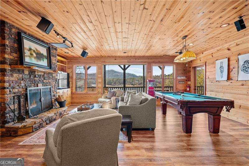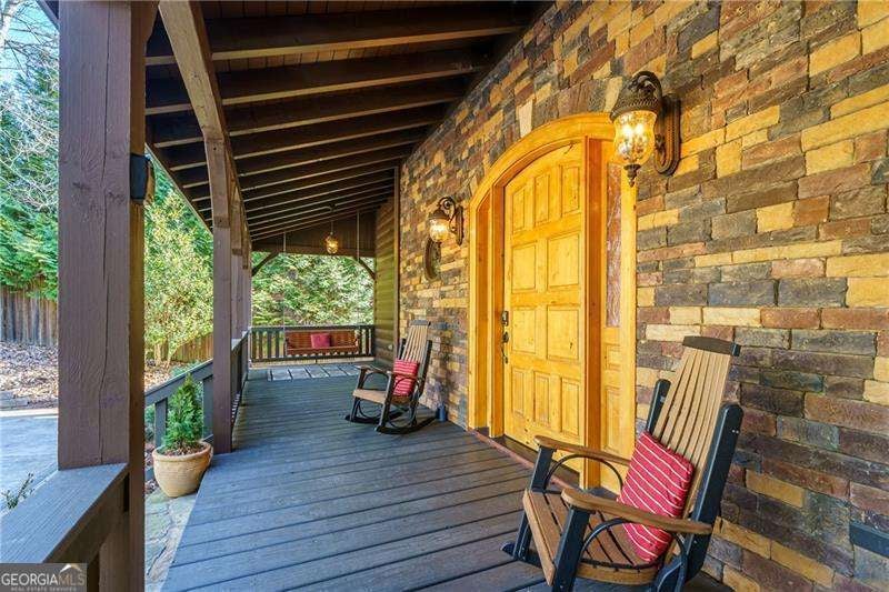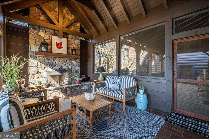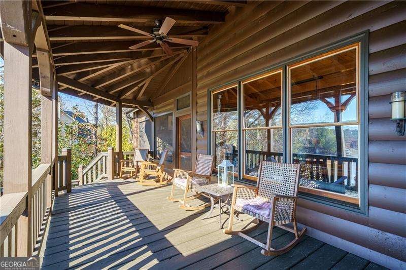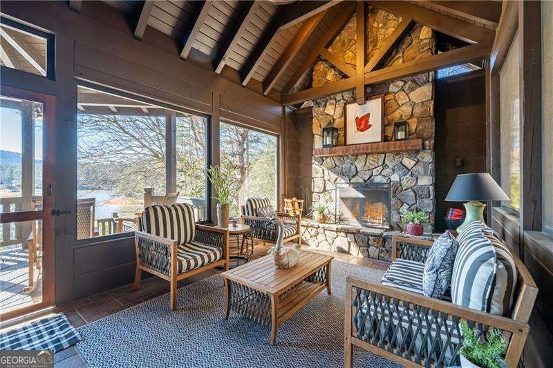 Experience elegant & sophisticated living on Lake Nottley, complemented by the stunning scenery of the Blue Ridge Mountains. This exceptional residence showcases log construction both inside & out, exemplifying rustic elegance. One of the most remarkable features of this property is its panoramic lake views. Whether relaxing in the living area, preparing meals in the kitchen or unwinding in the bedroom the beauty of the lake can be enjoyed from every room in the home. Throughout the main & upper levels, you will find vaulted, beamed, soaring ceilings that create an open & airy atmosphere. The two-story Great Room is a highlight of the home, featuring a striking wall of windows that allows abundant natural light to flood the space with breathtaking lake & mountain views. A stone wood-burning fireplace with custom built-in cabinetry adds warmth & charm to the living area. An open concept floor plan enhances the flow between living spaces, ideal for entertaining & family gatherings. The Gourmet kitchen cabinets finished with custom paint, leathered granite countertops & stainless-steel appliances make this perfect for culinary enthusiasts. The primary suite, conveniently located on the main level, provides ease of access & privacy. The main home offers five spacious bedrooms & five 1/2 bathrooms; each bedroom is ensuite, providing comfort & privacy for guests & family alike. The terrace level with a secondary living area, fireplace with built-in cabinetry & wet bar equipped with an ice maker & mini frig, is perfect for entertaining. The hot tub on the terrace level deck offers tranquil lake views, creating a relaxing retreat. Two expansive levels of covered wrap around porches span the length of the home, providing multiple vantage points for panoramic mountain & lake views. A screened porch, complete with a stone fireplace, offers a cozy space for year-round enjoyment & taking in the surrounding scenery. The newly finished suite above the garage with a private entrance offers an oversized great room, bedroom with bunks & double beds & a full bath. With over 5,000 square feet of living space, there is ample room for everyone. The property features a covered boat dock with deck space, a boat lift & jet ski dock, ensuring deep water lake access. Some recent upgrades include a new roof & fresh exterior paint for enhanced durability & curb appeal. This exceptional home features an extensive array of additional upgrades. Sold fully furnished with high-end furniture & linens for a turnkey experience. This home beautifully combines the rustic charm of log construction with every modern convenience. Its thoughtful design & premium amenities allow residents & guests to enjoy the best of mountain & lake living in comfort & style. This home is not just a residence- it's a mountain & lake sanctuary!