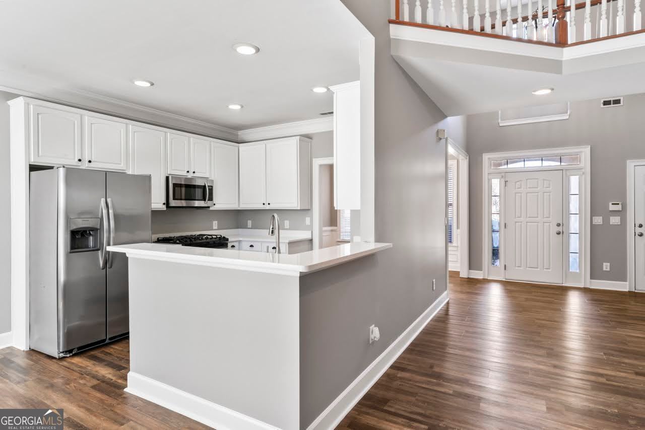 Charming Southern-style home located in Eagle's Brooke gated community, offering an ideal blend of comfort, style, and lifestyle. Enjoy mornings on the inviting covered front porch and evenings in the fireside family room with a dramatic two-story overlook staircase that is perfect for everyday living and entertaining. This open-concept floor plan features fresh interior paint throughout, new carpet, new quartz countertops, and extensive trim. The chef's kitchen opens seamlessly to the main living areas, making gatherings effortless. The spacious primary suite on the main level offers a relaxing sitting area and a spa-like bath, creating a private retreat. An additional secondary bedroom is also located on the main floor, providing flexible living options. Upstairs, you'll find two additional bedrooms plus a large bonus room or optional fifth bedroom, ideal for a home office, media room, or guest space. Step outside to a private backyard with patio, perfect for entertaining, grilling, or unwinding after work. Eagle's Brooke residents enjoy community amenities such as a zero-entry pool with waterslide, Olympic-style lap pool, playground, and neighborhood events. Convenient access to I-75, schools, shopping, dining, and everyday services makes this location especially appealing.