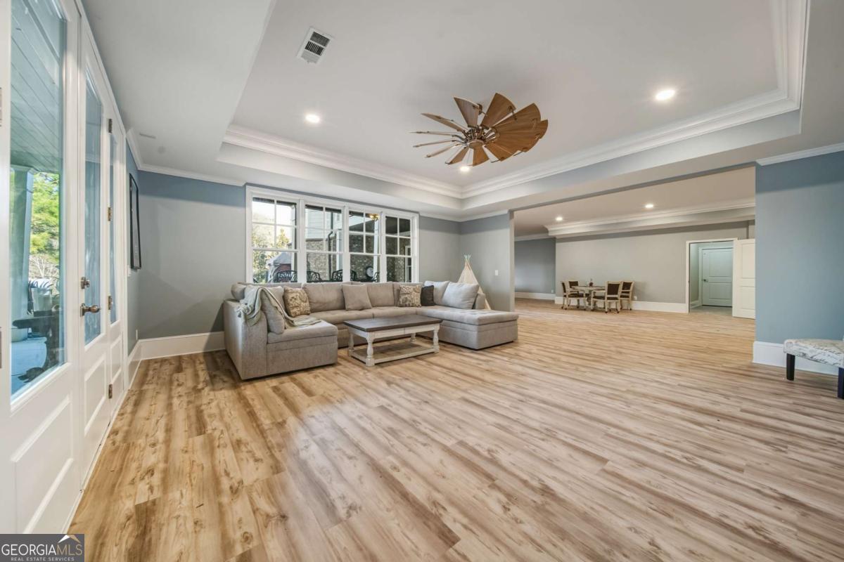 Experience the perfect blend of modern luxury, thoughtful custom design, and true accessibility in this exceptional estate on 1.89 acres-complete with a NEW ROOF and located inside a private gated community. Meticulously crafted with 3-sided brick construction and ADA-compliant features, this home offers elevated living across three beautifully designed levels, all accessible by private elevator. From the moment you step into the grand foyer, you'll feel the sophistication and warmth that defines this residence. The main level features a formal dining room, gracious living room, and convenient powder room, opening into an expansive open-concept layout ideal for entertaining and everyday living. The chef's kitchen is a showstopper, featuring a 5-burner gas cooktop with pot filler, oversized refrigerator and freezer, double wall ovens, built-in microwave, generous breakfast bar, and seamless flow into the bright breakfast area with a wet bar and wine refrigerator. Anchoring the heart of the home is the stunning great room with a beamed cathedral ceiling, custom built-in shelving and storage, and a cozy gas fireplace. A walk-in pantry, spacious laundry room, and oversized mudroom provide effortless function with direct access to the three-car garages and outdoor living spaces. The main-level owner's suite is a private retreat with tray ceilings, sitting area, and a spa-inspired bath featuring dual vanities, zero entry shower, soaking tub, and a large walk-in closet with california closets inspired organization. A dedicated office sits conveniently nearby, and an additional main-level ensuite bedroom completes this level. Natural light pours throughout the home and extends onto the expansive covered deck overlooking your private backyard oasis-featuring a sparkling saltwater PebbleTec pool and soothing hot tub. Upstairs, you'll find four spacious bedrooms, including two bedrooms connected by a Jack-and-Jill bath with shower/tub, bidet, and a unique U-shaped walk-through closet. A third ensuite bedroom, a fourth bedroom with built-in bookshelves, a bonus/flex space, and a second laundry room provide comfort and convenience for everyone. The fully finished terrace level is next-level impressive-designed for ultimate entertaining and wellness with a private home theater, wet bar, luxury fitness room, and a relaxing sauna. With flexible space for game nights, hosting, or multi-generational living, this level truly elevates the lifestyle experience. Step outside to an expansive covered patio and enjoy the resort-style setting, all within a securely fenced backyard built for both fun and privacy. This home is the rare combination of luxury, accessibility, and custom functionality-a true one-of-a-kind opportunity.