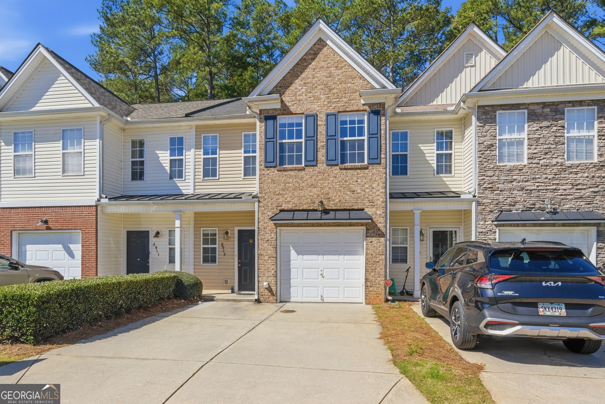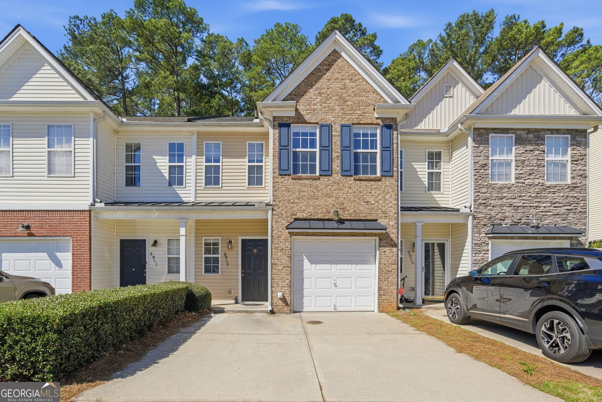 New stainless steel appliances, new countertops, new floors!! Be the first to enjoy a killer upgrade. Perfectly positioned near Halcyon, The Collection at Forsyth, The Greenway, Fowler Park, golf courses, and quick access to top-rated schools, healthcare, grocery stores, shopping, dining, and year-round entertainment. All just minutes away! This cozy townhome offers convenience and low-maintenance living. A covered front porch and brick accent peak, complemented by a one-car garage and attached driveway for easy parking. Inside, the family room features a classic fireplace and mantel. Decorative column detailing leads into the eat-in kitchen with a pantry and open view to the family room, creating a comfortable, connected layout. Freshly painted upper level where you'll find two spacious vaulted primary suites, each with French doors leading to private en suite bathrooms (with new flooring) perfect for roommates, guests, or a dual-owner setup. The laundry room is conveniently located upstairs near the bedrooms for everyday ease. Step outside to a private patio with a wooded backdrop and a wood fence partition offering extra privacy. Yard maintenance and trash service are included, giving you a truly low-maintenance lifestyle. Residents also enjoy a community walking trail that winds around a peaceful pond with a water feature and pergola seating area. The perfect spot to relax or take an evening stroll. Experience the ideal combination of comfort, convenience, and community in this thoughtfully designed Forsyth townhome!