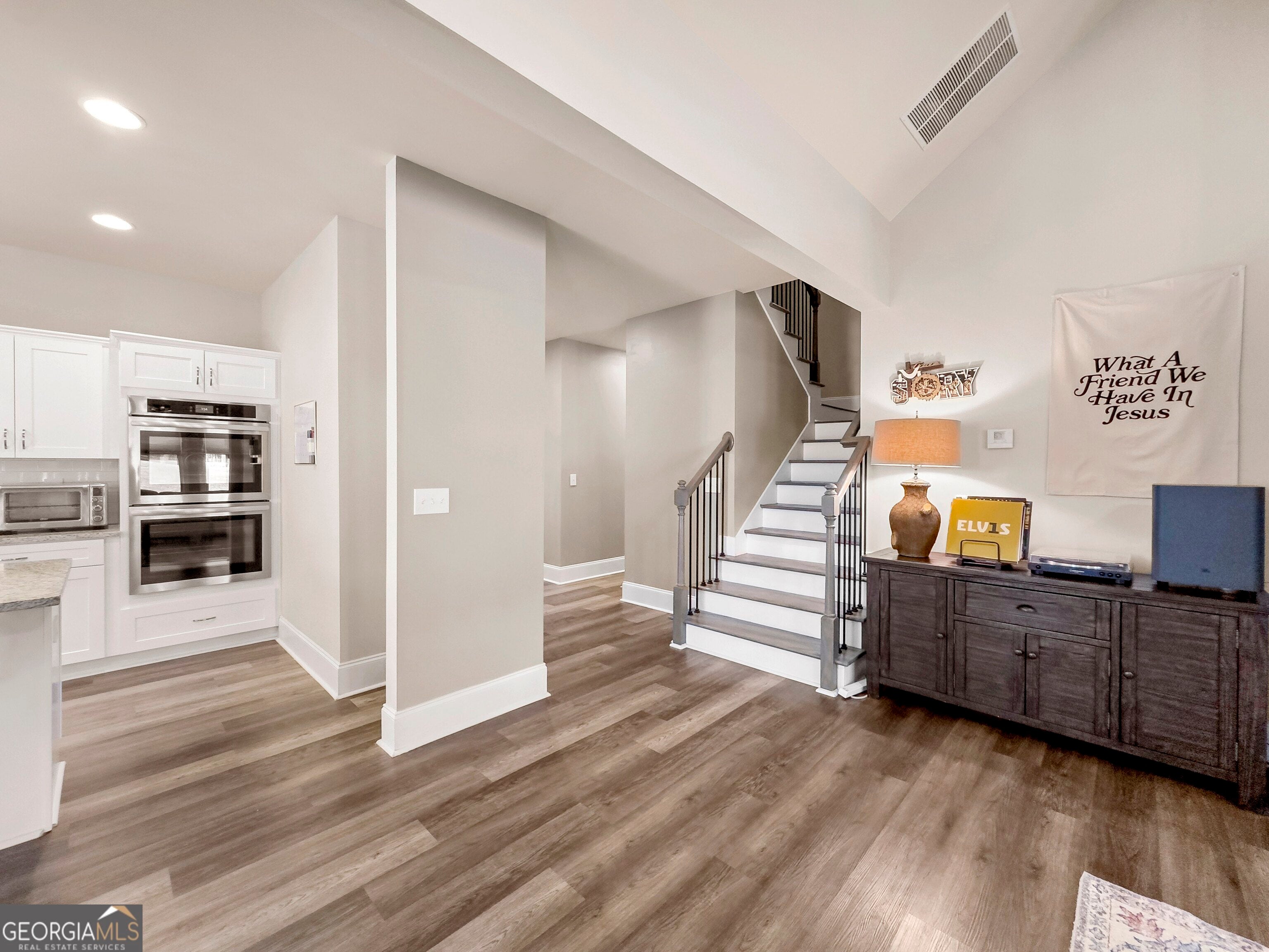 Beautiful Locust Grove home in a sidewalk neighborhood with a gourmet kitchen! Enjoy a large island, built-in double ovens, microwave, and plenty of counter space. The open floor plan features soaring ceilings, a fireside great room, and wood-plank vinyl flooring throughout the entire home. Three bedrooms are on the main level, including the primary suite with double granite vanities, glass shower, soaking tub, and a walk-in closet with laundry access. Upstairs offers a private fourth bedroom with a sitting nook and full bath-perfect for guests, an office, or a game room. Relax on the covered back patio overlooking the large, fully fenced backyard. The side-entry two-car garage with epoxy floors adds the finishing touch. No HOA!