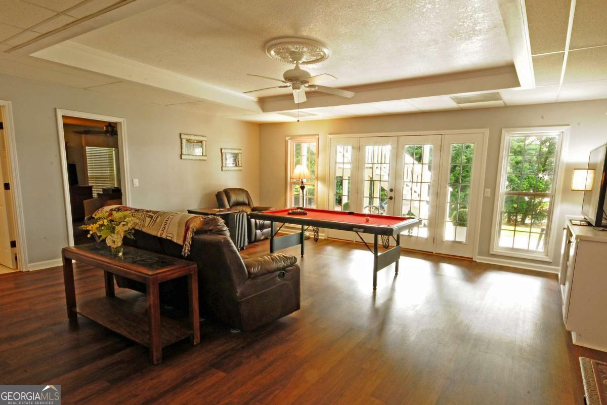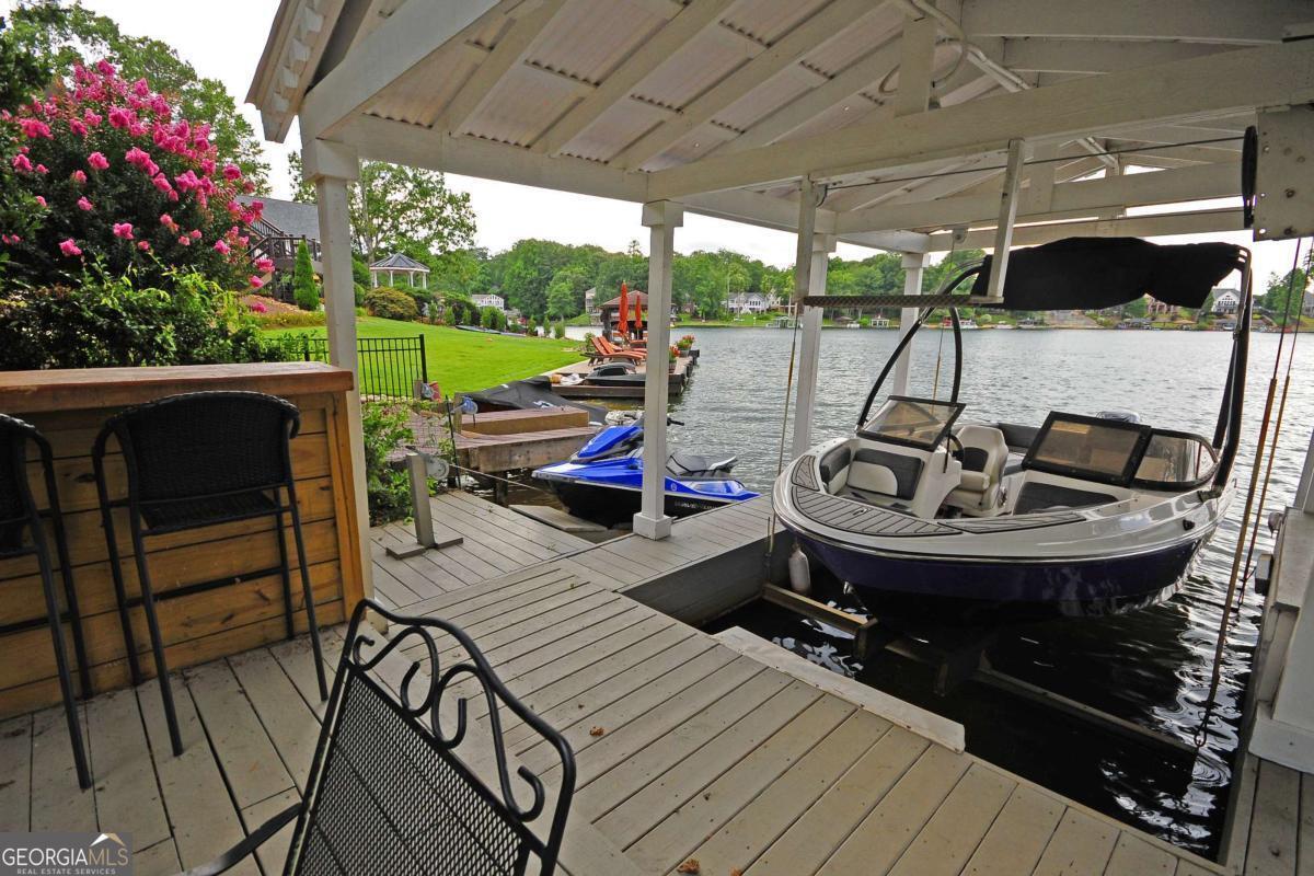 Lakefront Luxury Living! This immaculate open-concept ranch offers 4 spacious bedrooms, 2.5 bathrooms, and a fully finished basement, perfectly positioned for lakefront enjoyment. The main level features rich hardwood floors, a double-sided fireplace, and seamless layout ideal for entertaining. A gourmet kitchen awaits with premium countertops, large island cooktop, wall oven, wine chiller, and stainless-steel appliances. A spacious walk-in pantry provides exceptional storage and is a haven for organization. Meanwhile, the primary suite offers a tray ceiling and spa-style bath, complete with a separate tub and walk-in open shower. Downstairs, the finished basement includes a game room, second living space, workshop, and workout room for ultimate flexibility. Step outdoors to a massive deck overlooking the lake and a covered boat dock-ideal for lakeside leisure and entertaining. Located in a sought-after resort-style community offering 3 lakes, golf course, country club, tennis and pickleball courts, 2 pools, beach access, walking trails, recreation center, and 24/7 security. Convenient access to I-20 and Highway 166. Lake life awaits! Don't miss this opportunity to own a beautiful retreat in an amenity-rich neighborhood. Schedule your private showing today!