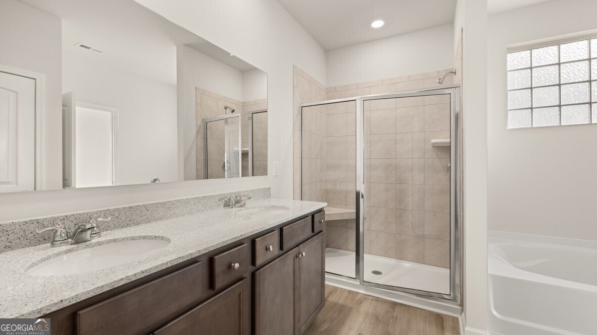 - Interior FeaturesDouble Vanity, High Ceilings, Separate Shower, Soaking Tub, Split Bedroom Plan, Walk-In Closet(s)