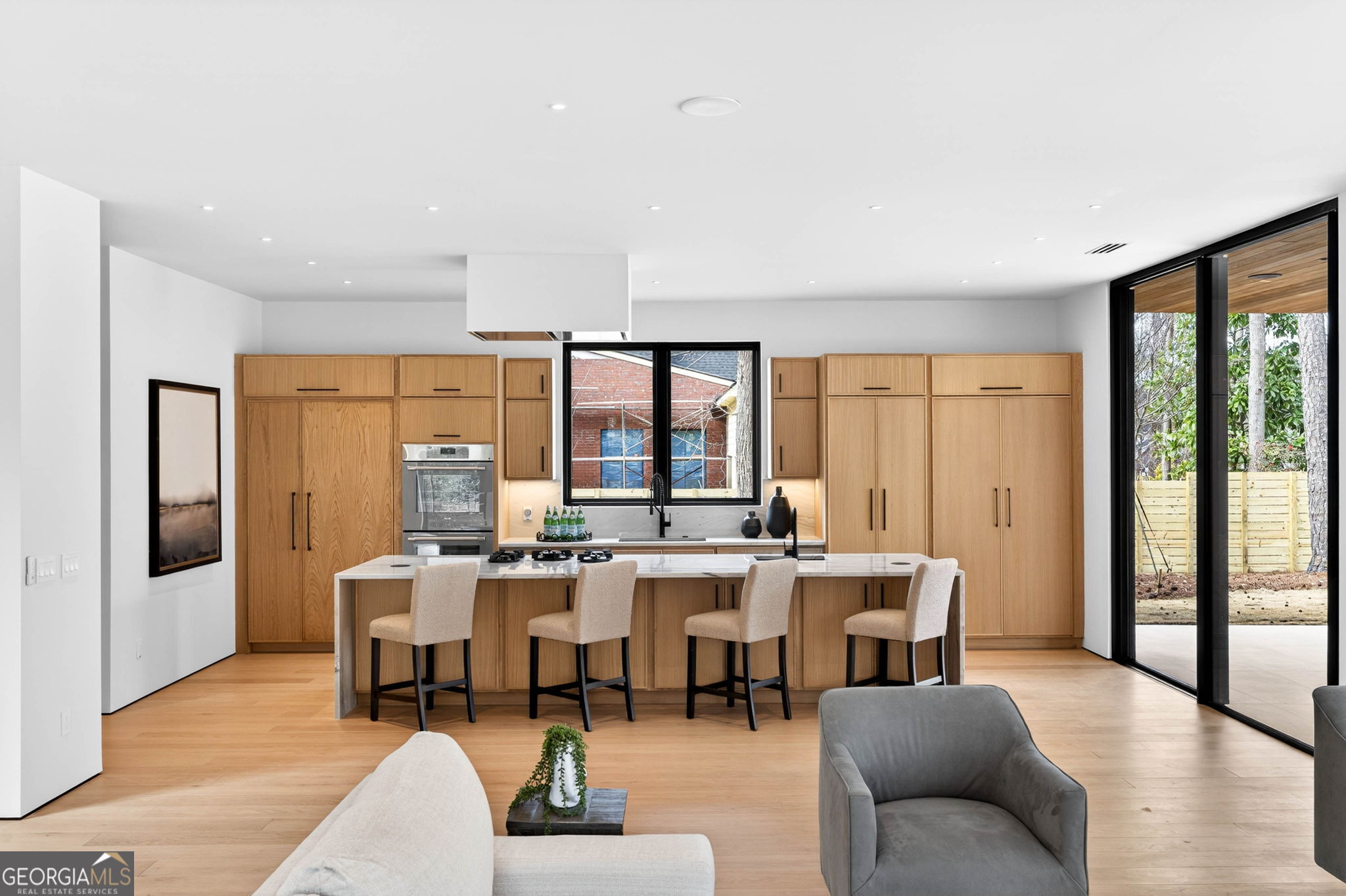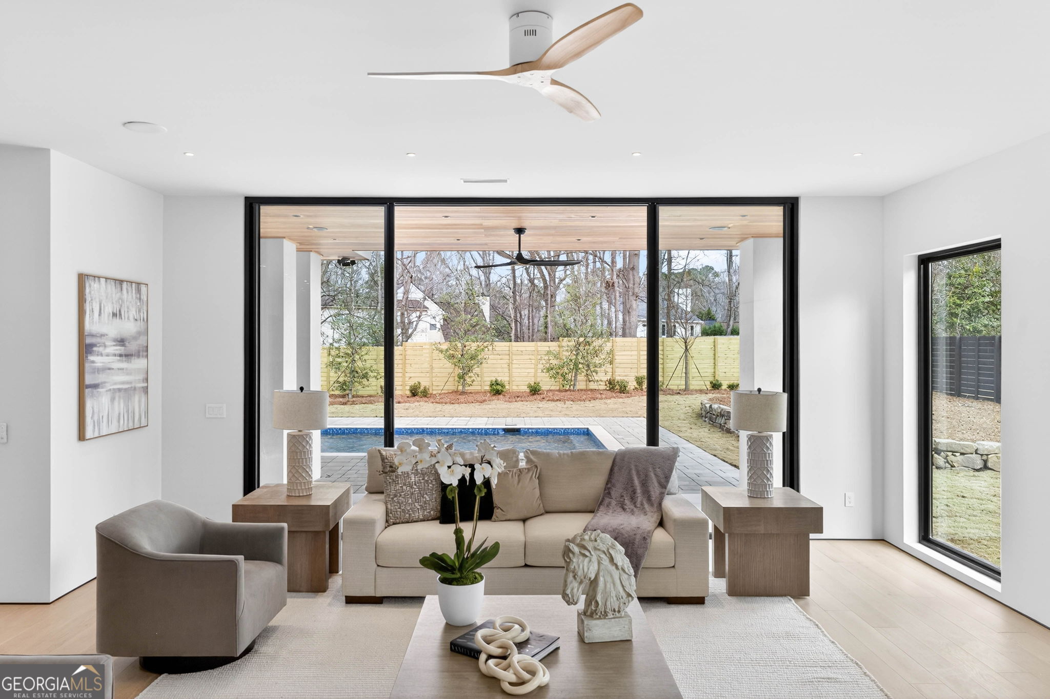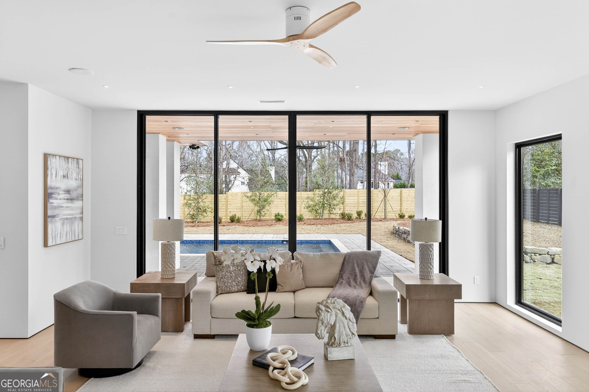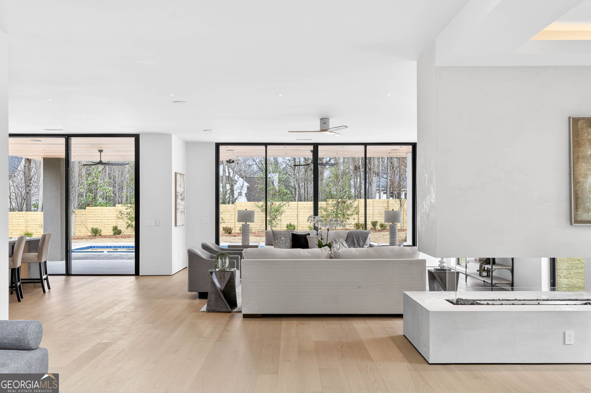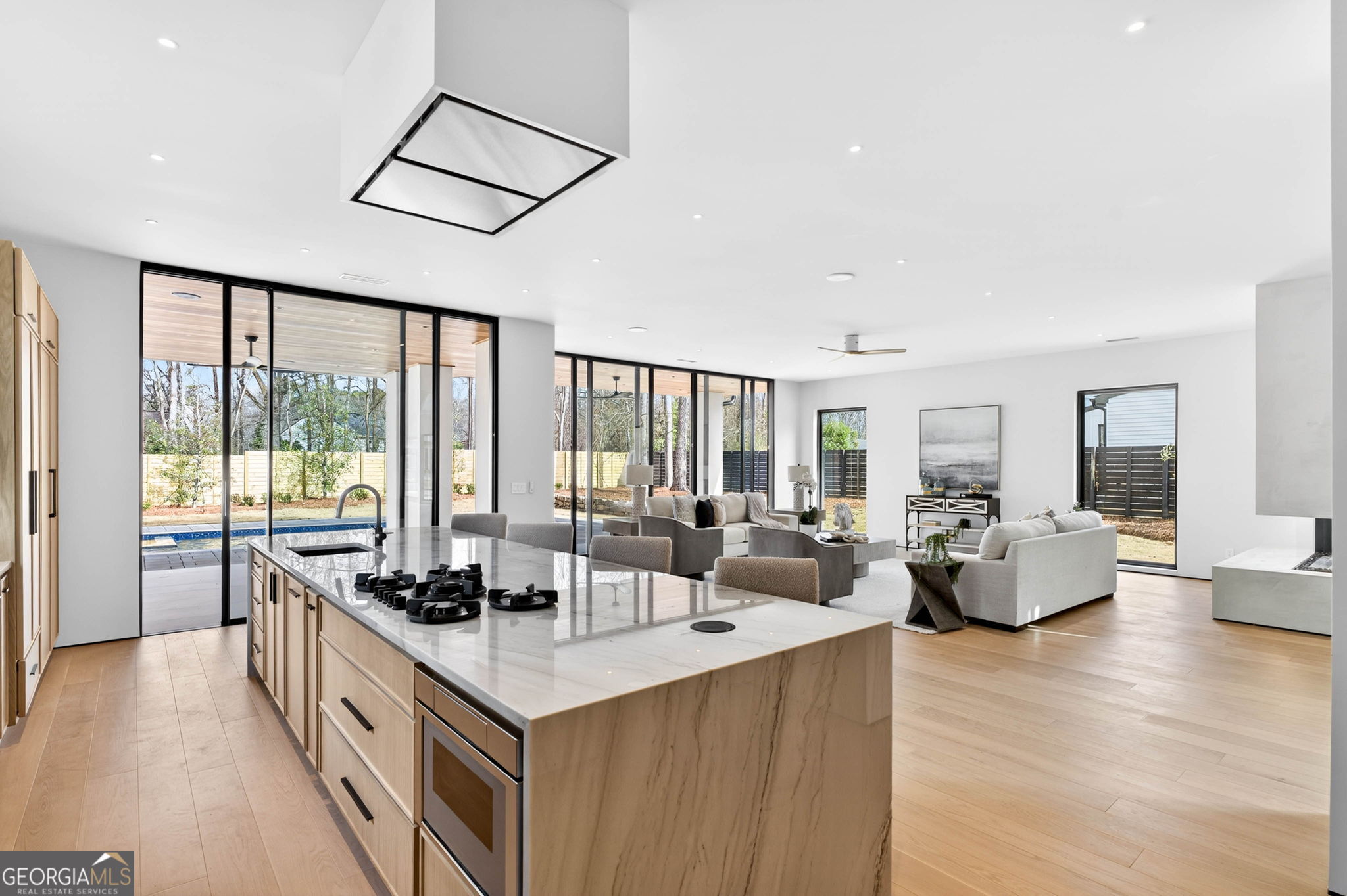 Discover unparalleled luxury in this stunning Alpharetta home, meticulously crafted to blend elegance with modern convenience. Cozy up and unwind by the distinctive 3-sided peninsula Bio-Ethanol fireplace that creates a warm, inviting ambiance. The gourmet kitchen showcases a premium Thermador Stainless Steel Appliance Suite, featuring a 48" Refrigerator/Freezer, Double Ovens, Microwave, Pitt Cooktop, and Dishwasher, all complemented by custom White Oak cabinetry and exquisite Bellagio Marble countertops that extend seamlessly into the spacious pantry. Storage is abundant with a large walk-in pantry and a functional scullery. Indulge in the refined beauty of Bianco Rhino Marble in the Primary Bath, Powder Room, and Secondary Baths, while the upper level Laundry Room boasts sleek Pure White Quartz countertops. Designed for both comfort and productivity, the home includes a main-level office complete with a full bathroom-ideal for remote work or guest accommodations. Throughout the home, designer backlit mirrors add a sophisticated glow. Organize effortlessly with custom closet systems in the Primary Bedroom and main-level office. Step outside to an inviting expansive patio with a gas connection for grilling, ideal for effortless entertaining. The highlight of the outdoor space is a stunning saltwater pool with a complete Pentair equipment package, a flush spa with therapeutic jets and two-sided spillover, as well as a 6' x 8' sun ledge with an integrated bubbler water feature. Additional highlights include private balconies off both the Master and secondary bedrooms, second floor skylights, a custom large front pivot door that makes a striking first impression, and a large package-receiving mailbox with wood facing that harmonizes with the house facade. Nestled in a prestigious Alpharetta community, this residence offers the perfect balance of serene suburban living and vibrant city amenities. Enjoy proximity to local shopping, diverse dining options in downtown Alpharetta, expansive parks, nature trails, and the upscale Avalon development with premier retail, dining, and entertainment. Convenient access to major highways ensures effortless commuting. Schedule your private tour today and step into a lifestyle defined by comfort, elegance, and convenience.