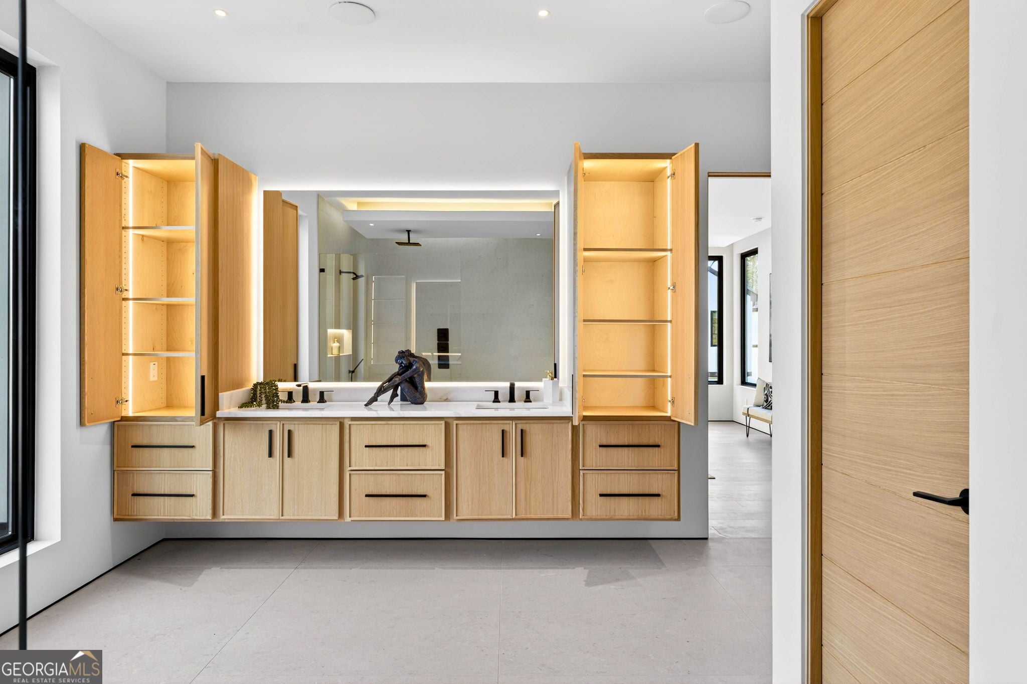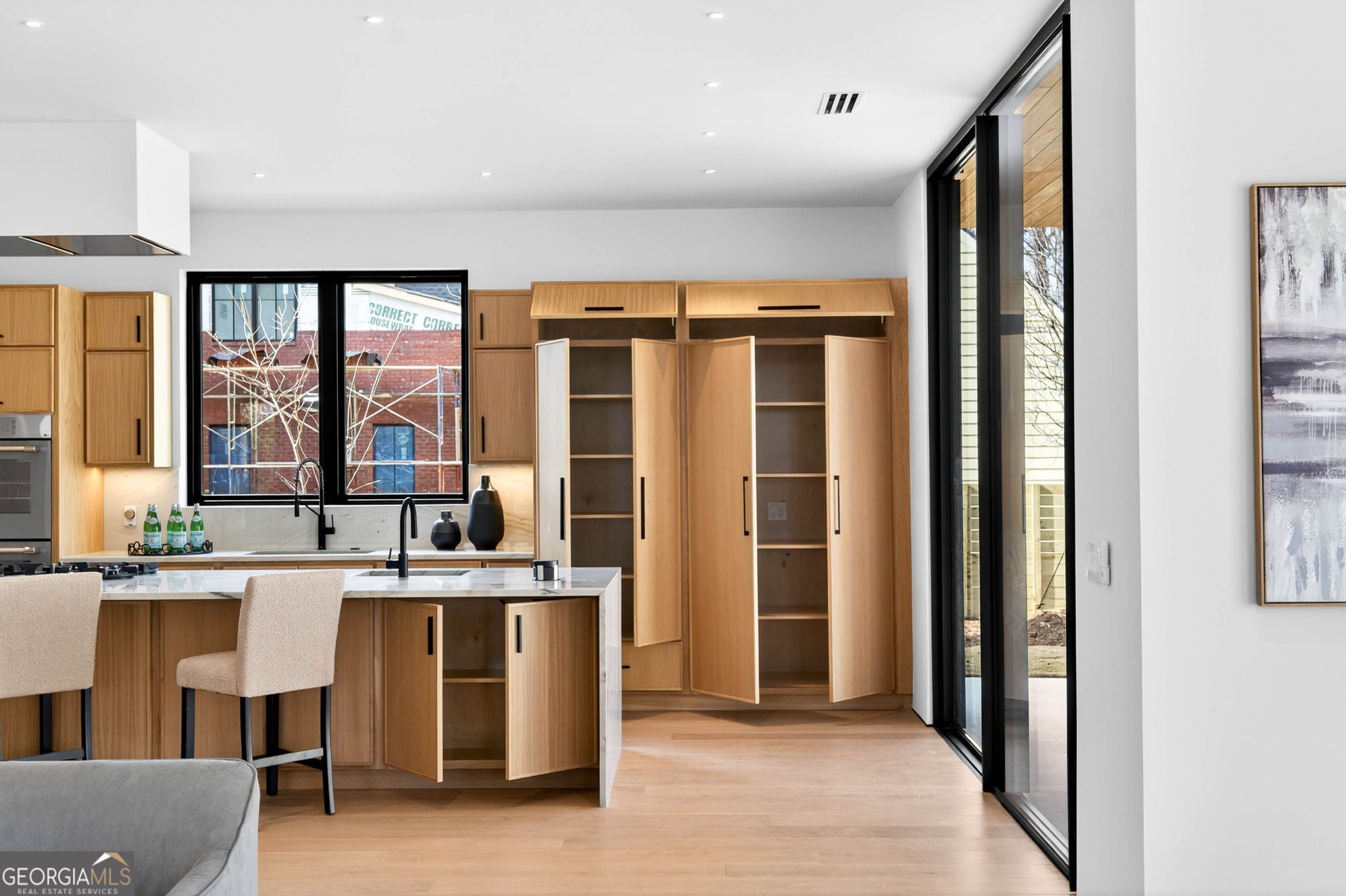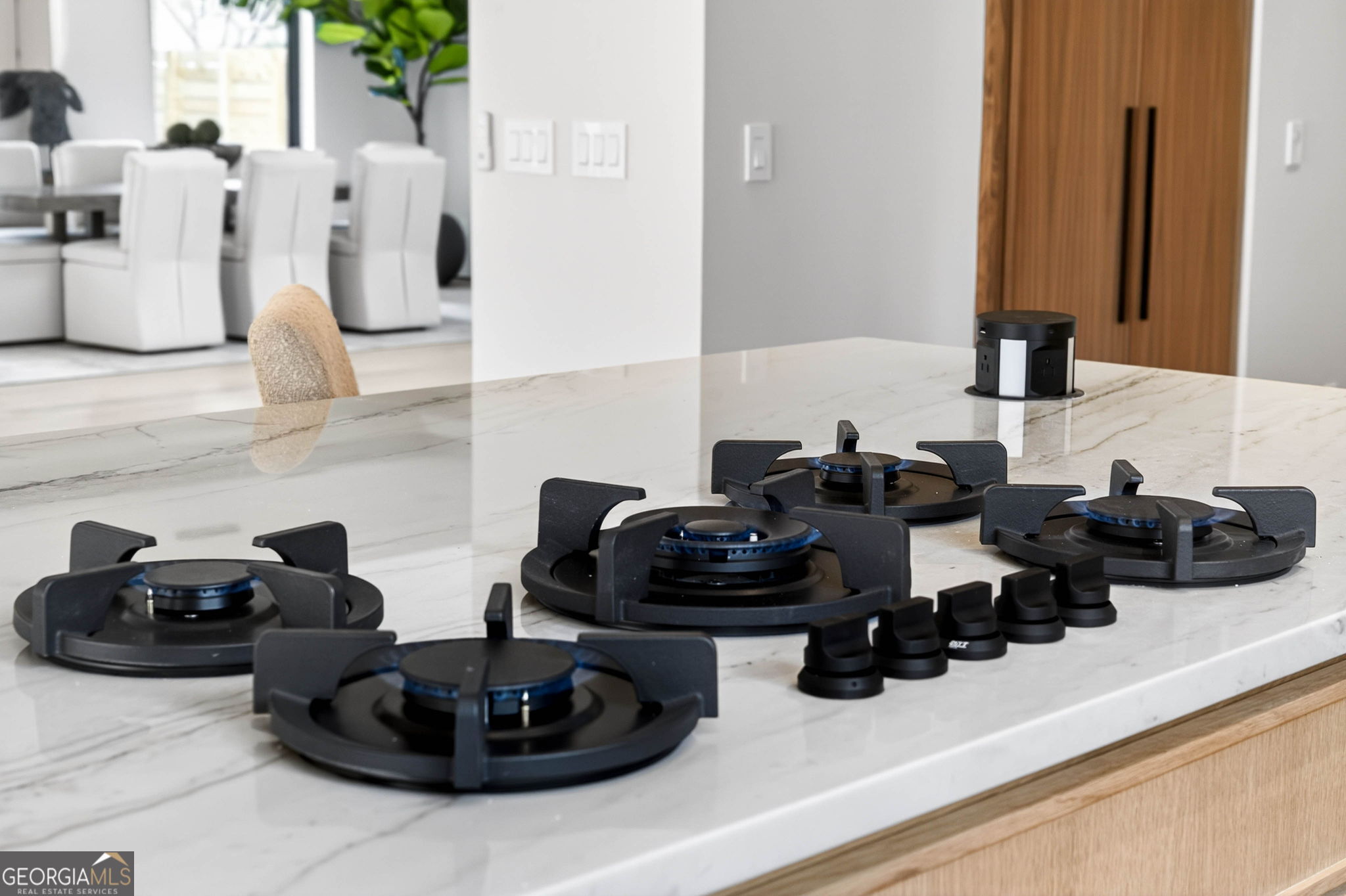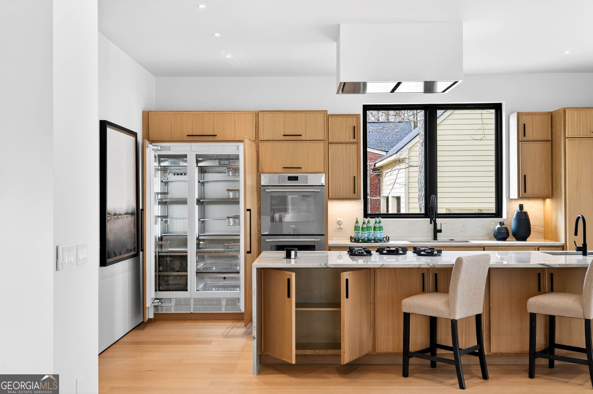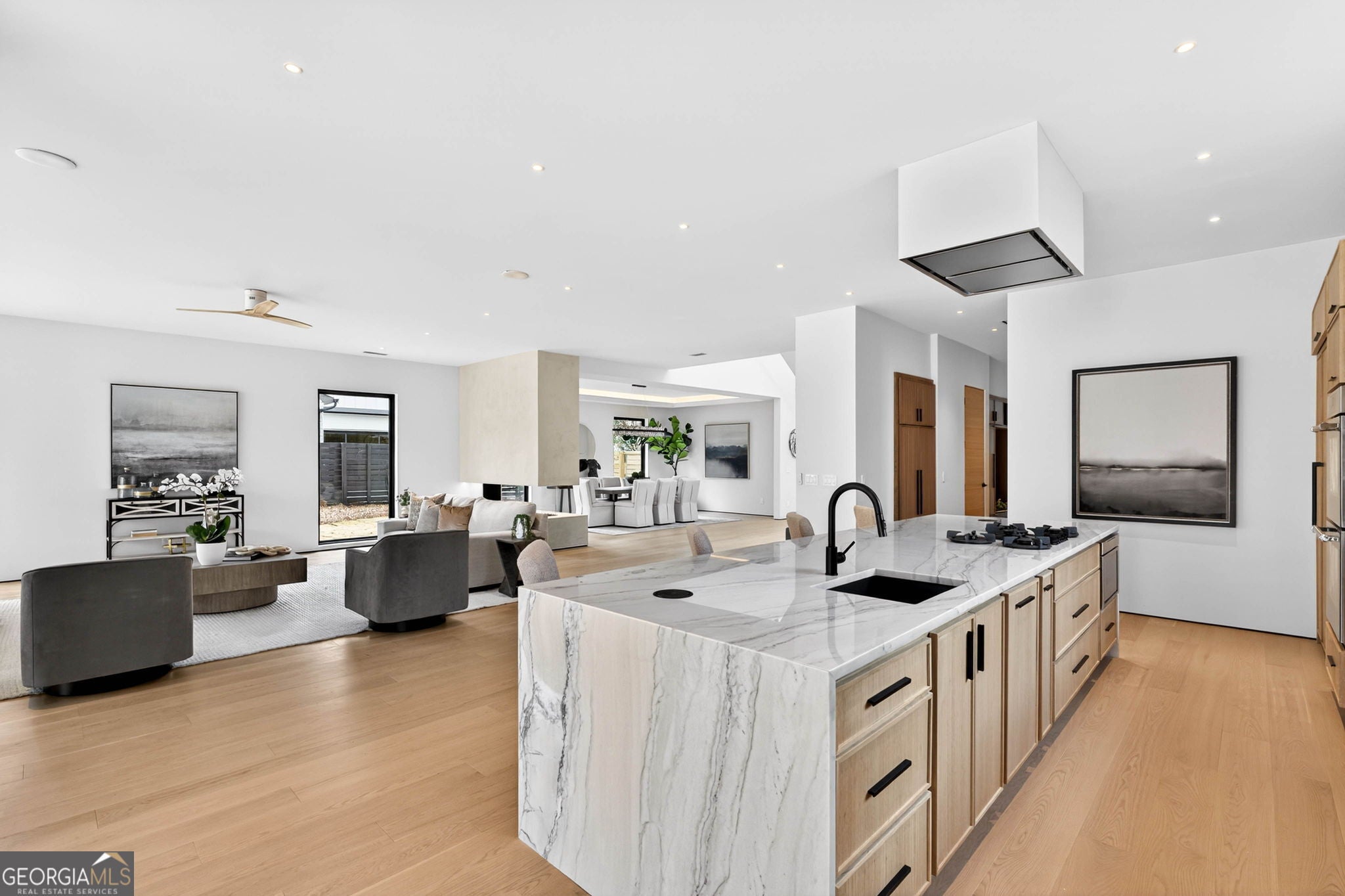Discover unparalleled luxury in this stunning Alpharetta home, meticulously crafted to blend elegance with modern convenience. Cozy up and unwind by the distinctive 3-sided peninsula Bio-Ethanol fireplace that creates a warm, inviting ambiance. The gourmet kitchen showcases a premium Thermador Stainless Steel Appliance Suite, featuring a 48" Refrigerator/Freezer, Double Ovens, Microwave, Pitt Cooktop, and Dishwasher, all complemented by custom White Oak cabinetry and exquisite Bellagio Marble countertops that extend seamlessly into the spacious pantry. Storage is abundant with a large walk-in pantry and a functional scullery. Indulge in the refined beauty of Bianco Rhino Marble in the Primary Bath, Powder Room, and Secondary Baths, while the upper level Laundry Room boasts sleek Pure White Quartz countertops. Designed for both comfort and productivity, the home includes a main-level office complete with a full bathroom-ideal for remote work or guest accommodations. Throughout the home, designer backlit mirrors add a sophisticated glow. Organize effortlessly with custom closet systems in the Primary Bedroom and main-level office. Step outside to an inviting expansive patio with a gas connection for grilling, ideal for effortless entertaining. The highlight of the outdoor space is a stunning saltwater pool with a complete Pentair equipment package, a flush spa with therapeutic jets and two-sided spillover, as well as a 6' x 8' sun ledge with an integrated bubbler water feature. Additional highlights include private balconies off both the Master and secondary bedrooms, second floor skylights, a custom large front pivot door that makes a striking first impression, and a large package-receiving mailbox with wood facing that harmonizes with the house facade. Nestled in a prestigious Alpharetta community, this residence offers the perfect balance of serene suburban living and vibrant city amenities. Enjoy proximity to local shopping, diverse dining options in downtown Alpharetta, expansive parks, nature trails, and the upscale Avalon development with premier retail, dining, and entertainment. Convenient access to major highways ensures effortless commuting. Schedule your private tour today and step into a lifestyle defined by comfort, elegance, and convenience.